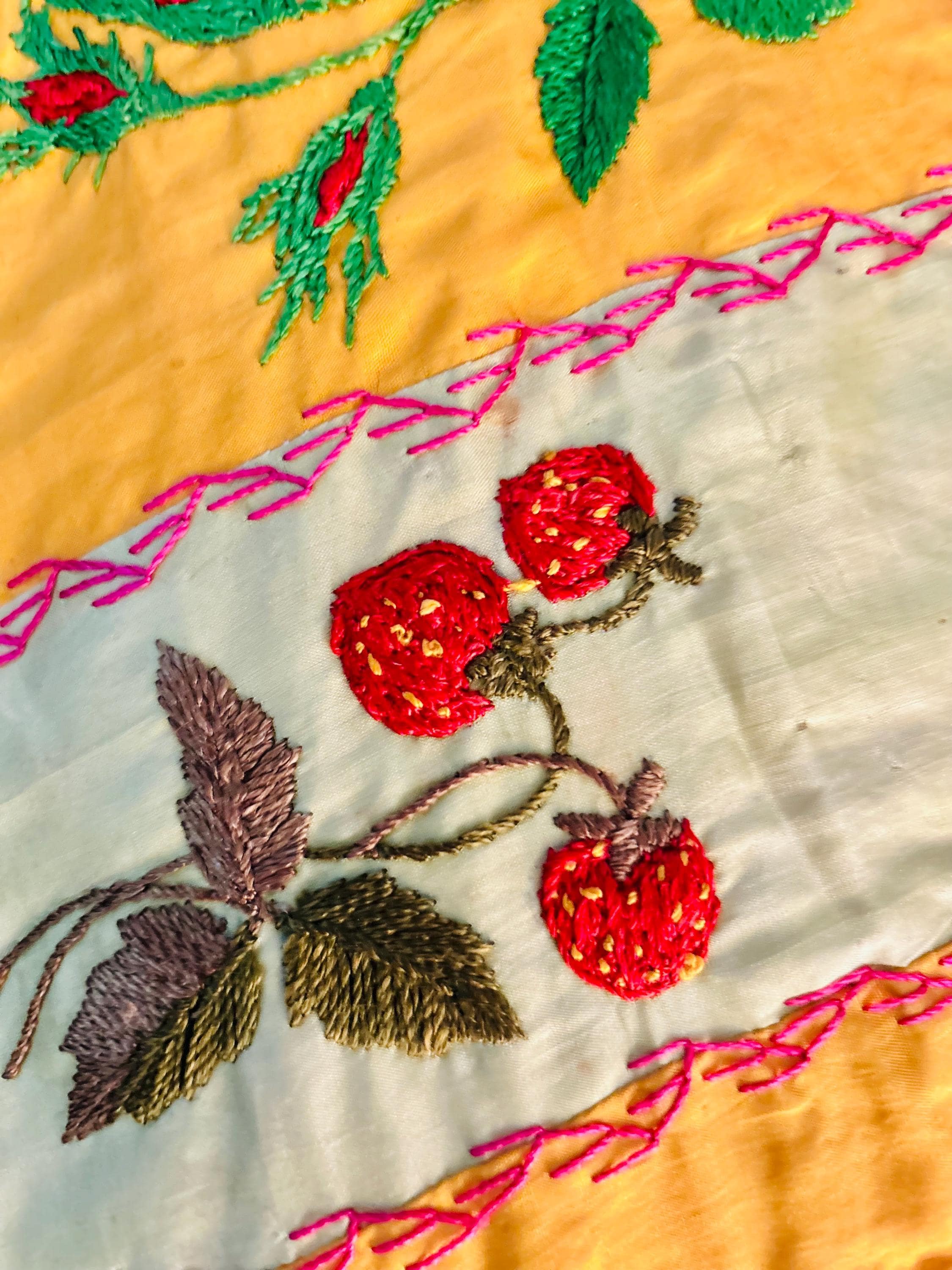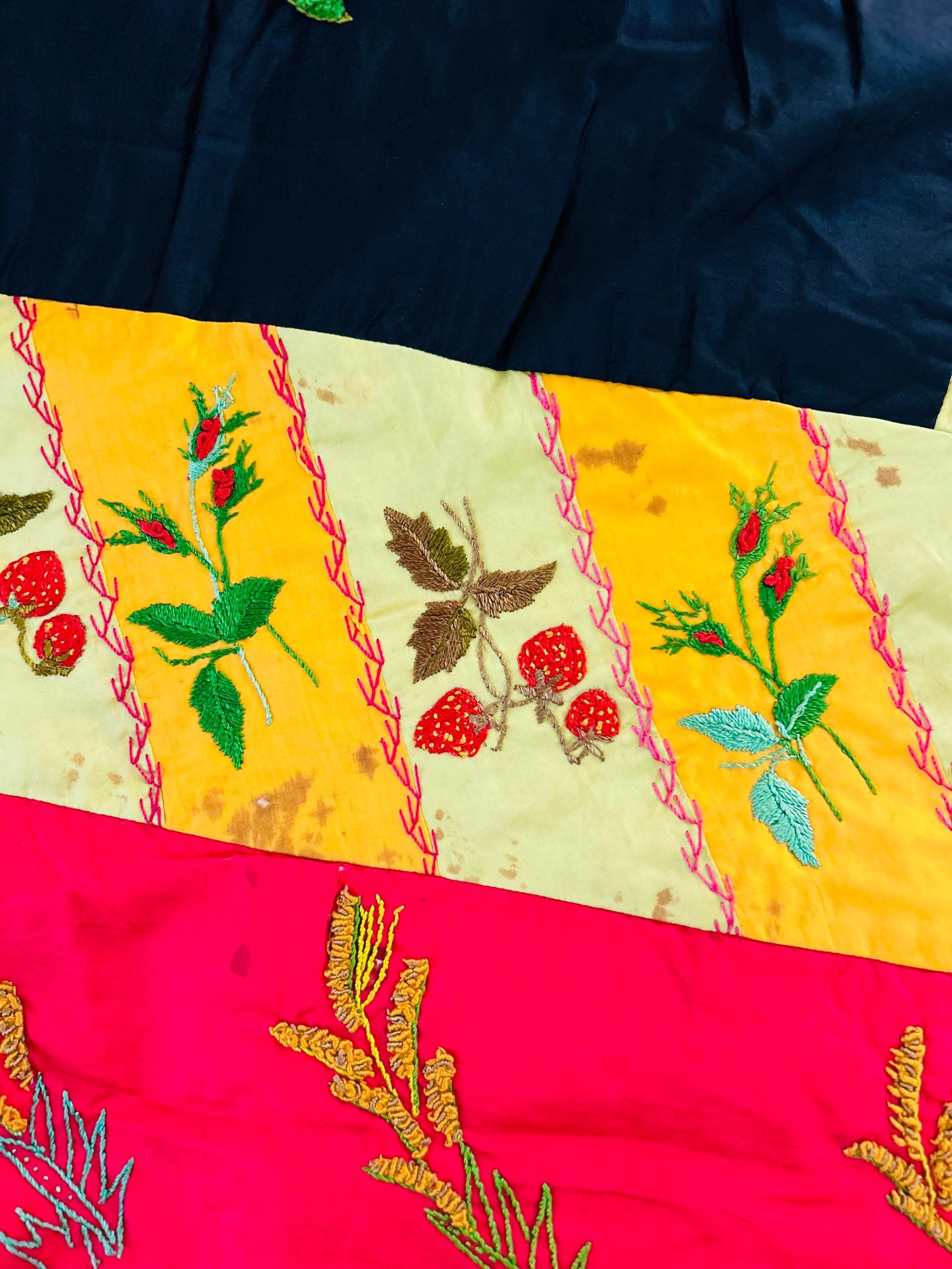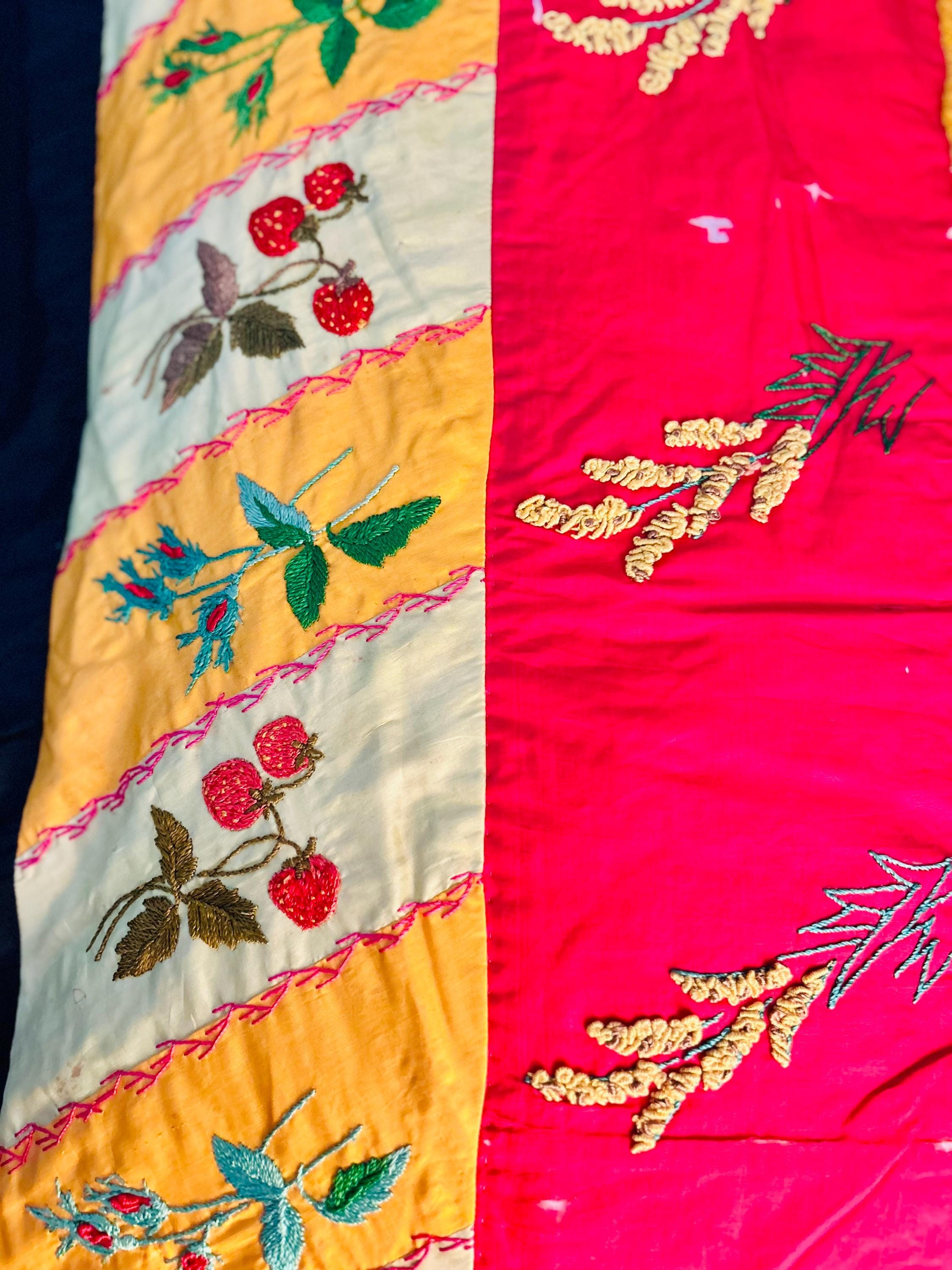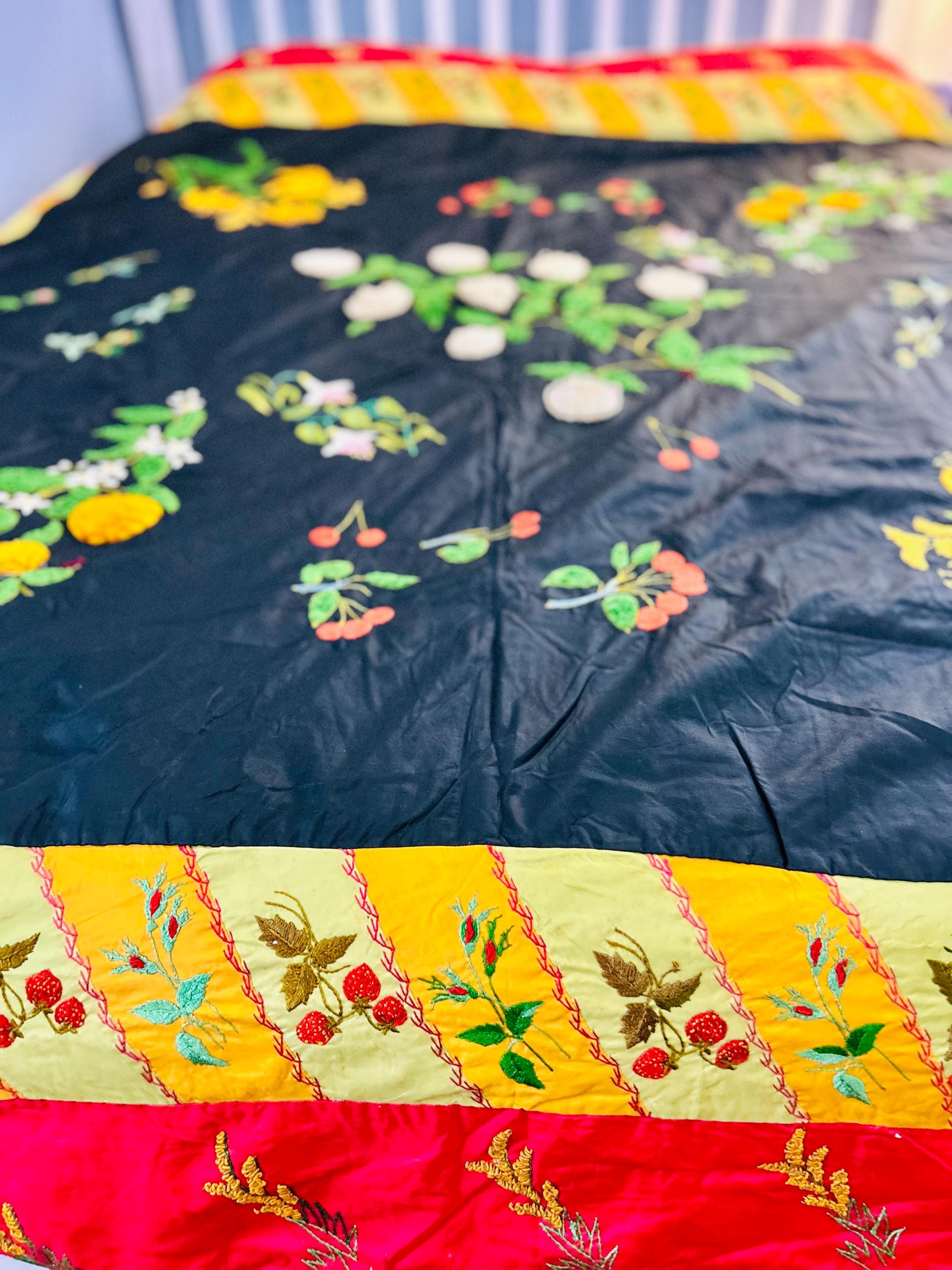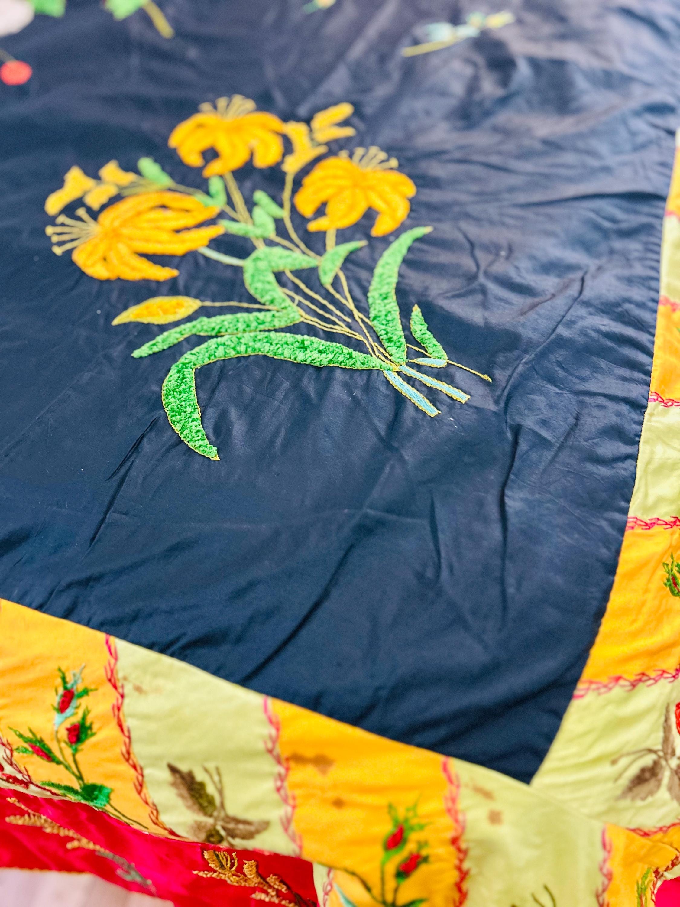 The border is beautifully worked with hand-embroidered, repeating strawberry vines on alternating red and yellow silk panels, which contrasts strikingly with the black silk body of the quilt, demonstrating an Art-Nouveau-influenced design not often found in surviving quilts.