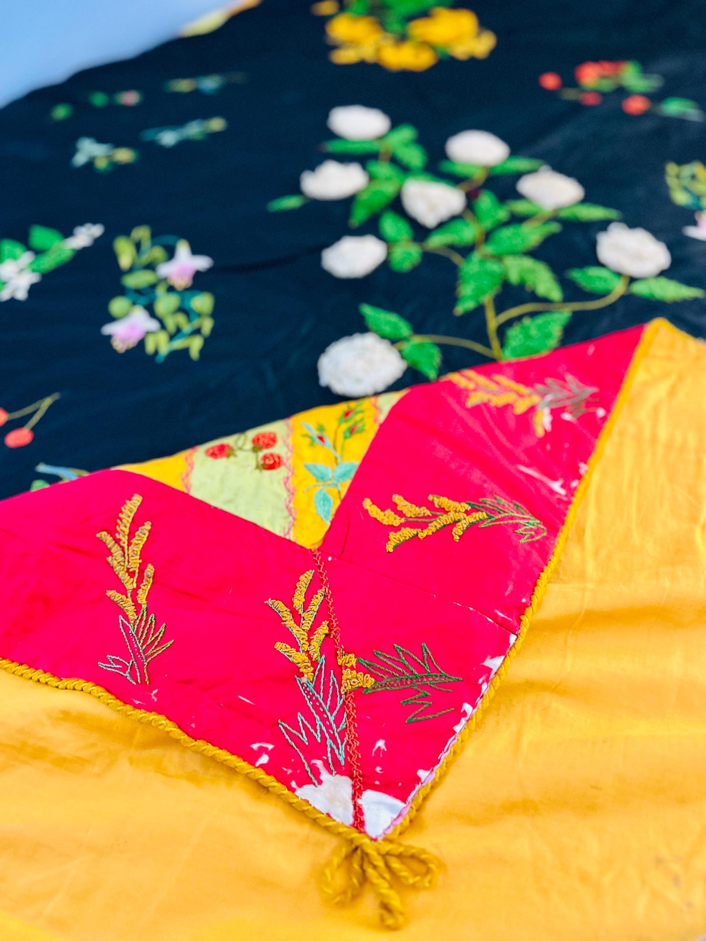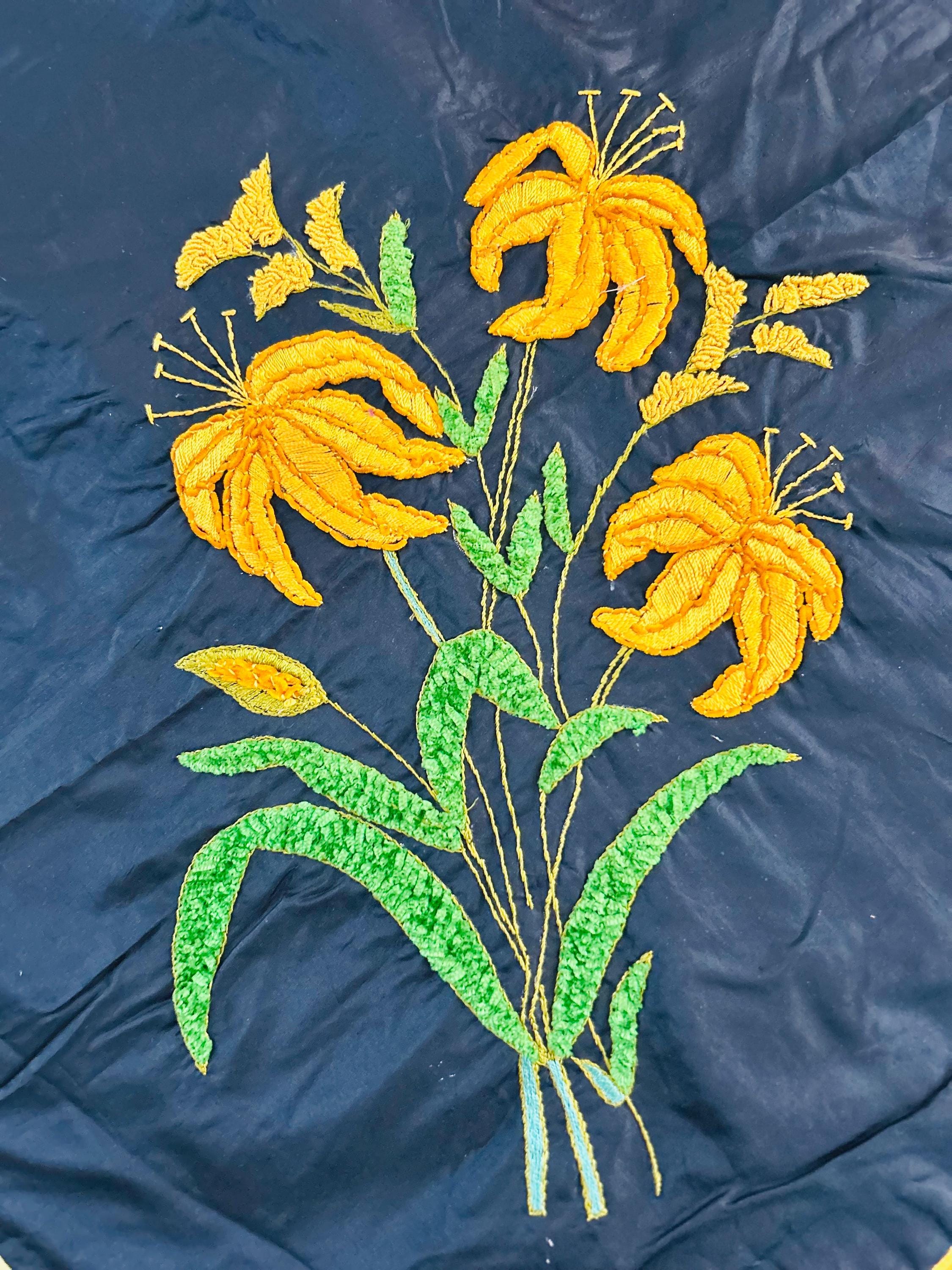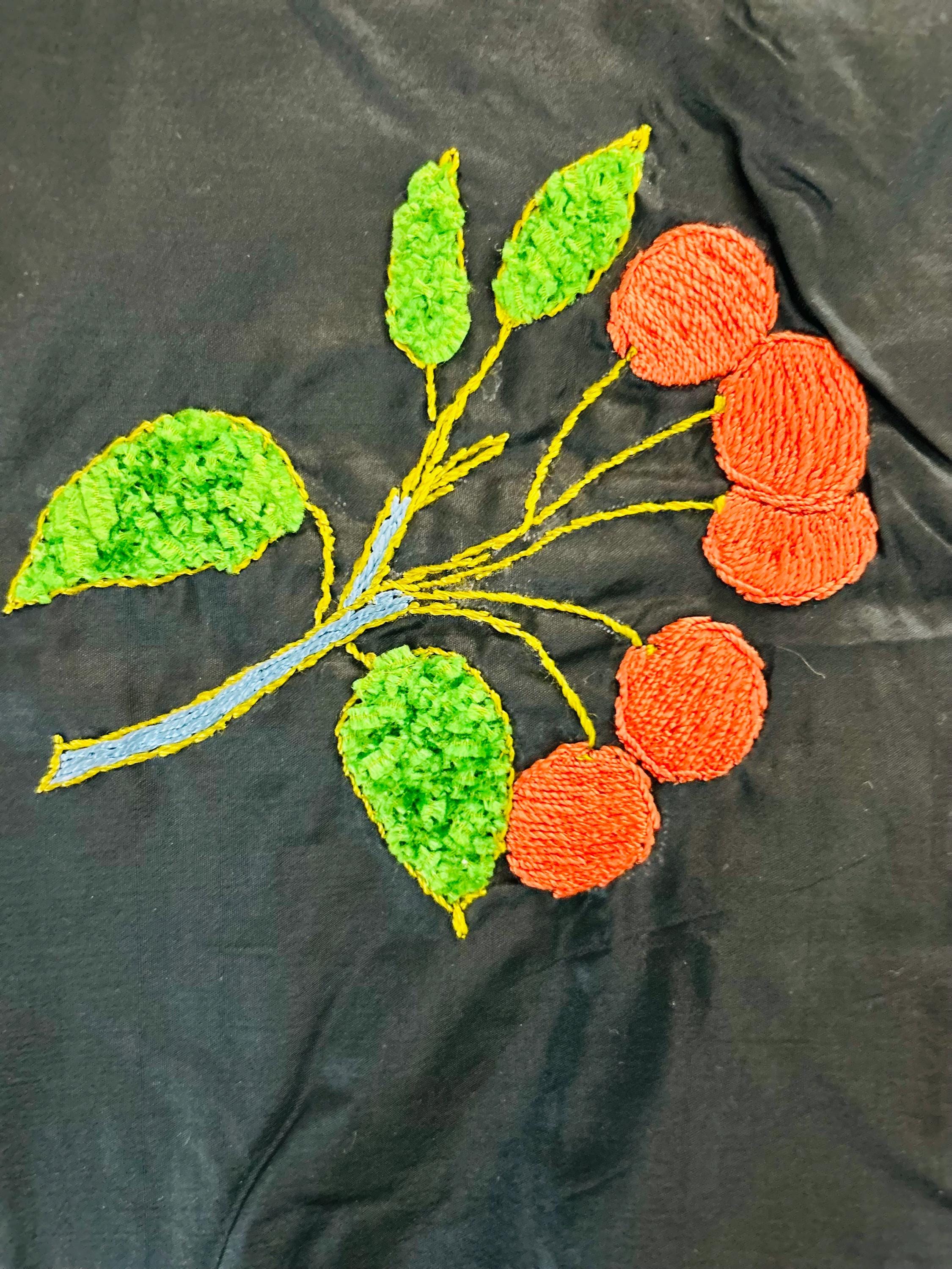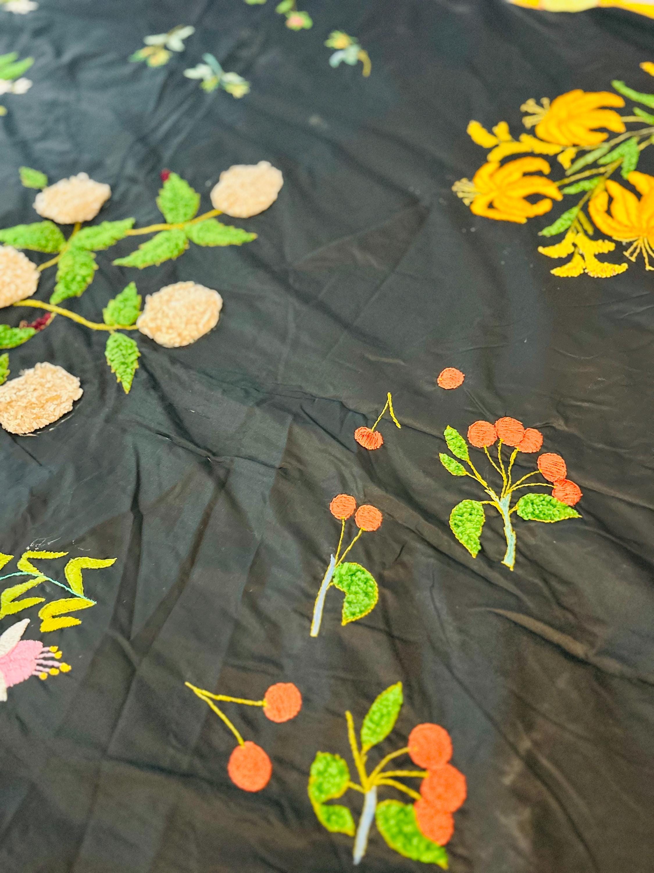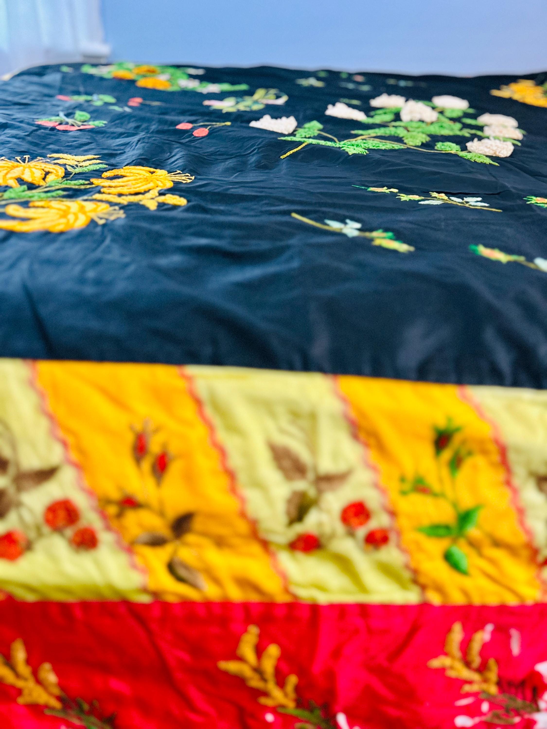 The border is beautifully worked with hand-embroidered, repeating strawberry vines on alternating red and yellow silk panels, which contrasts strikingly with the black silk body of the quilt, demonstrating an Art-Nouveau-influenced design not often found in surviving quilts.
