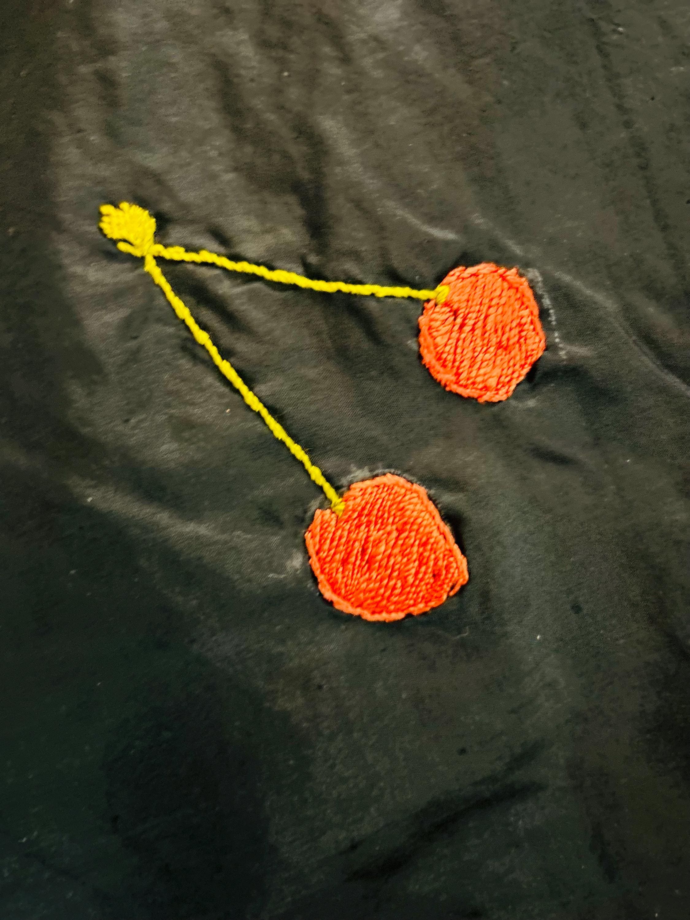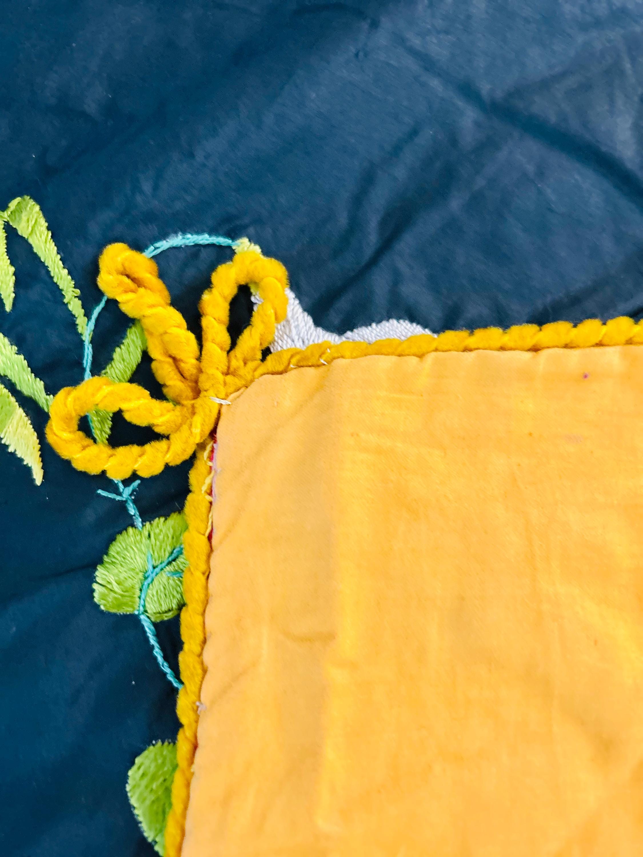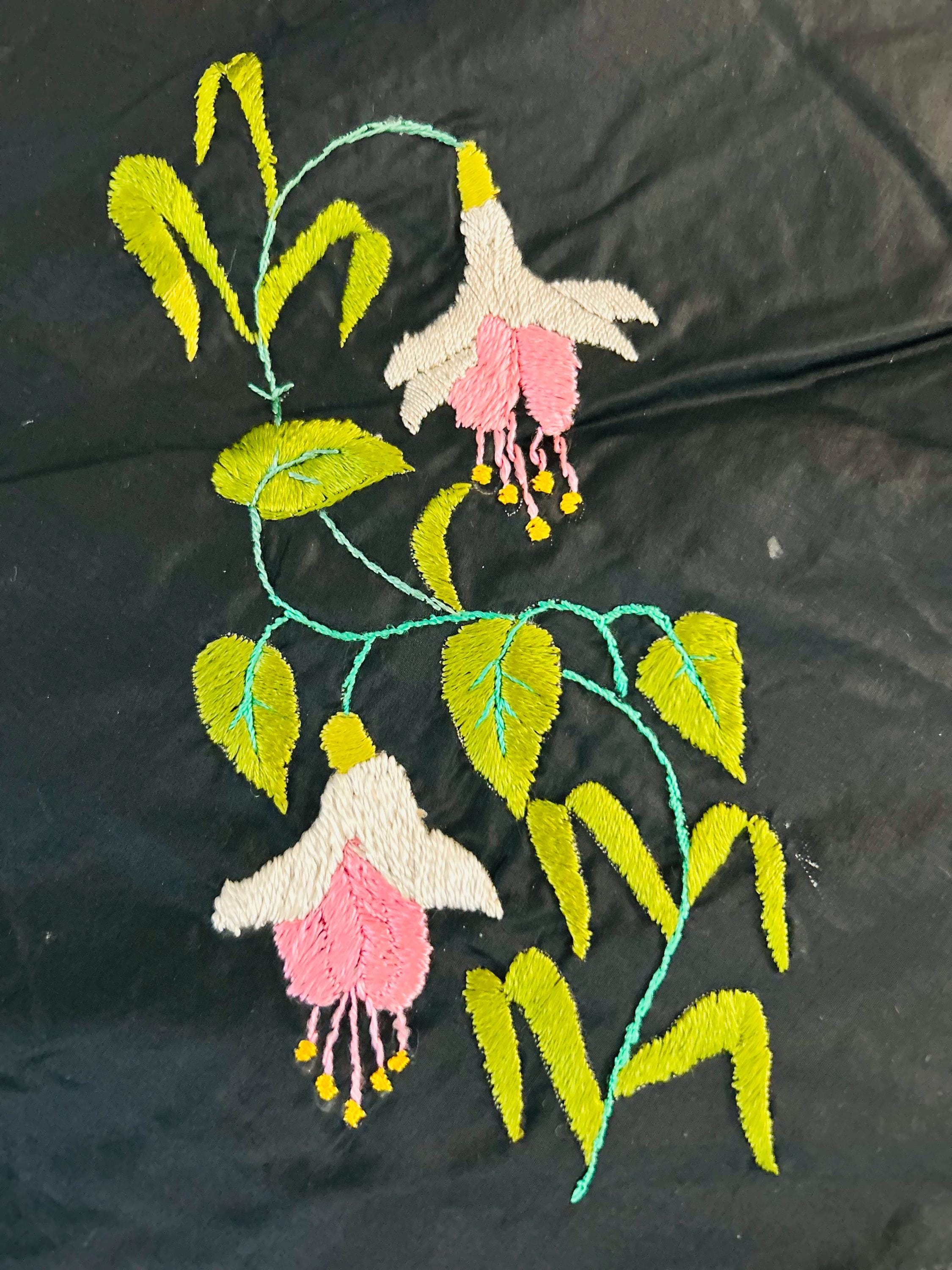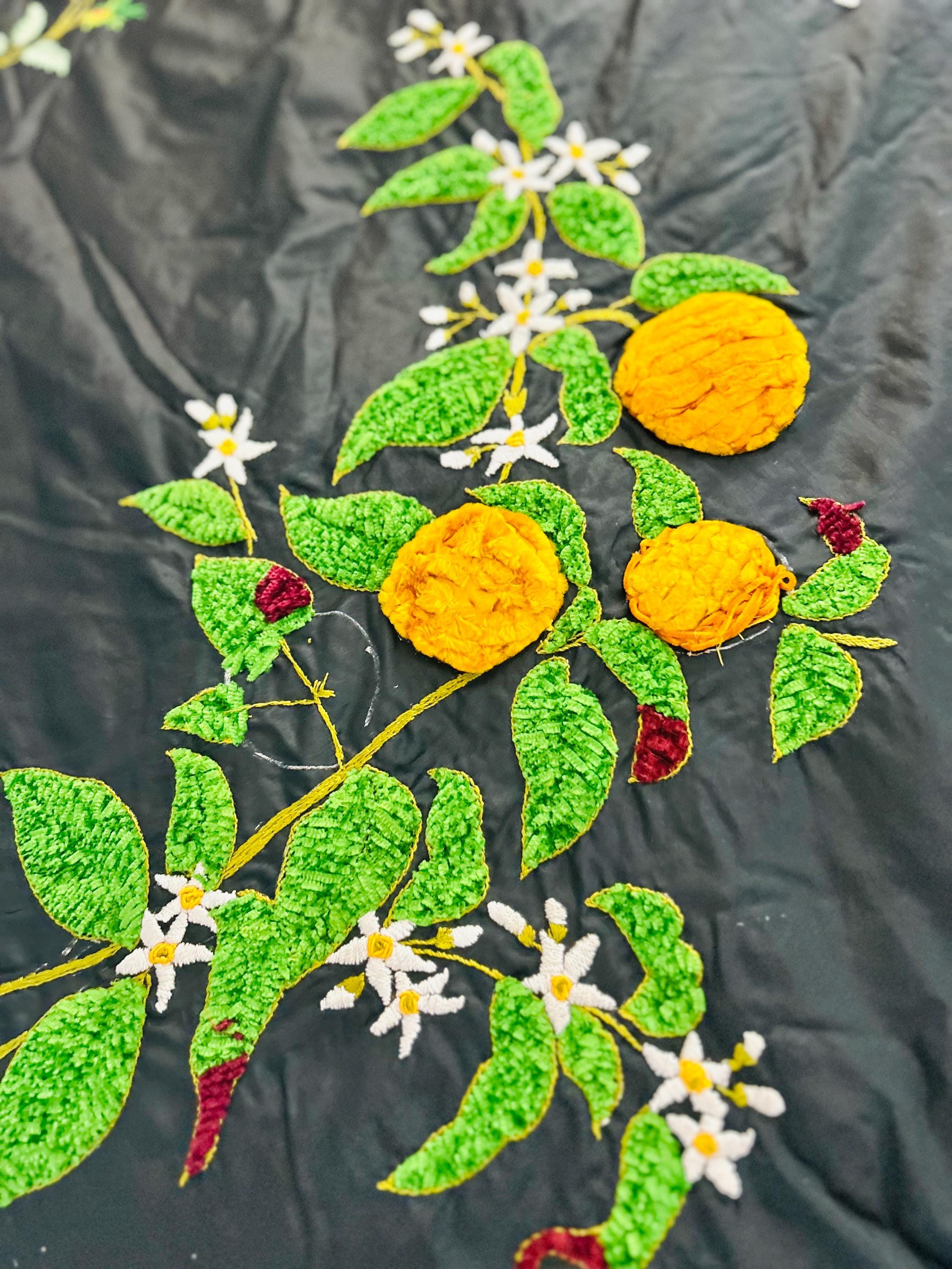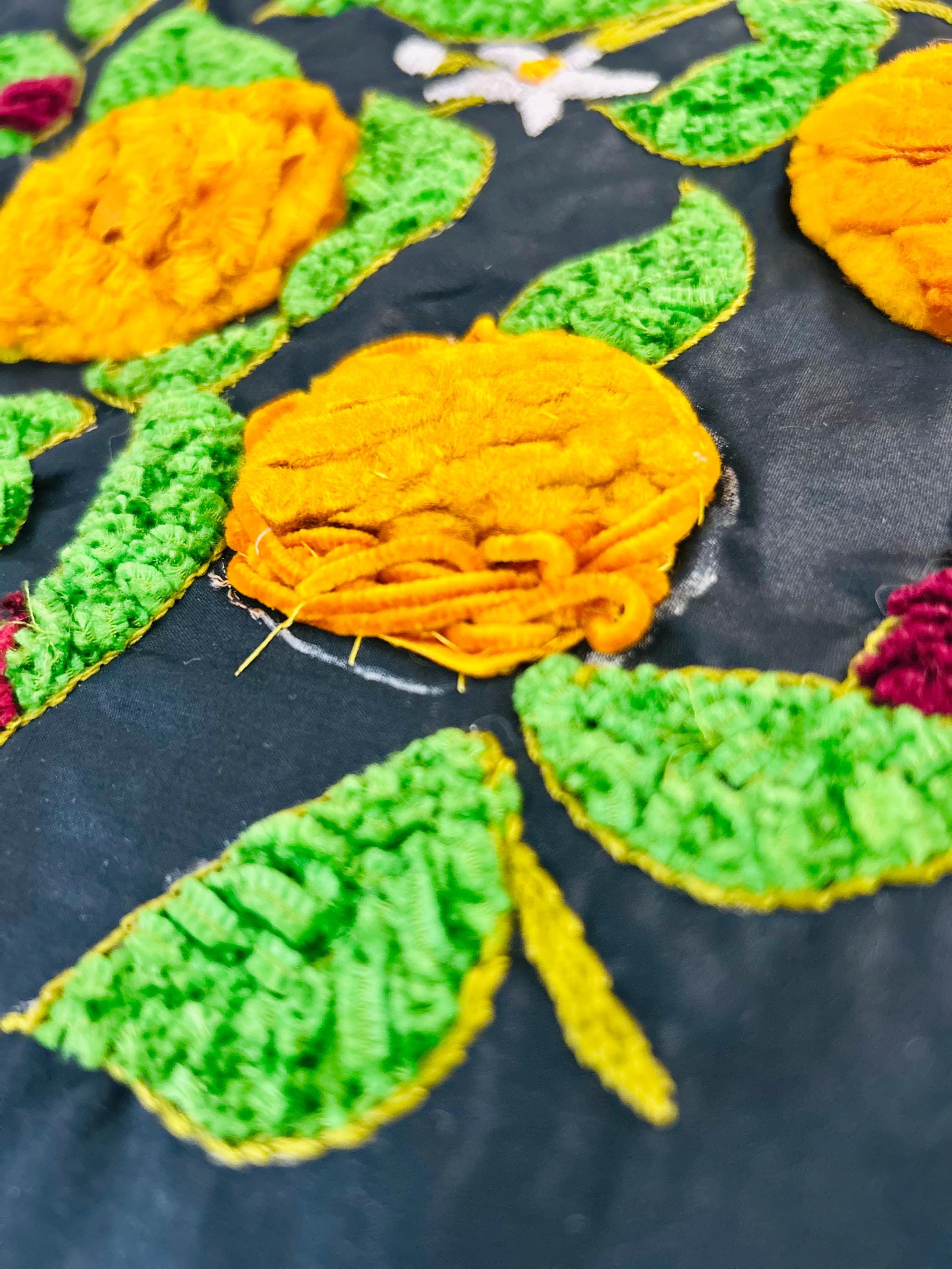 The border is beautifully worked with hand-embroidered, repeating strawberry vines on alternating red and yellow silk panels, which contrasts strikingly with the black silk body of the quilt, demonstrating an Art-Nouveau-influenced design not often found in surviving quilts.