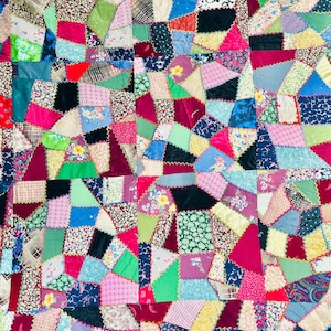 This exquisite 1880s Victorian crazy quilt was entirely hand-embroidered during the height of America's silk-quilt era. Created as a decorative parlor throw rather than a sleeping quilt, it showcases extraordinary craftsmanship and rich, detailed hand-embroidered motifs of lillies, fuchsia blossoms, cherries, citrus fruits, strawberries, snowball flowers and more, all on luminous silk. The embroidery stitches include satin stitch, outline stitch, French knots and chenille-style tufting. The back is yellow silk and the binding is a brocade rope. See photos.