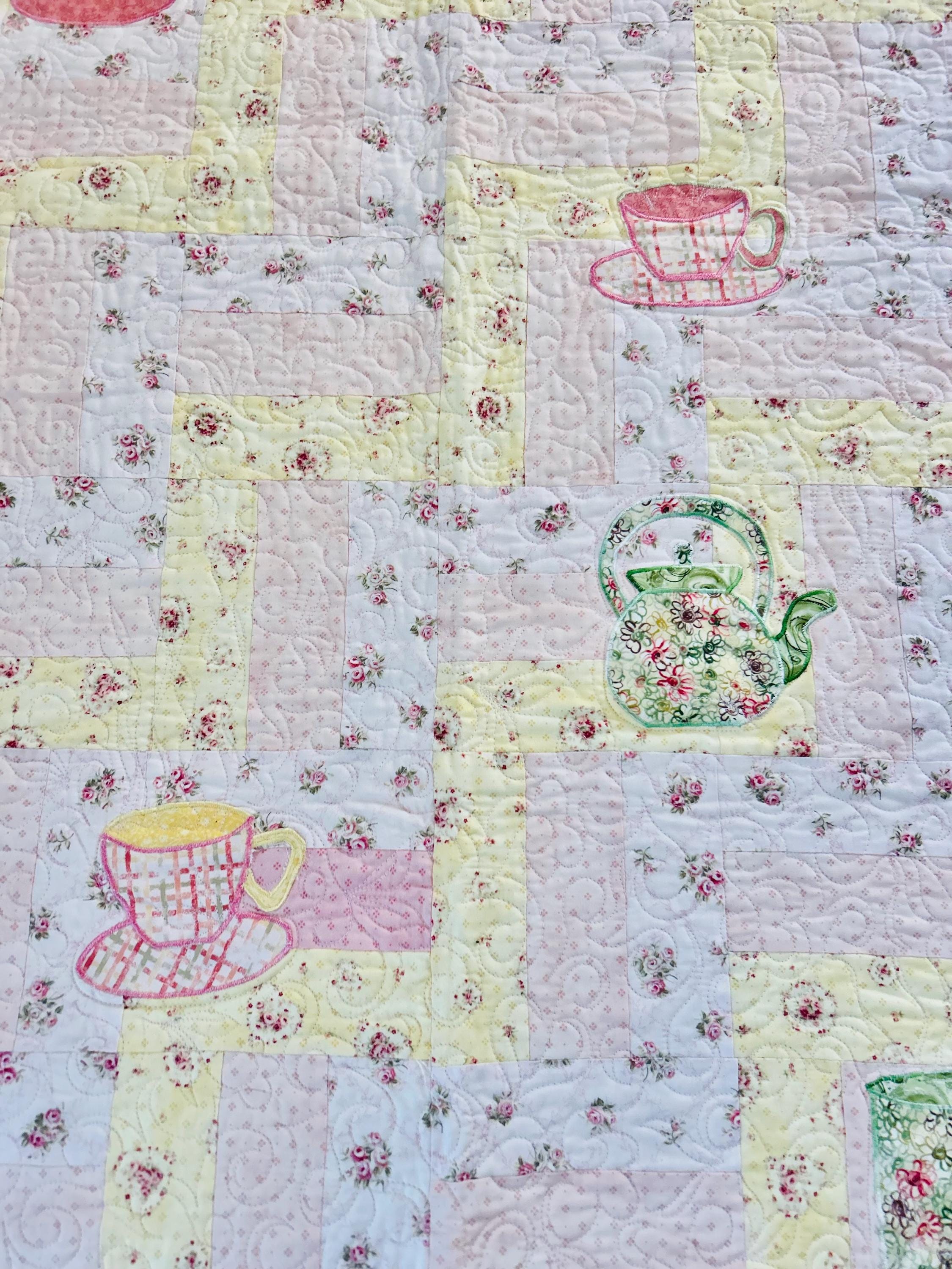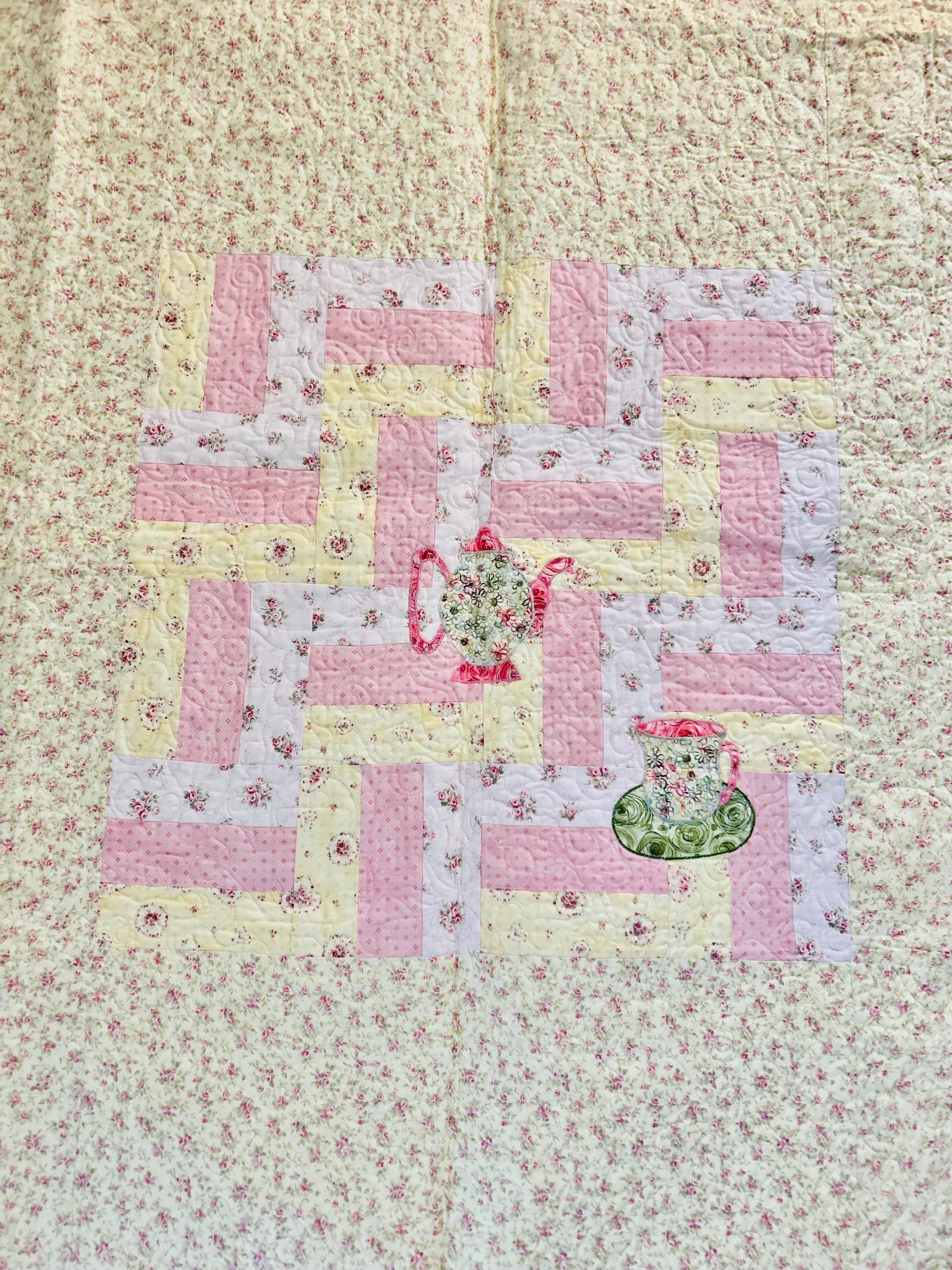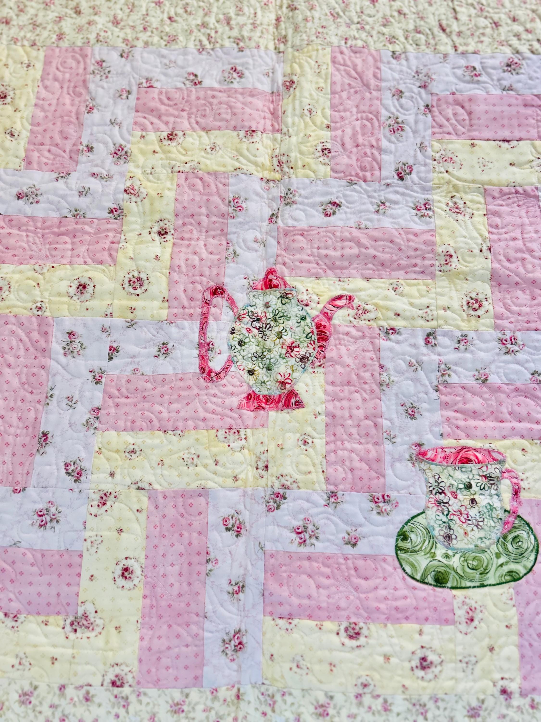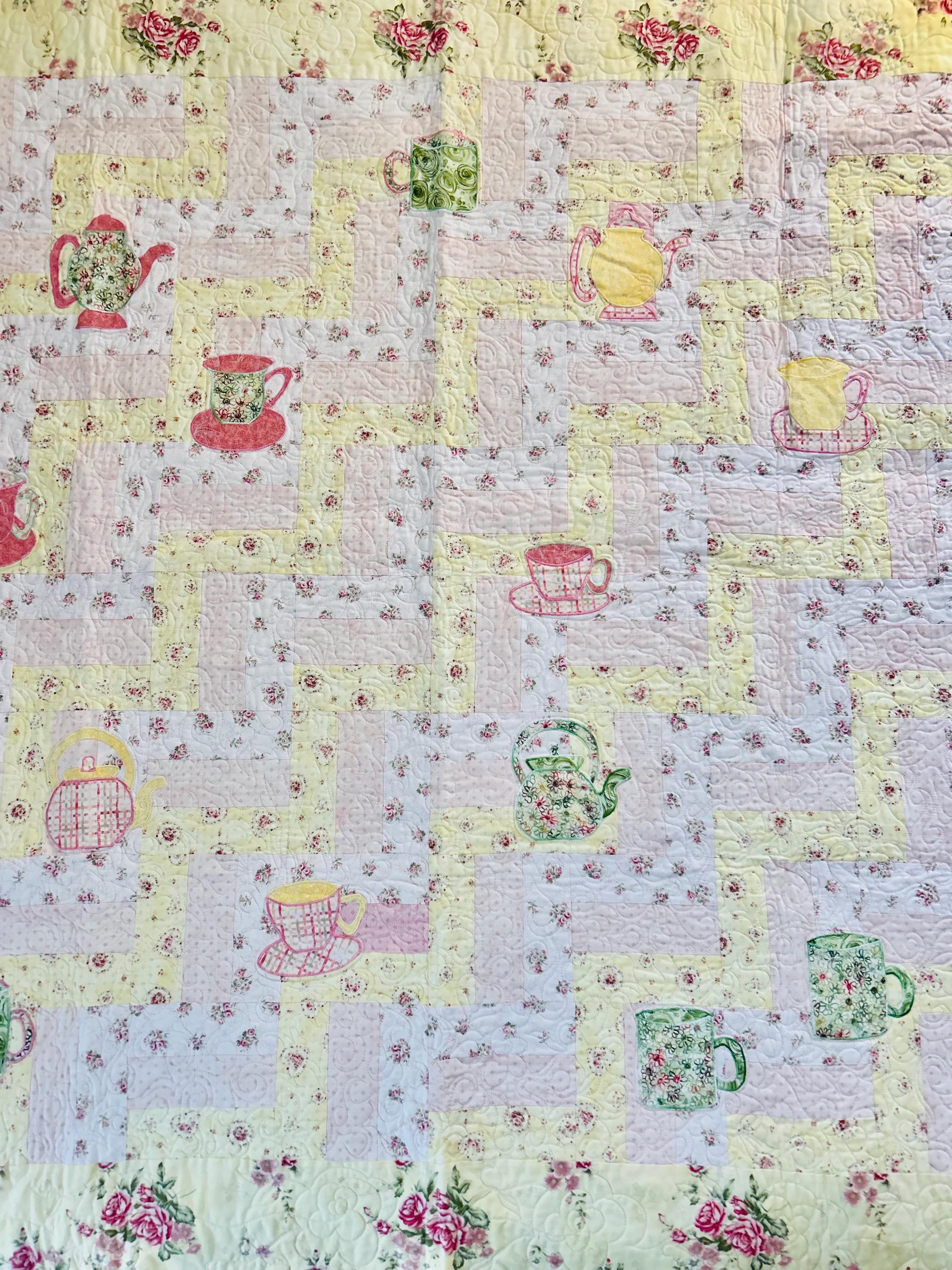 Such a sweet handmade cottage-style Rail Fence Quilt with appliques of tea cups, tea pots and pitchers. The classic Rail Fence patchwork is made from high-quality cottons in pastel yellow, pink and blue rose-print fabrics, giving the quilt a romantic shabby-chic look. The longarm quilting is in a swirling feather pattern.