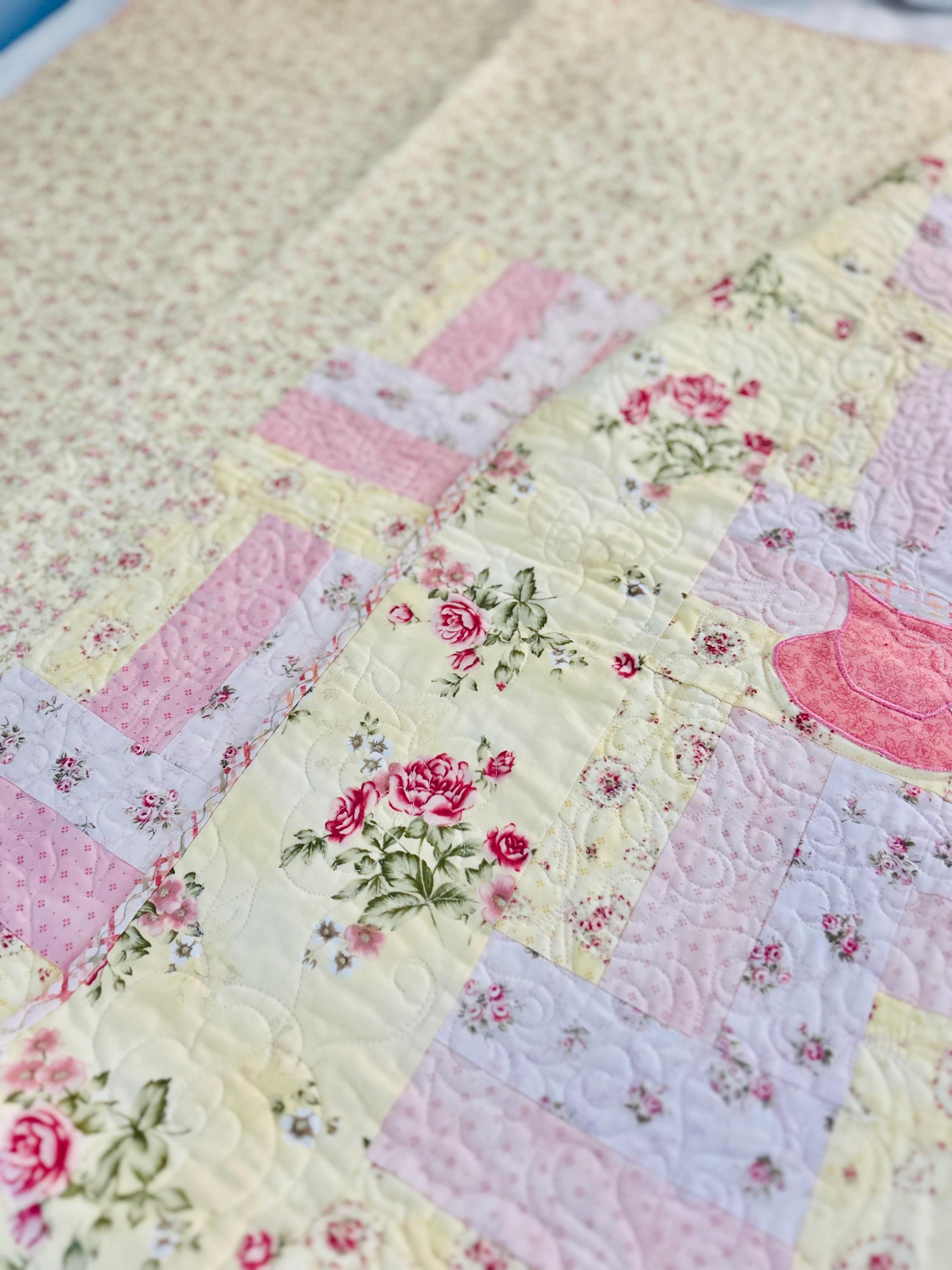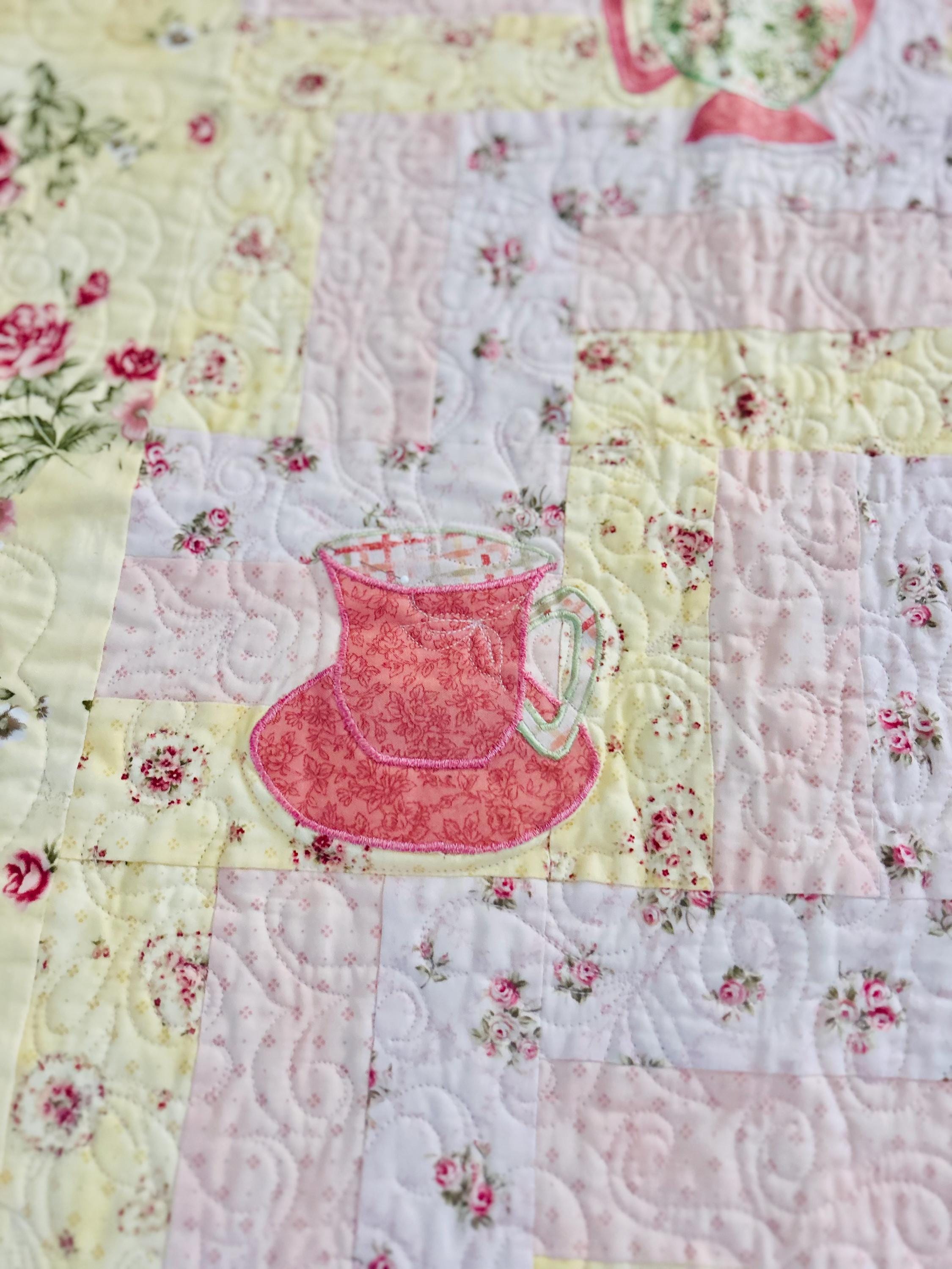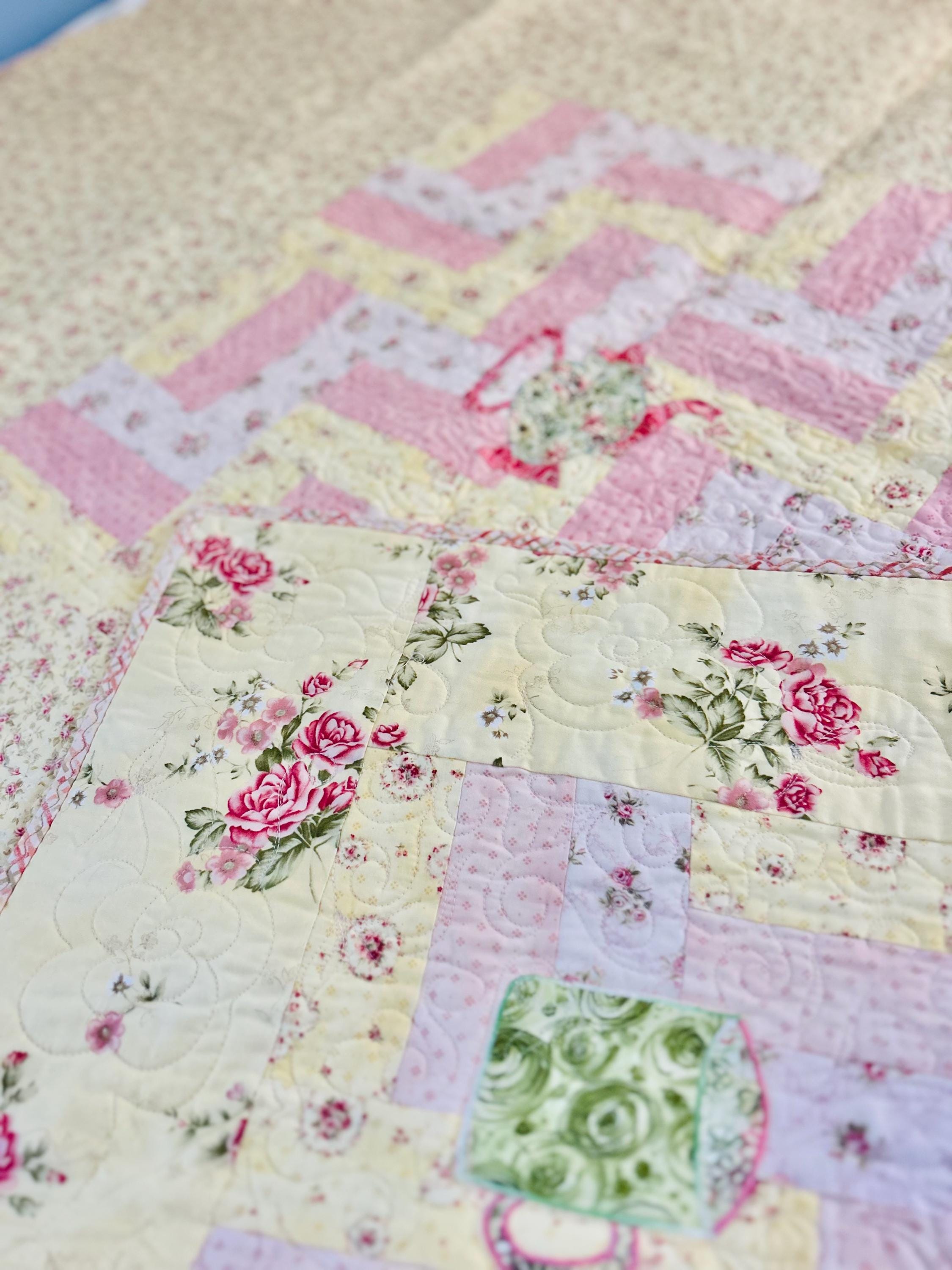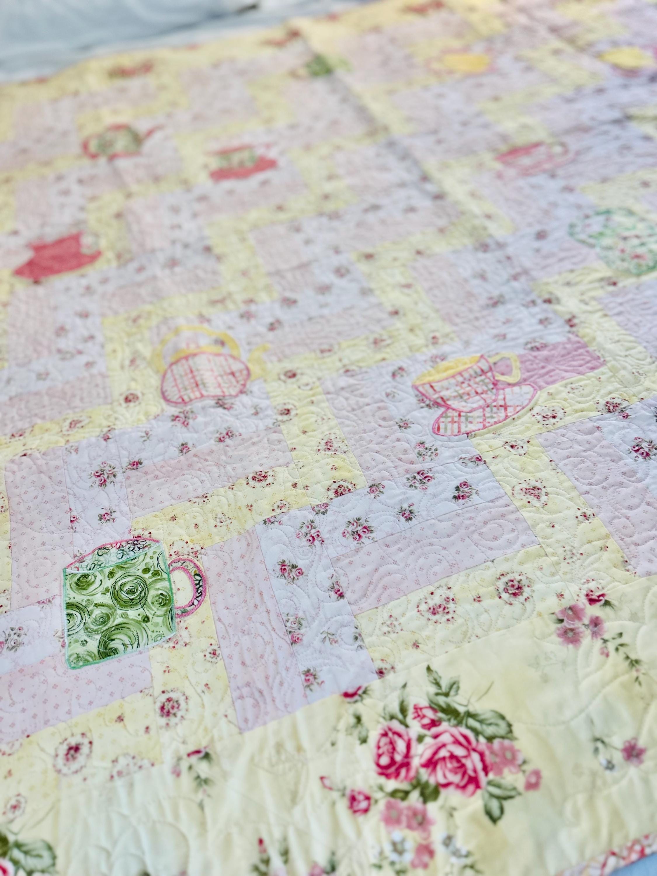 Such a sweet handmade cottage-style Rail Fence Quilt with appliques of tea cups, tea pots and pitchers. The classic Rail Fence patchwork is made from high-quality cottons in pastel yellow, pink and blue rose-print fabrics, giving the quilt a romantic shabby-chic look. The longarm quilting is in a swirling feather pattern.