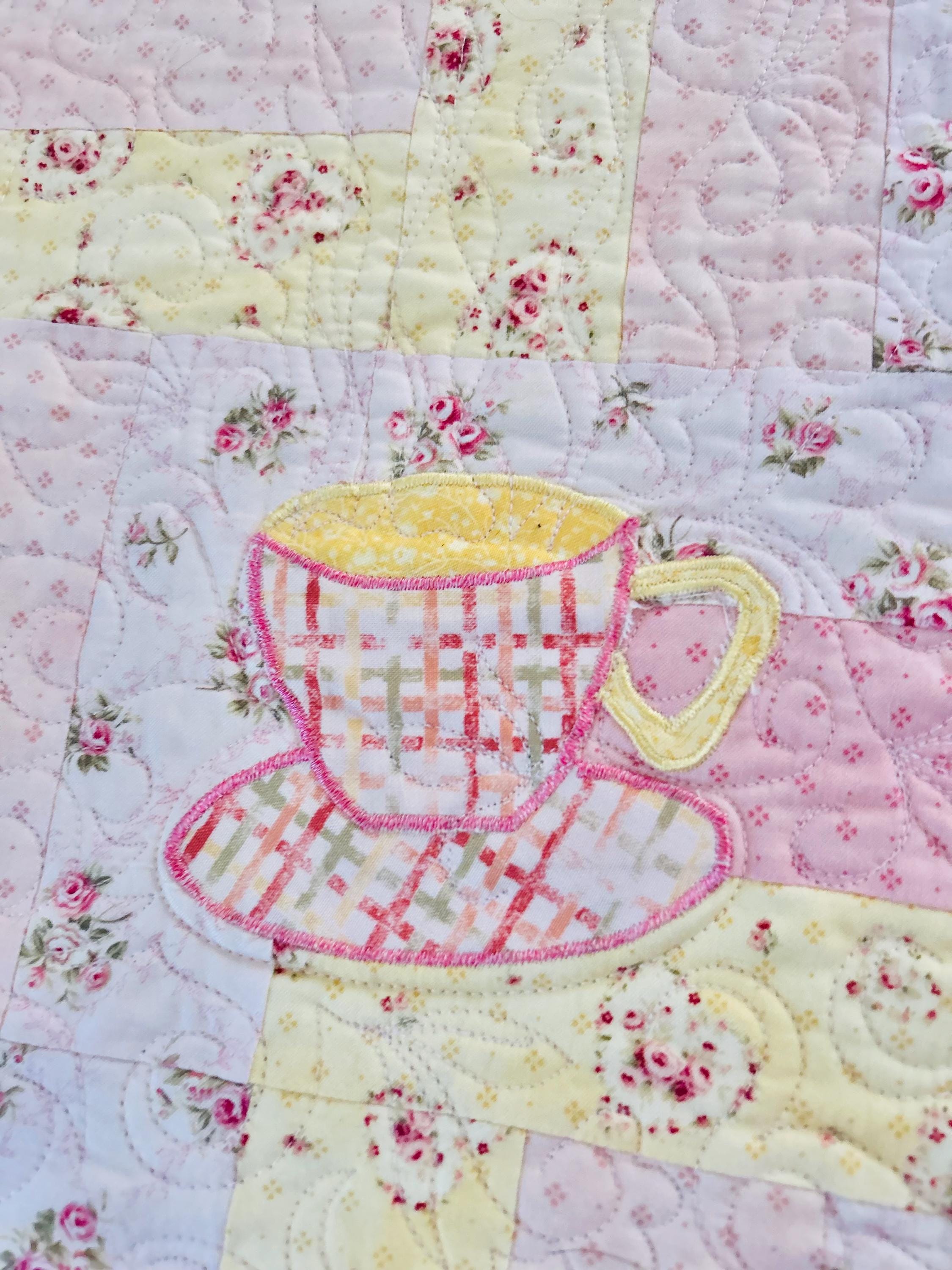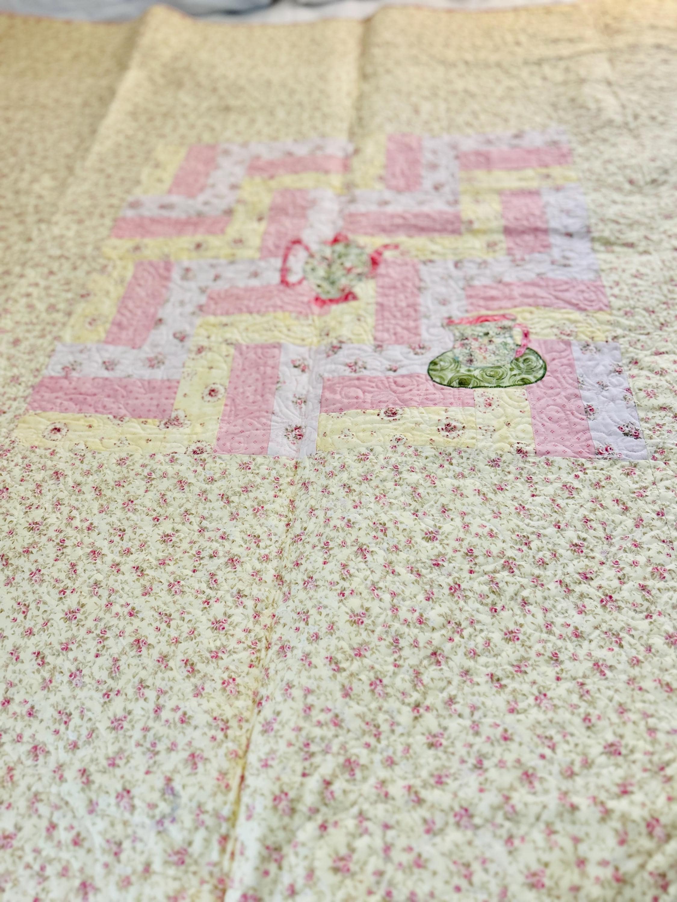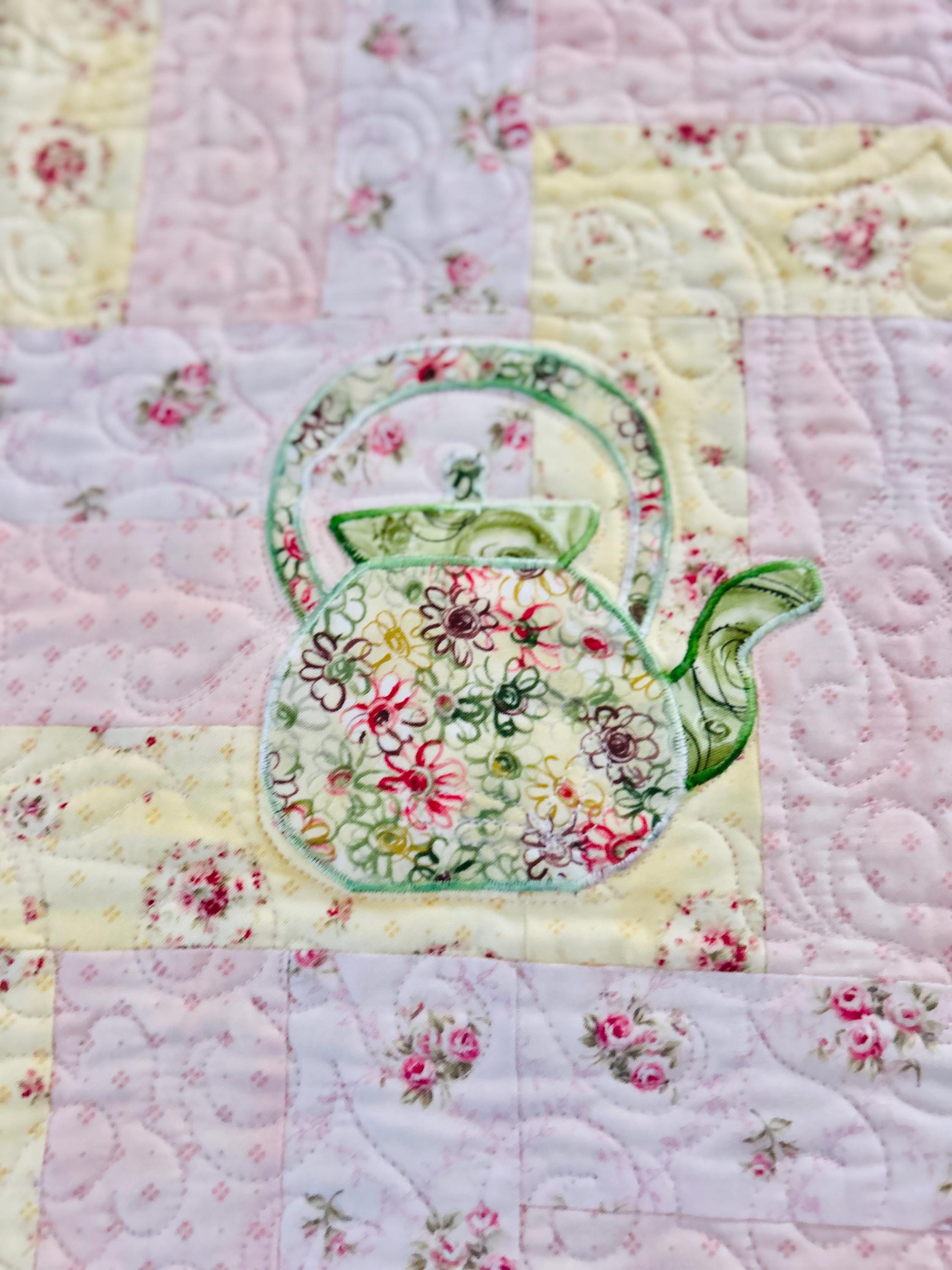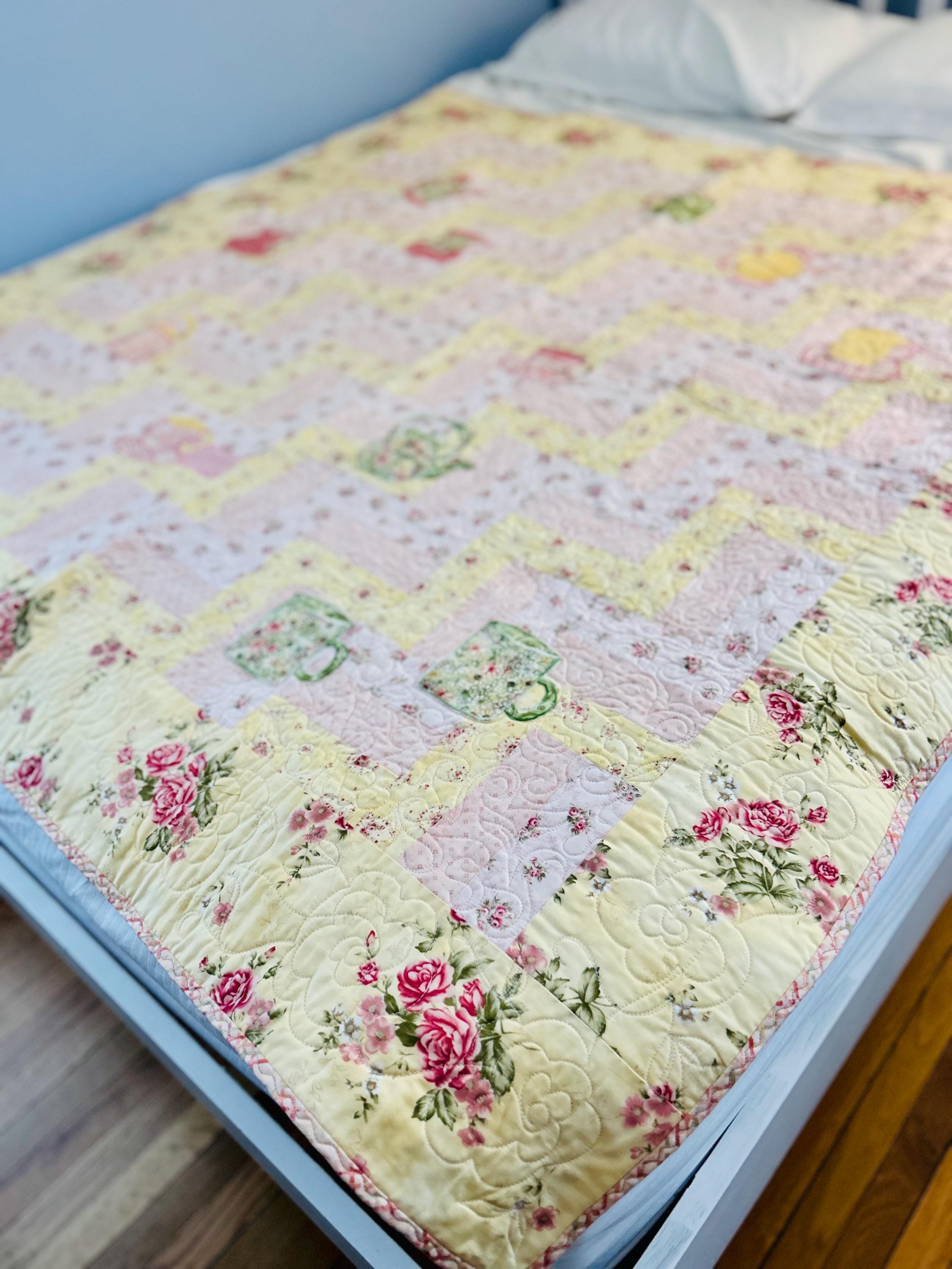 Such a sweet handmade cottage-style Rail Fence Quilt with appliques of tea cups, tea pots and pitchers. The classic Rail Fence patchwork is made from high-quality cottons in pastel yellow, pink and blue rose-print fabrics, giving the quilt a romantic shabby-chic look. The longarm quilting is in a swirling feather pattern.