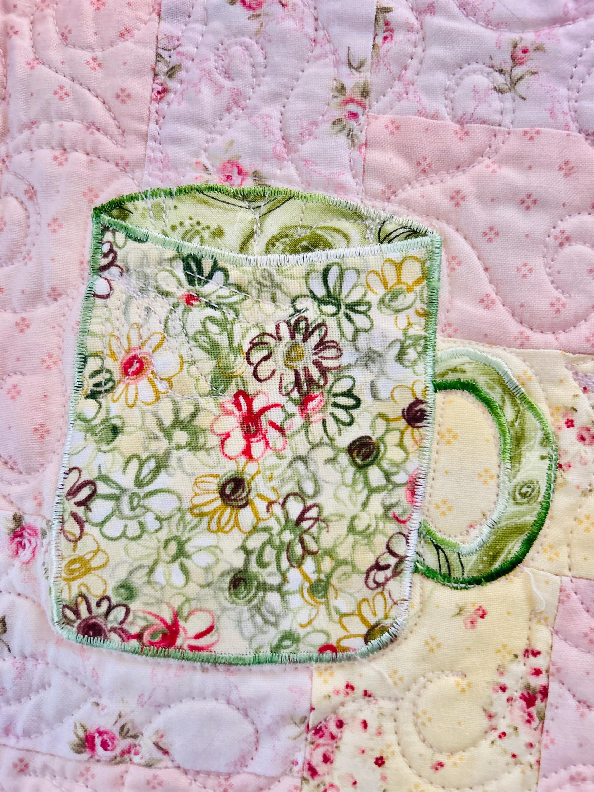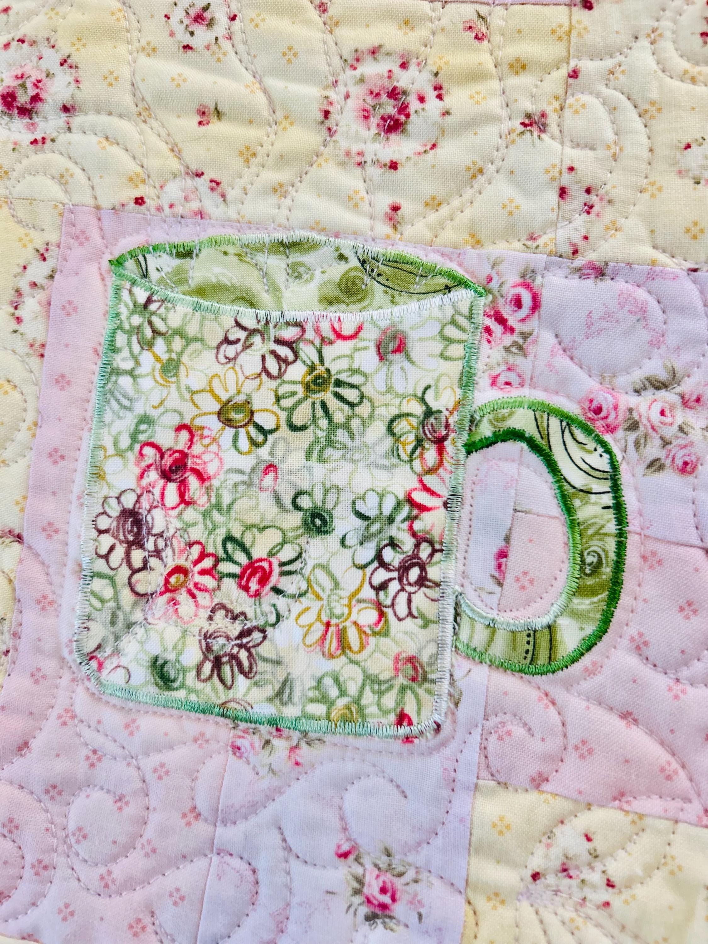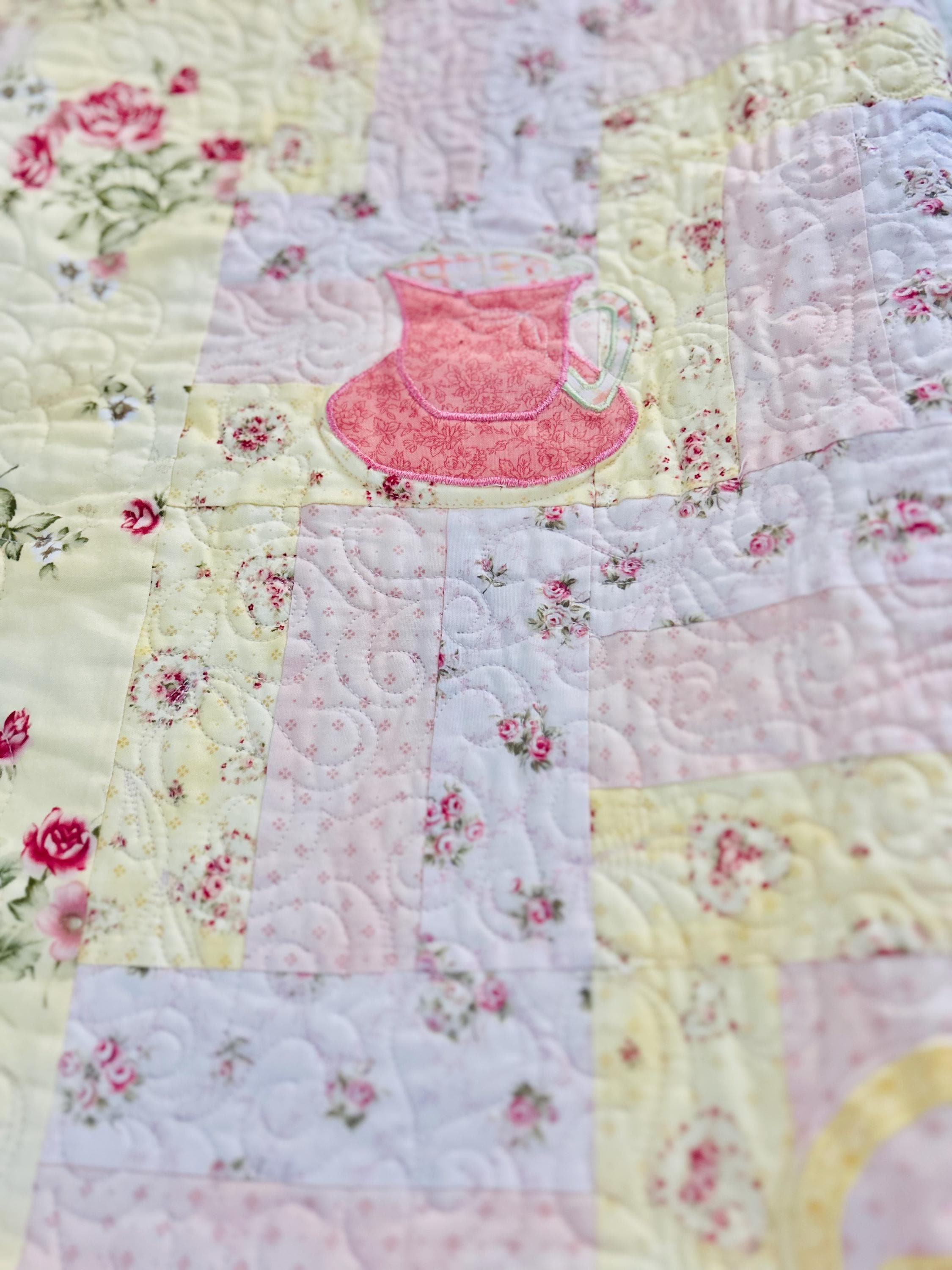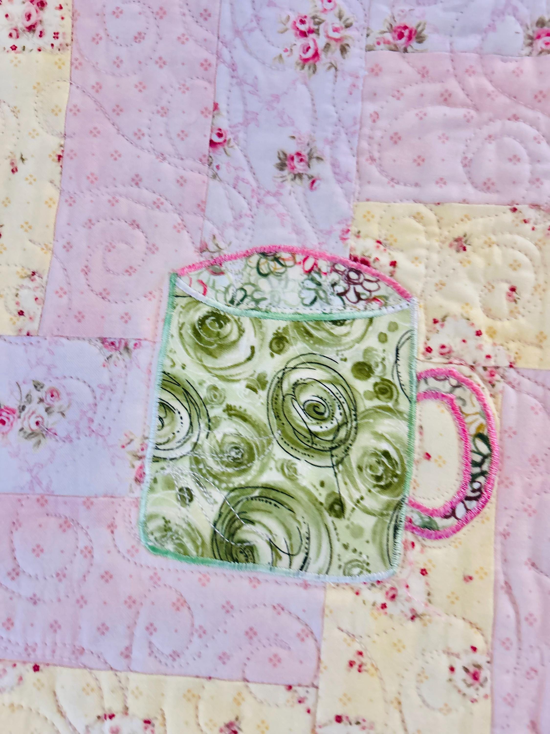 Such a sweet handmade cottage-style Rail Fence Quilt with appliques of tea cups, tea pots and pitchers. The classic Rail Fence patchwork is made from high-quality cottons in pastel yellow, pink and blue rose-print fabrics, giving the quilt a romantic shabby-chic look. The longarm quilting is in a swirling feather pattern.