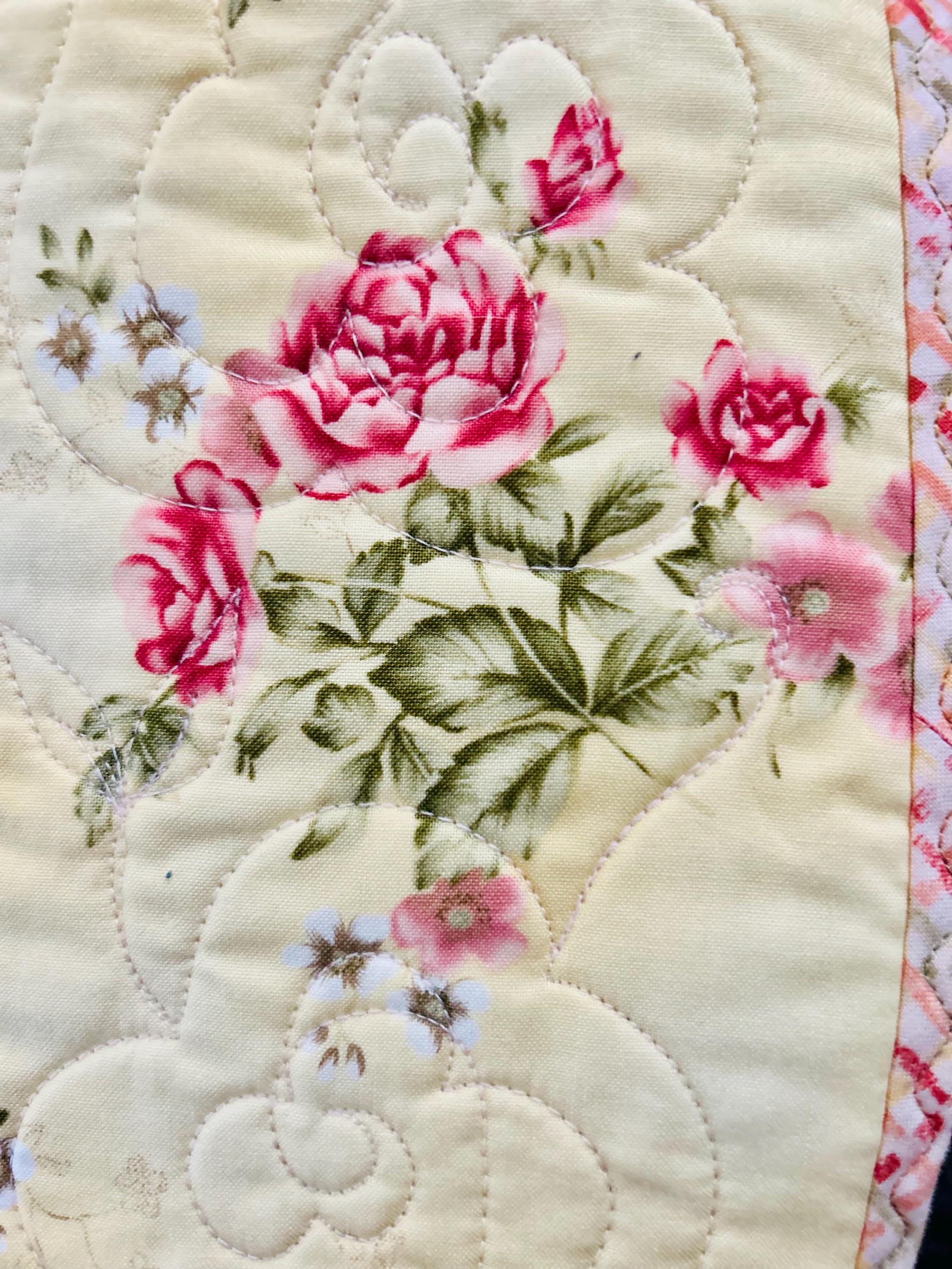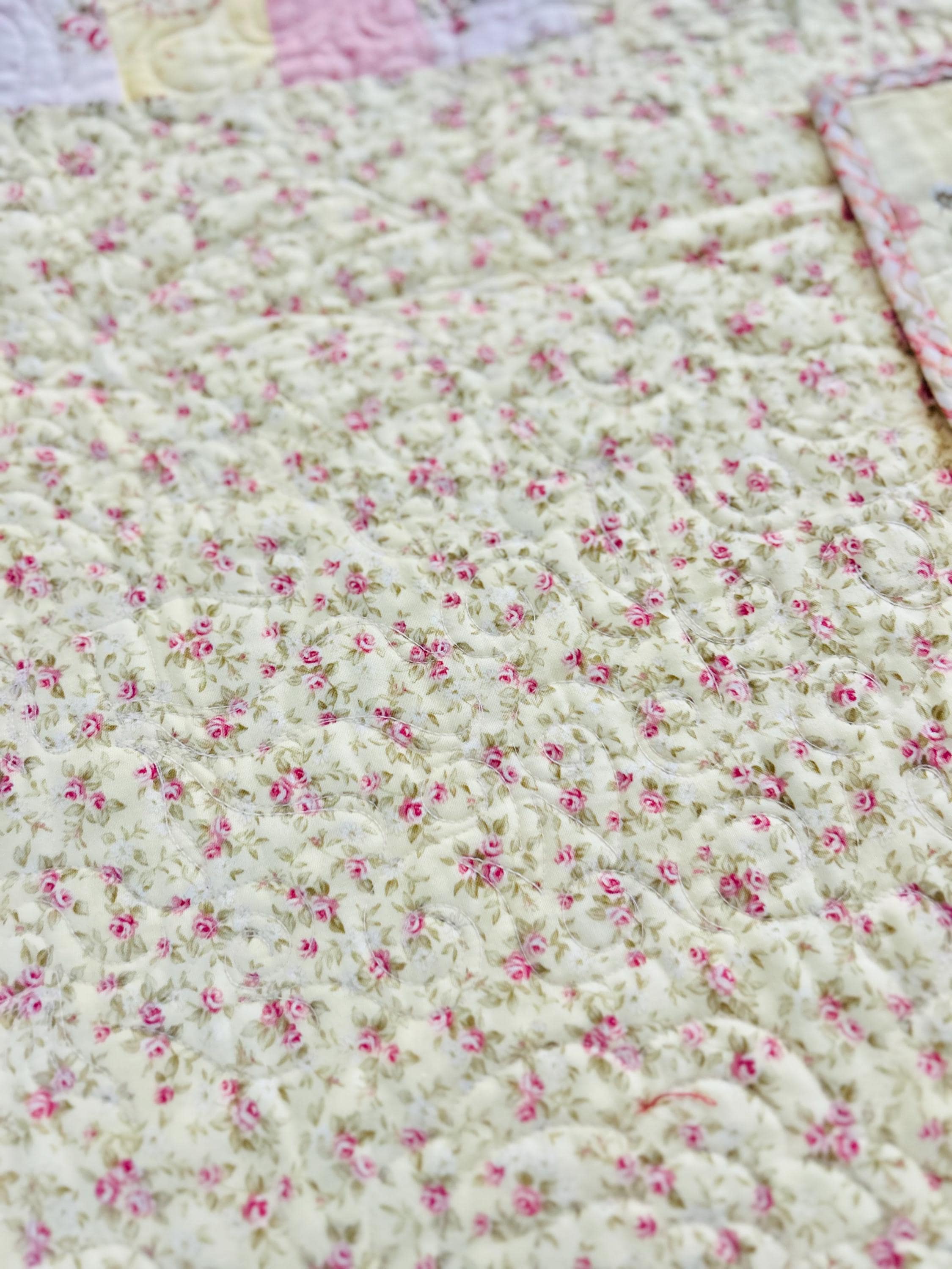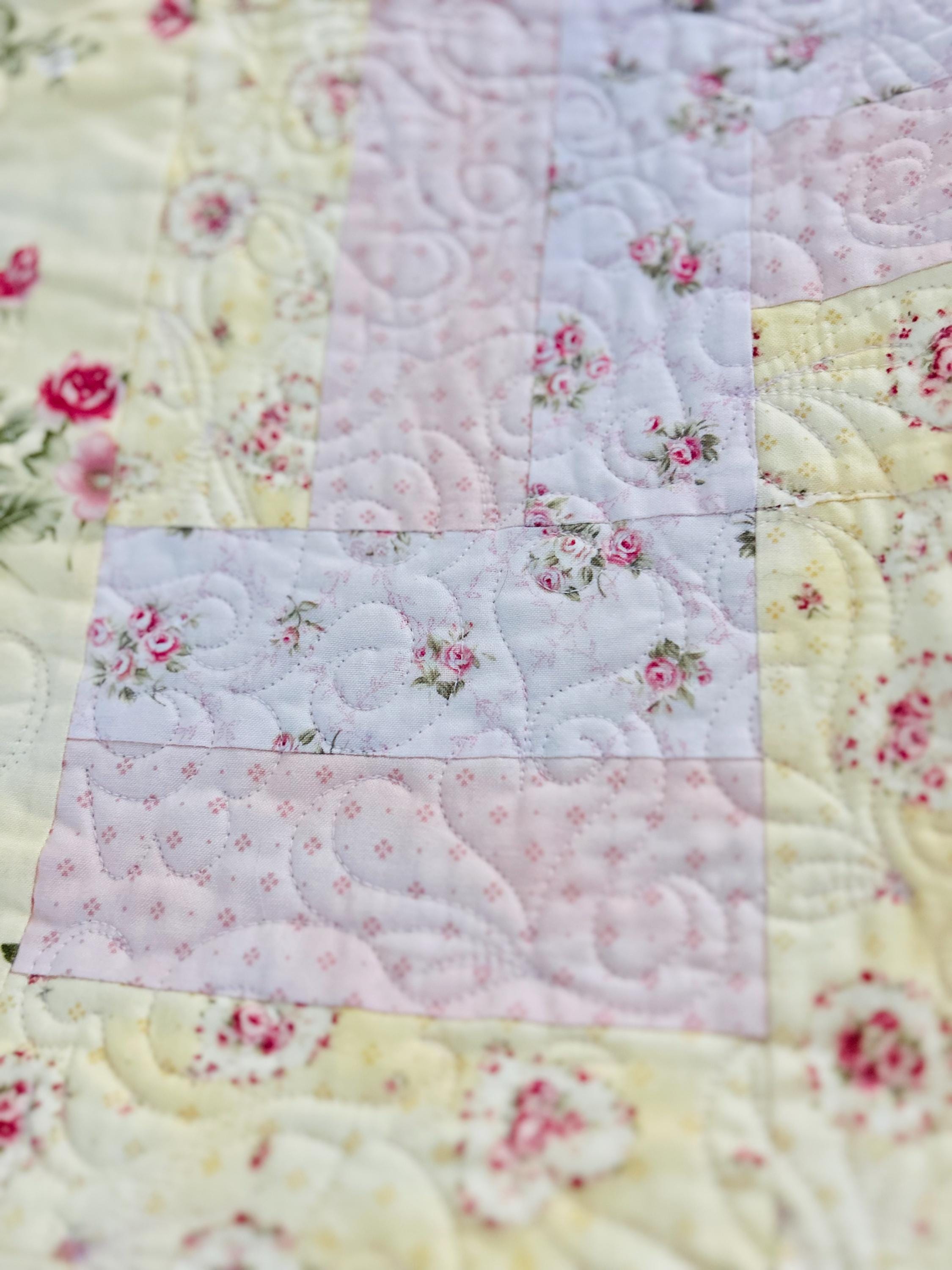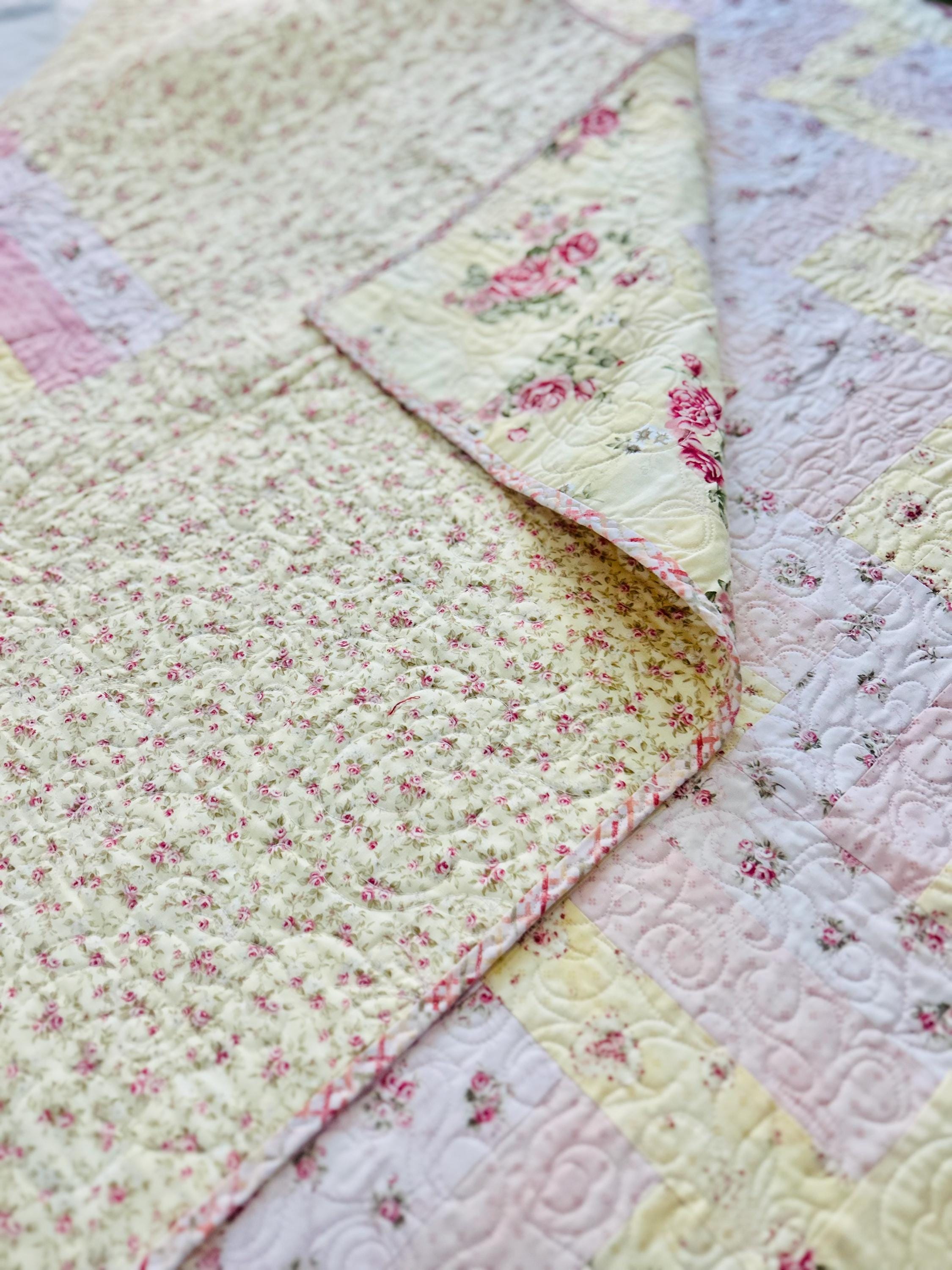 The back is pastel pink and yellow cotton while the binding is a pink floral that has been machine stitched to the front and hand-stitched to the back. The batting is very lightweight.