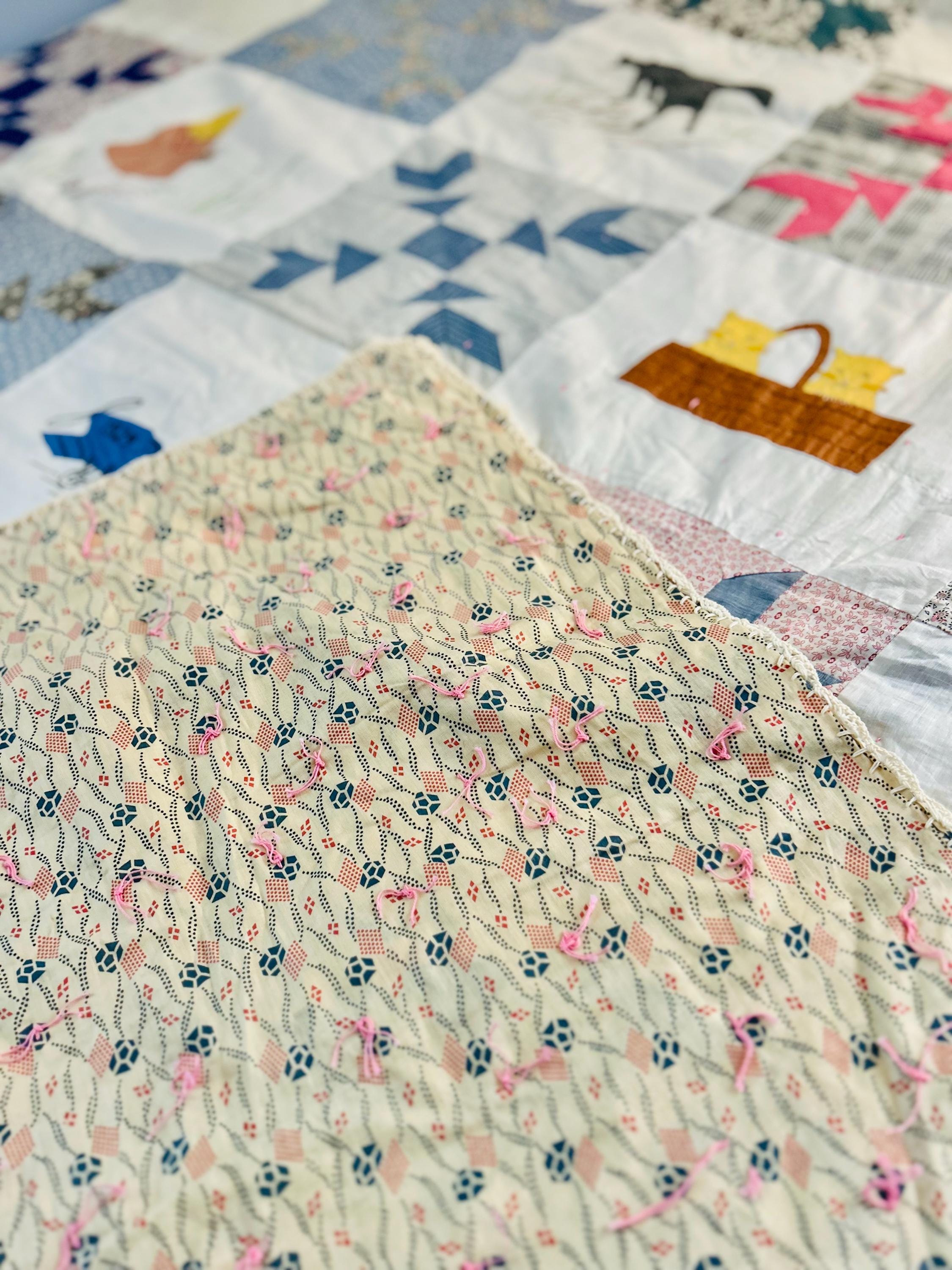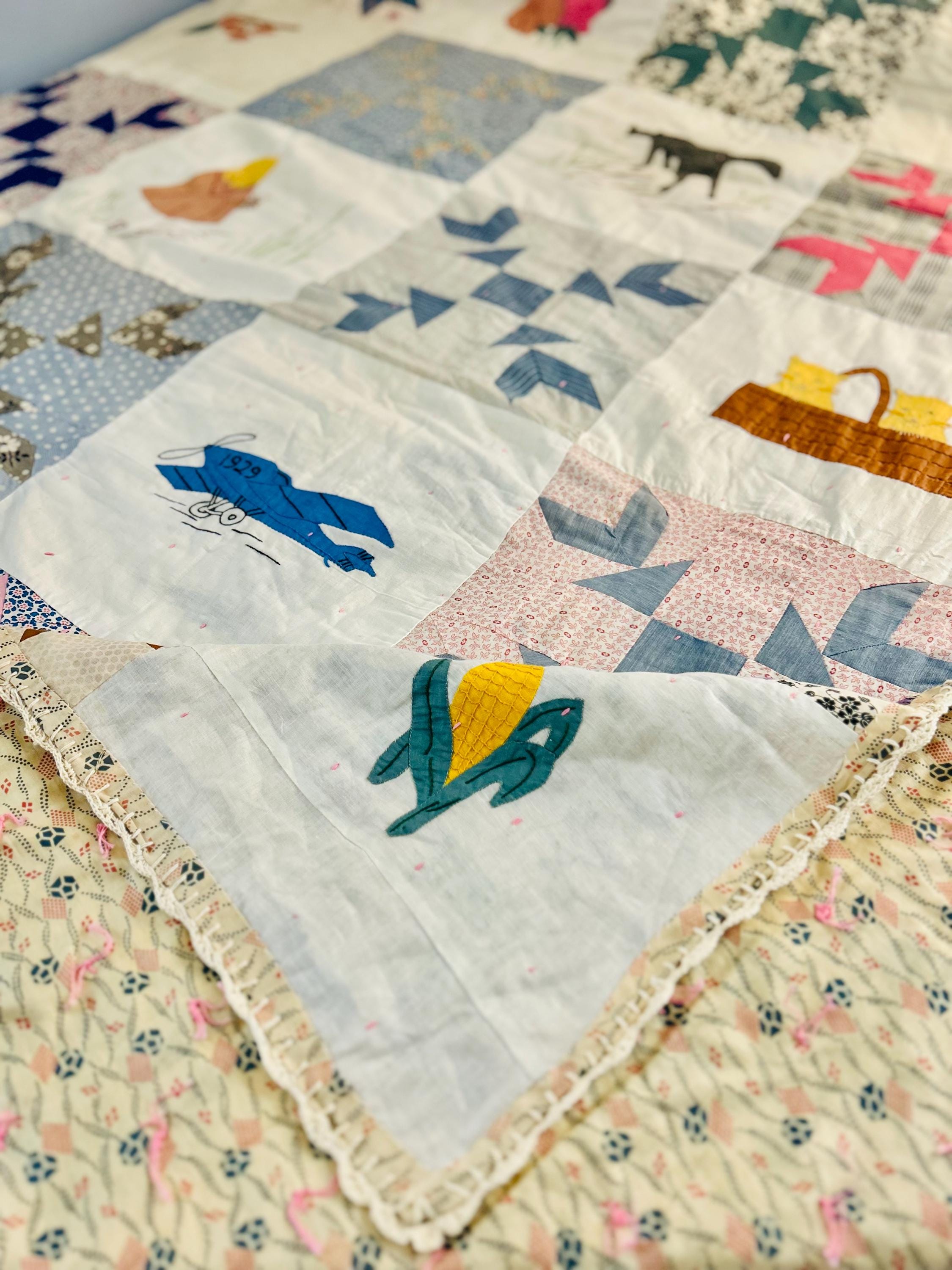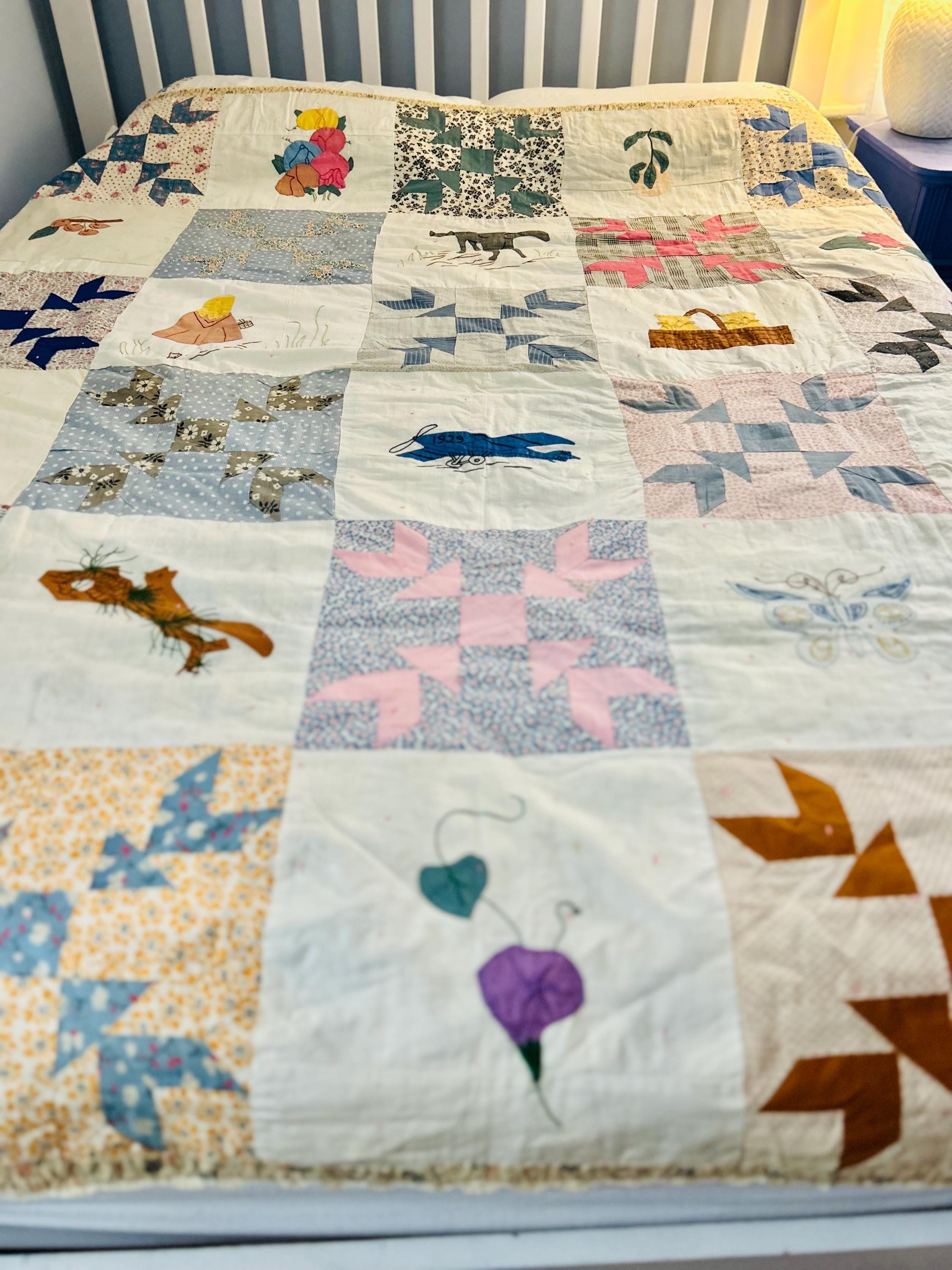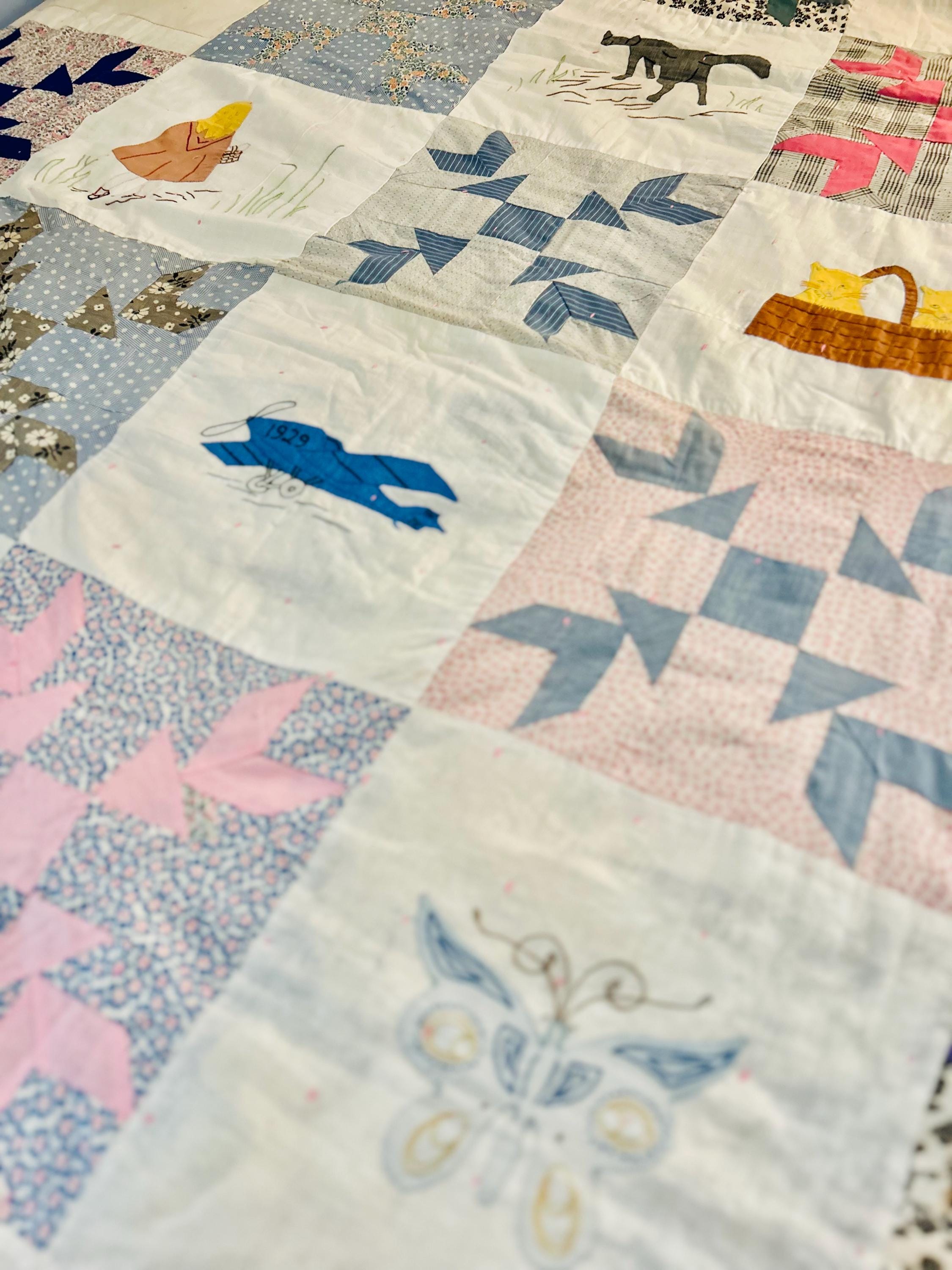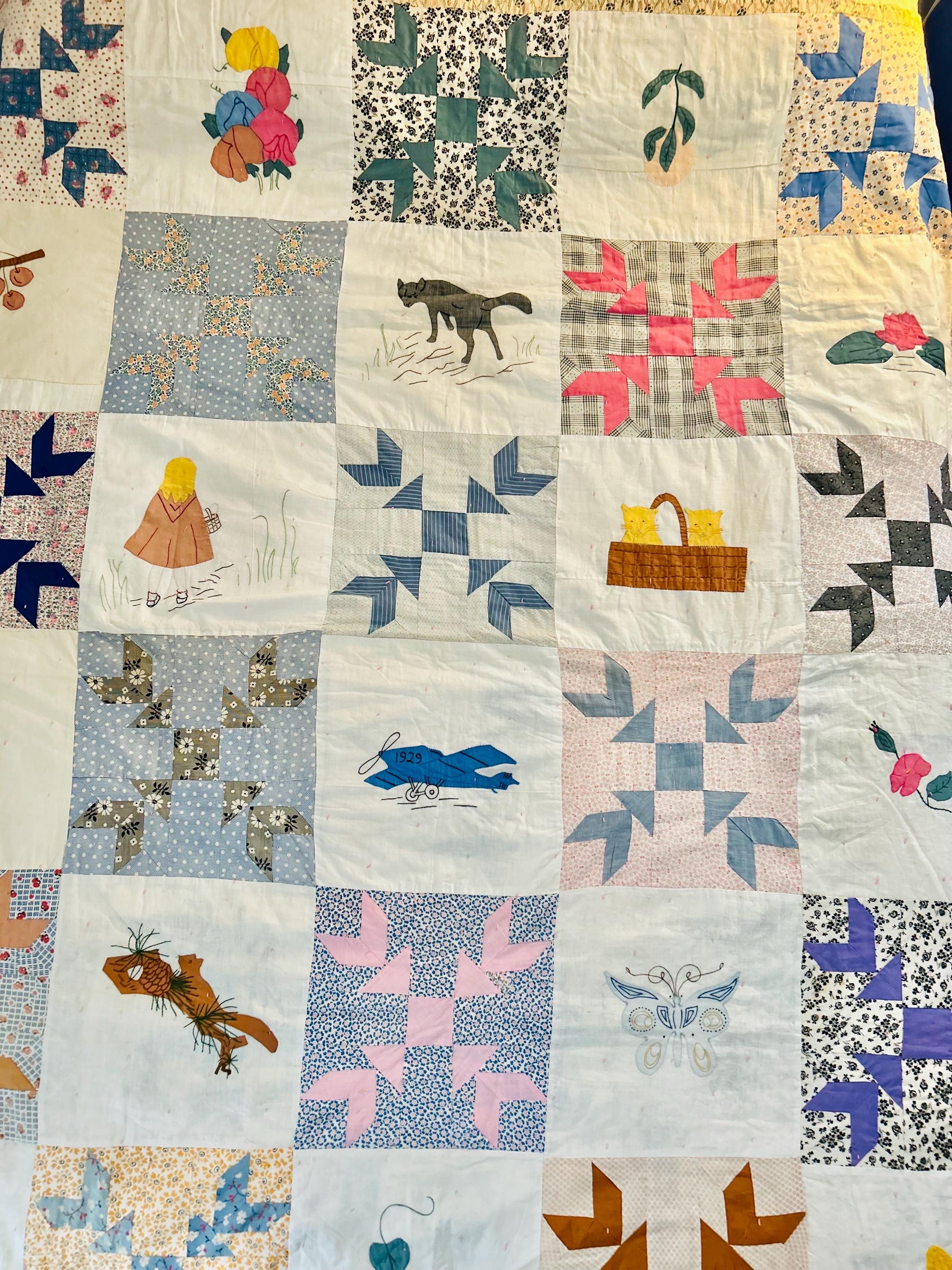 Charming folk-art Sampler Quilt, dated 1929. This is a genuine piece of Depression-era Americana needlework featuring delightful hand-embroidered, hand-appliqued and hand-pieced blocks of kittens, flowers, a butterfly, a pine bough, a squirrel, an airplane and more. The quilt is hand-tied, giving it a light, cozy feel.