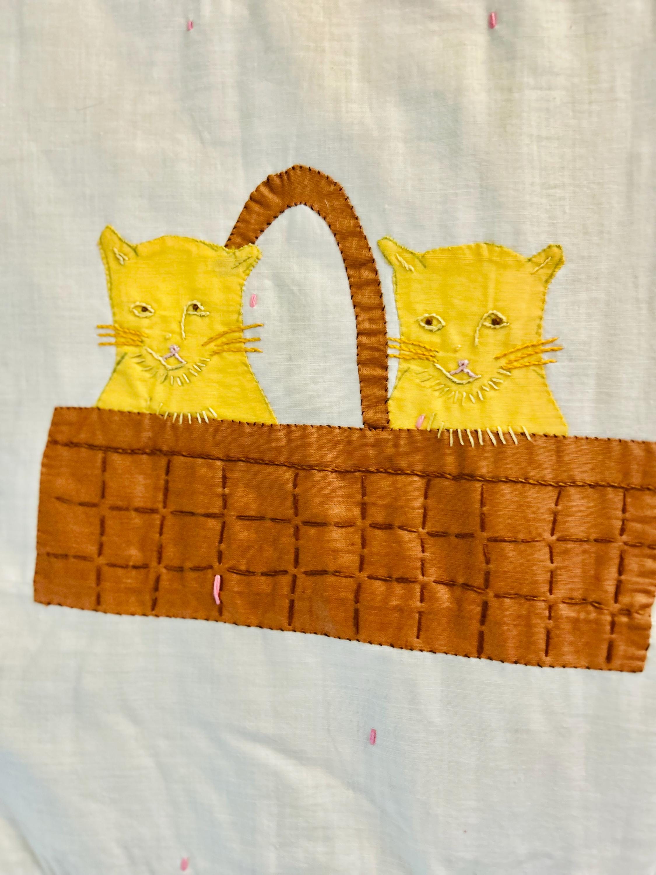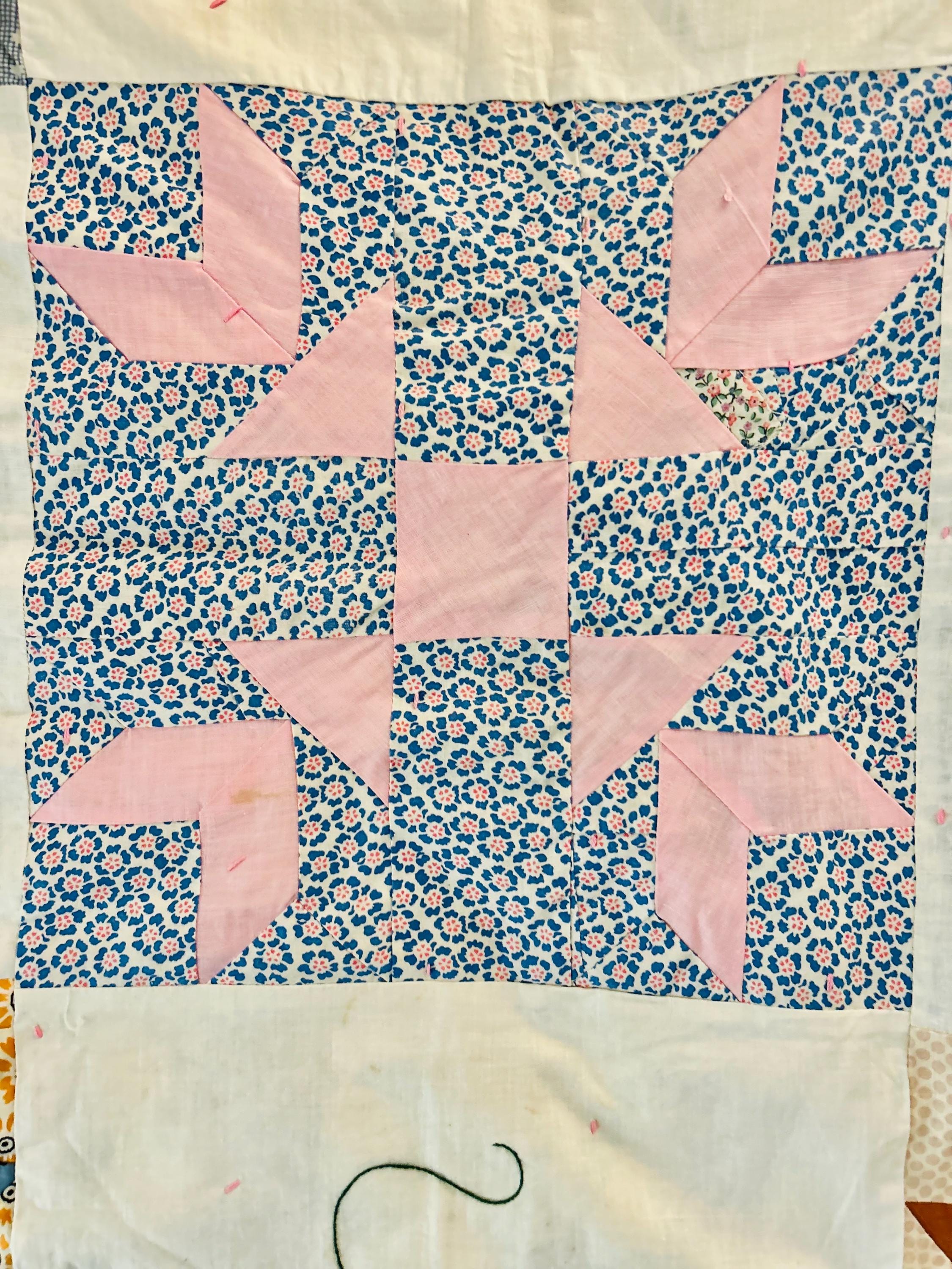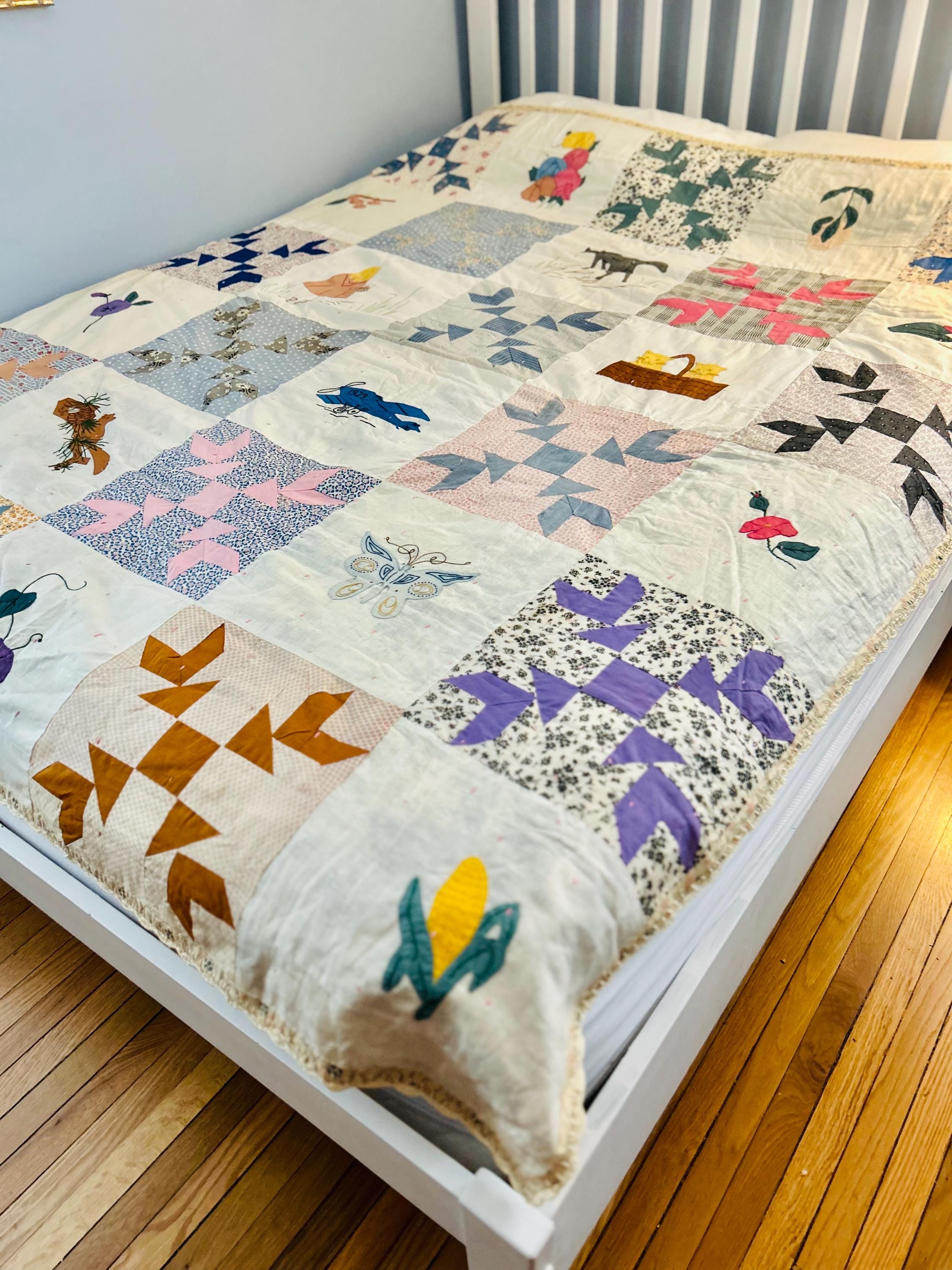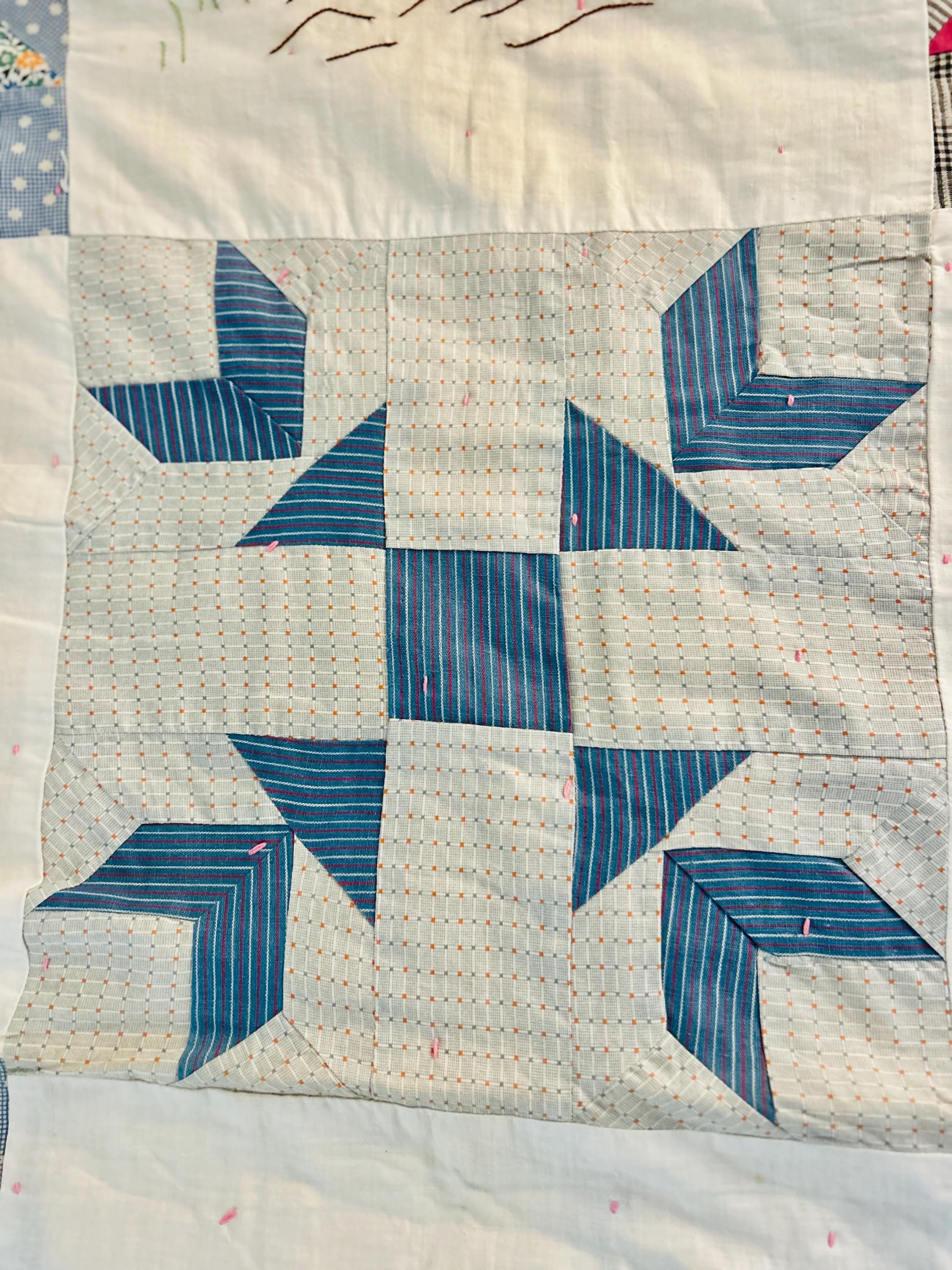 Charming folk-art Sampler Quilt, dated 1929. This is a genuine piece of Depression-era Americana needlework featuring delightful hand-embroidered, hand-appliqued and hand-pieced blocks of kittens, flowers, a butterfly, a pine bough, a squirrel, an airplane and more. The quilt is hand-tied, giving it a light, cozy feel.