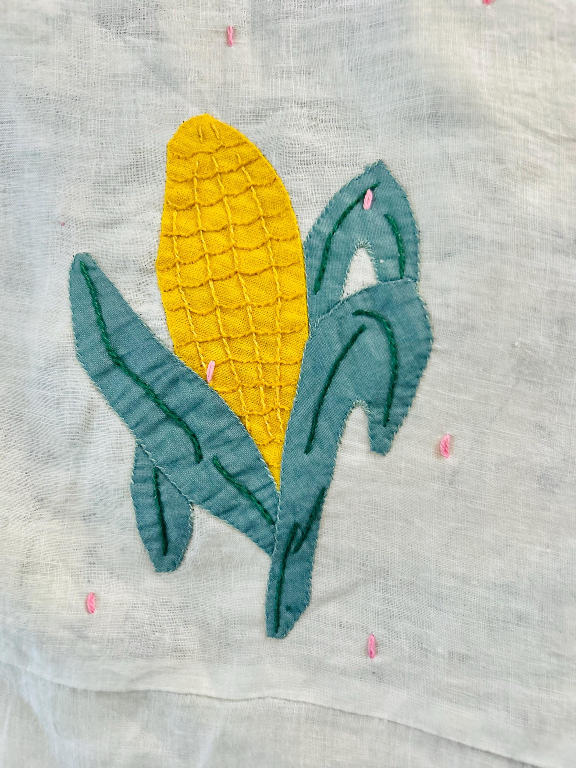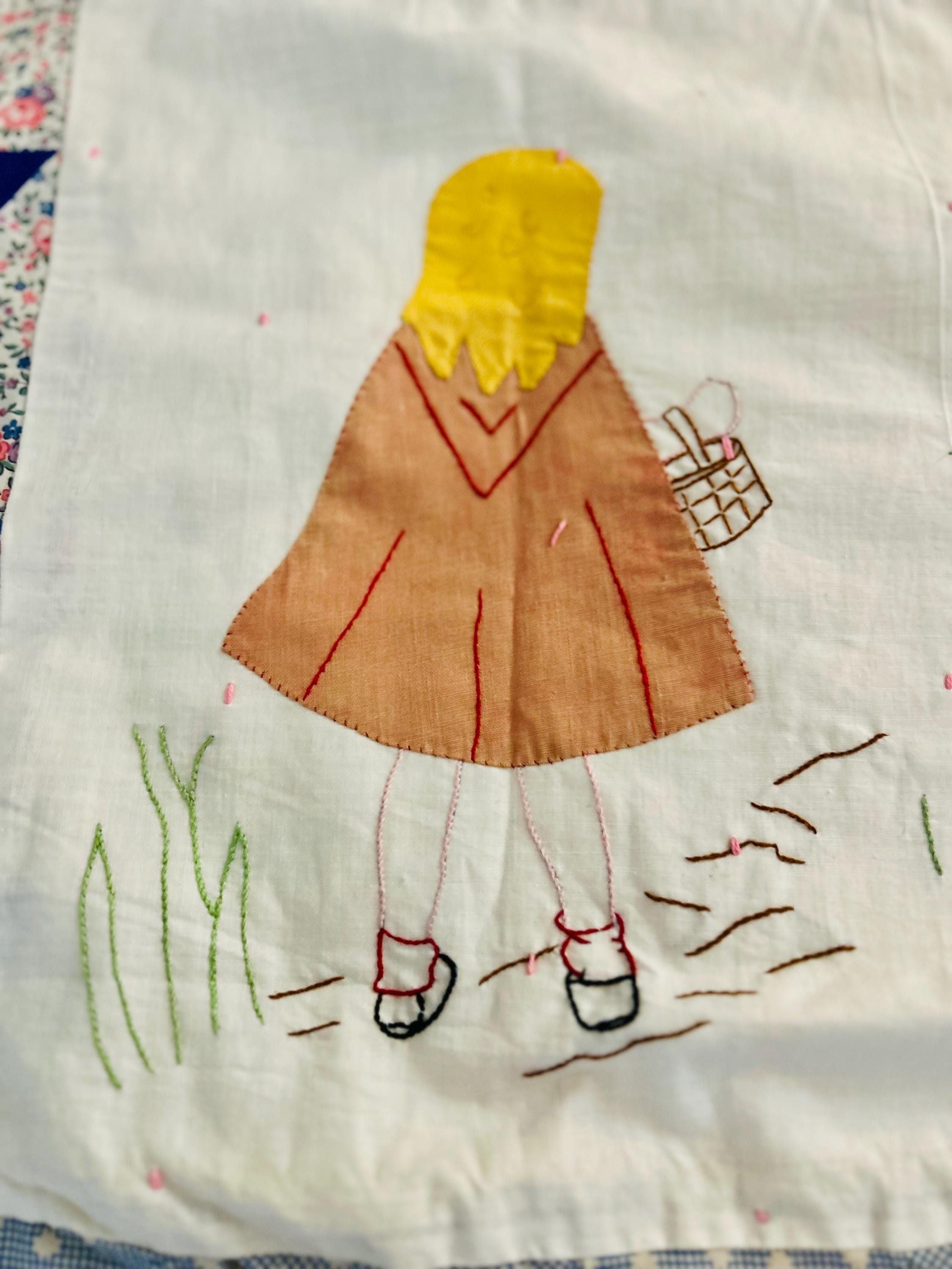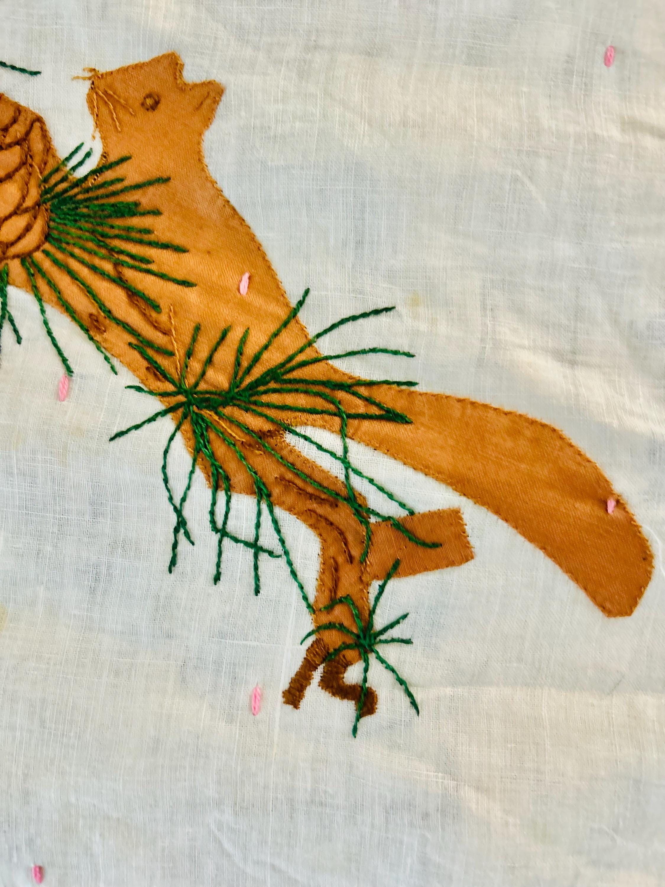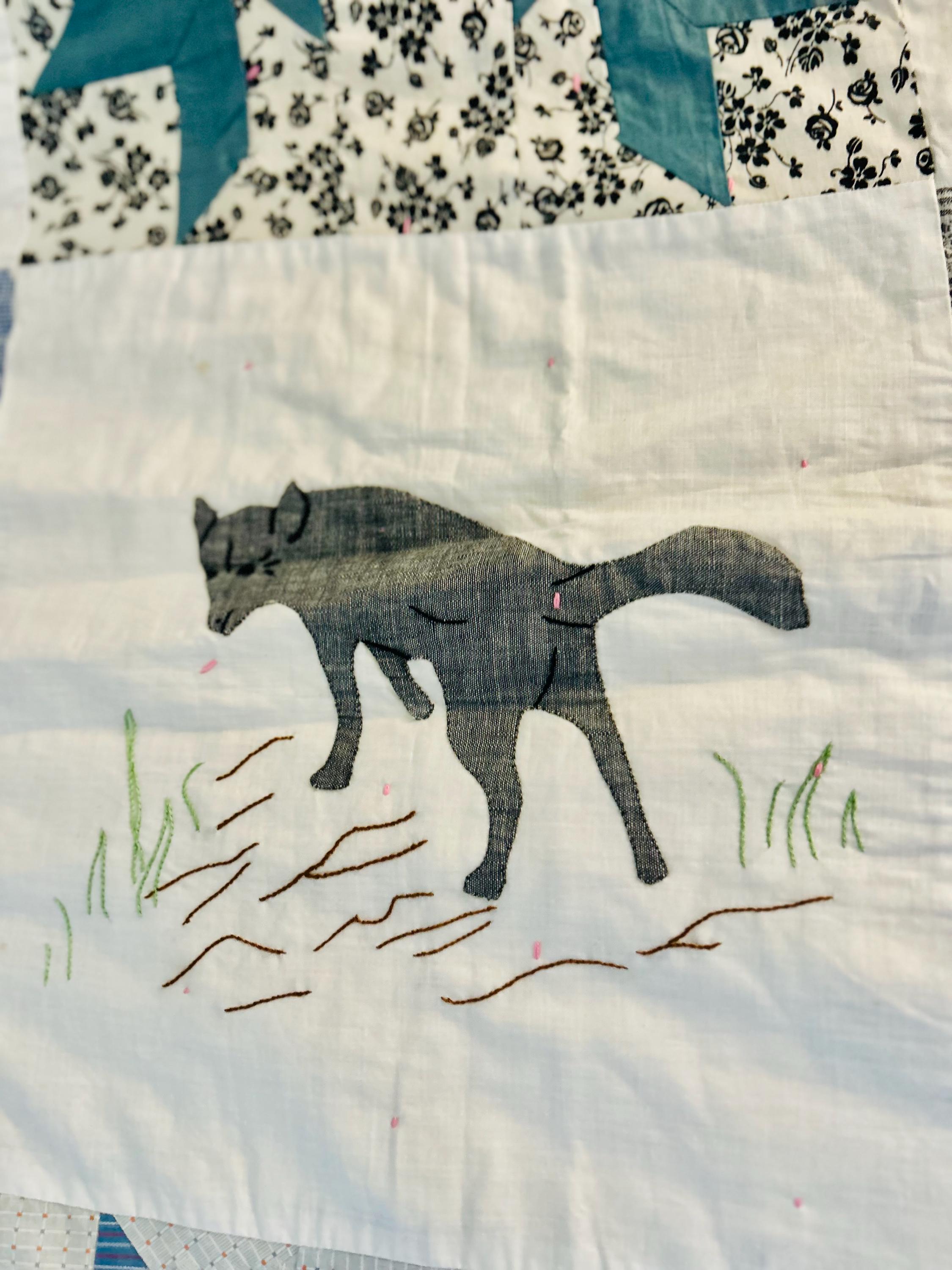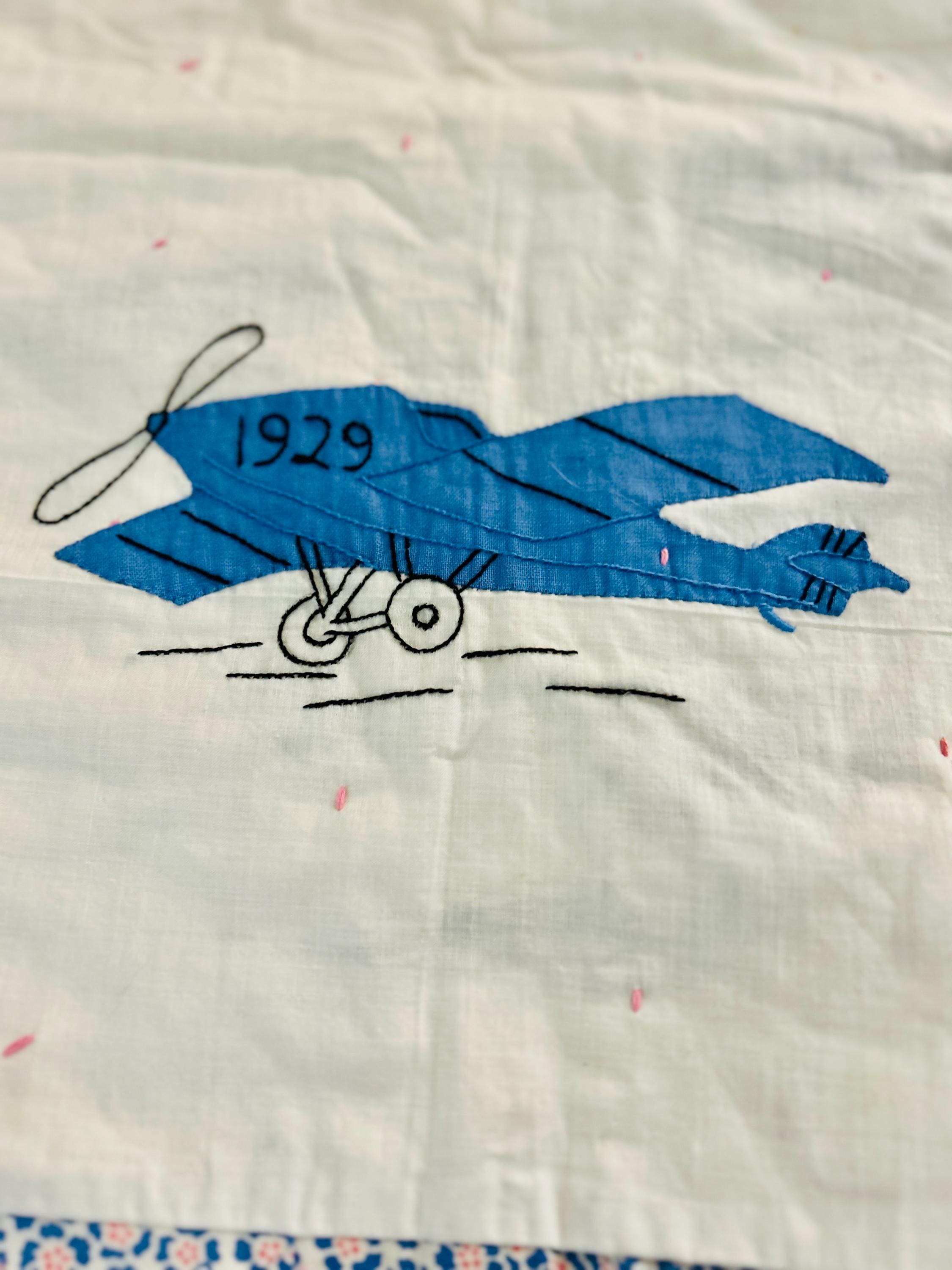 Charming folk-art Sampler Quilt, dated 1929. This is a genuine piece of Depression-era Americana needlework featuring delightful hand-embroidered, hand-appliqued and hand-pieced blocks of kittens, flowers, a butterfly, a pine bough, a squirrel, an airplane and more. The quilt is hand-tied, giving it a light, cozy feel.