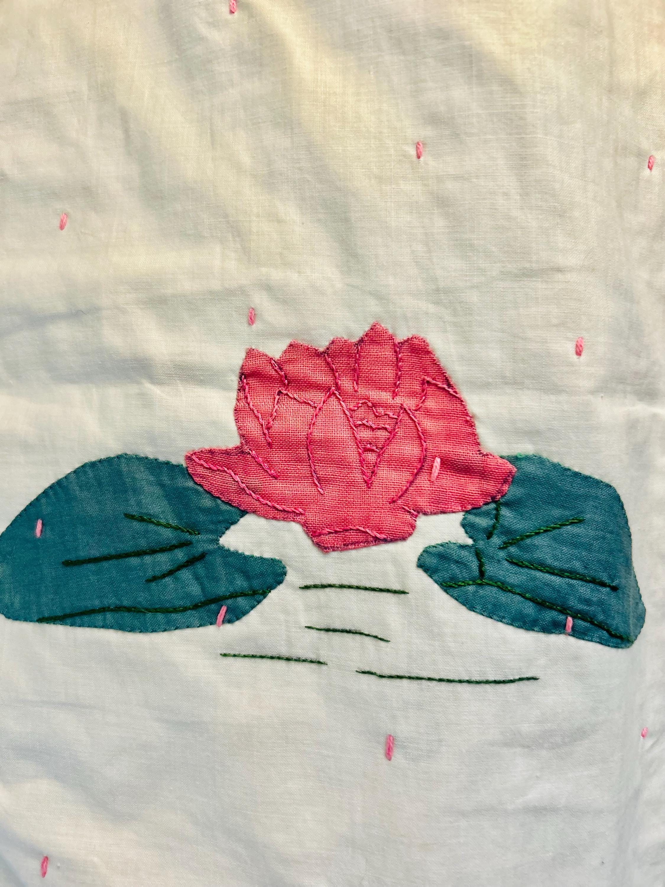 The quilt comes from a smoke-free and pet-free home and measures 66 inches by 76 inches. Shown on a queen-size bed, this quilt has a display sleeve sewn into the back.