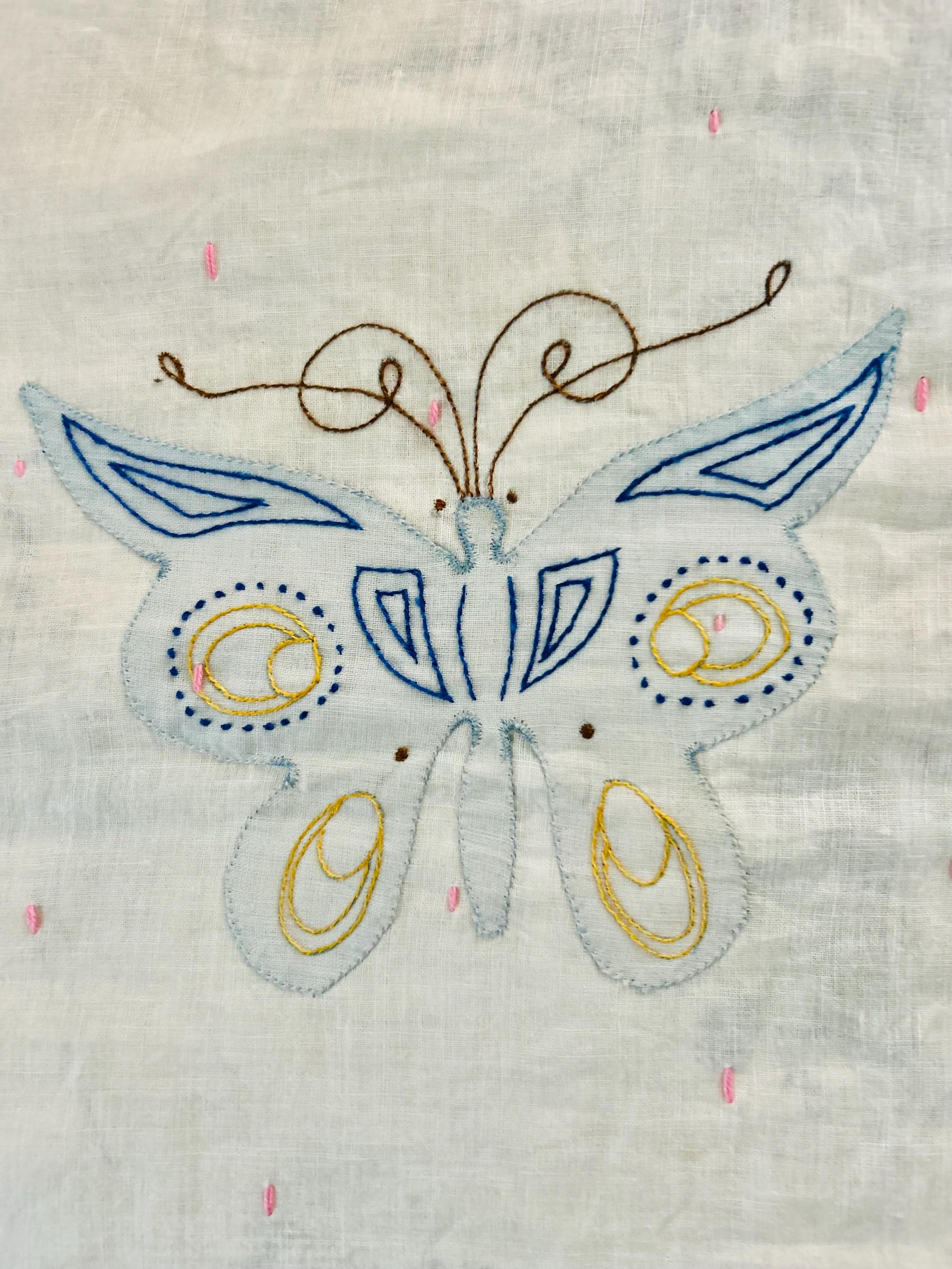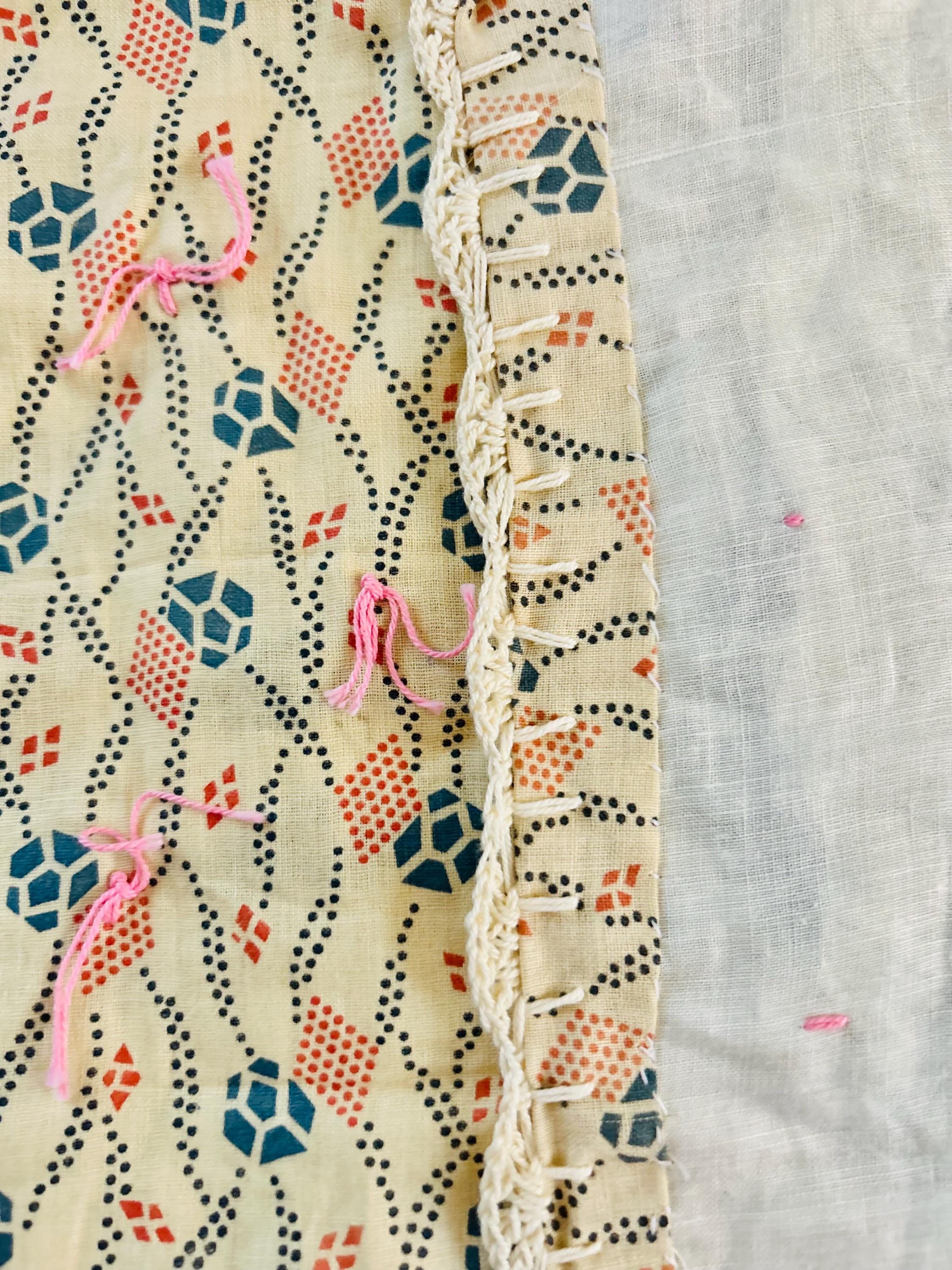 The back is a tan geometric patterned cotton that has been turned to the front and hand-stitched to form the binding. The quilt has been crocheted/tatted around all four sides as a unique and final finishing touch. See photos.