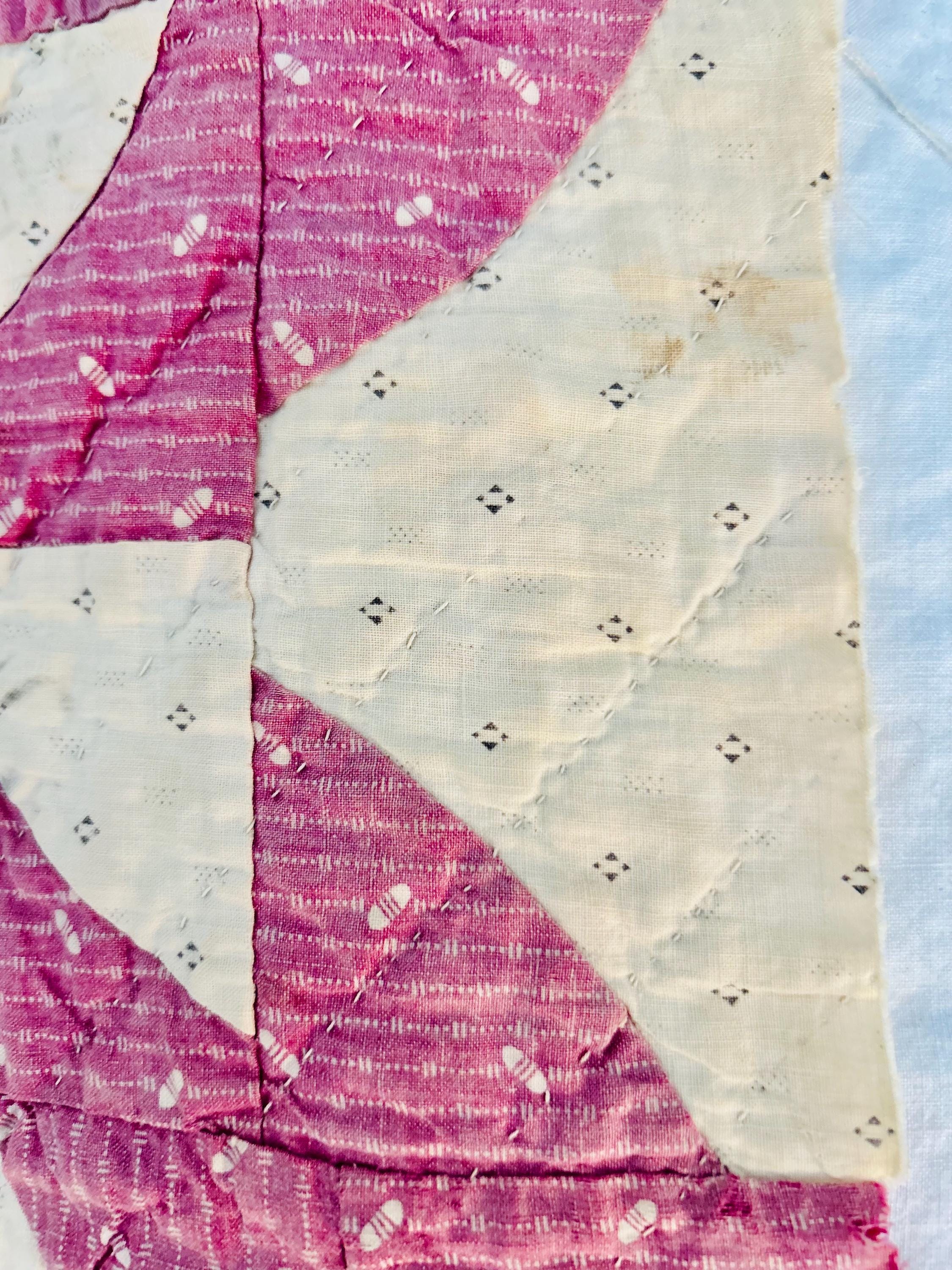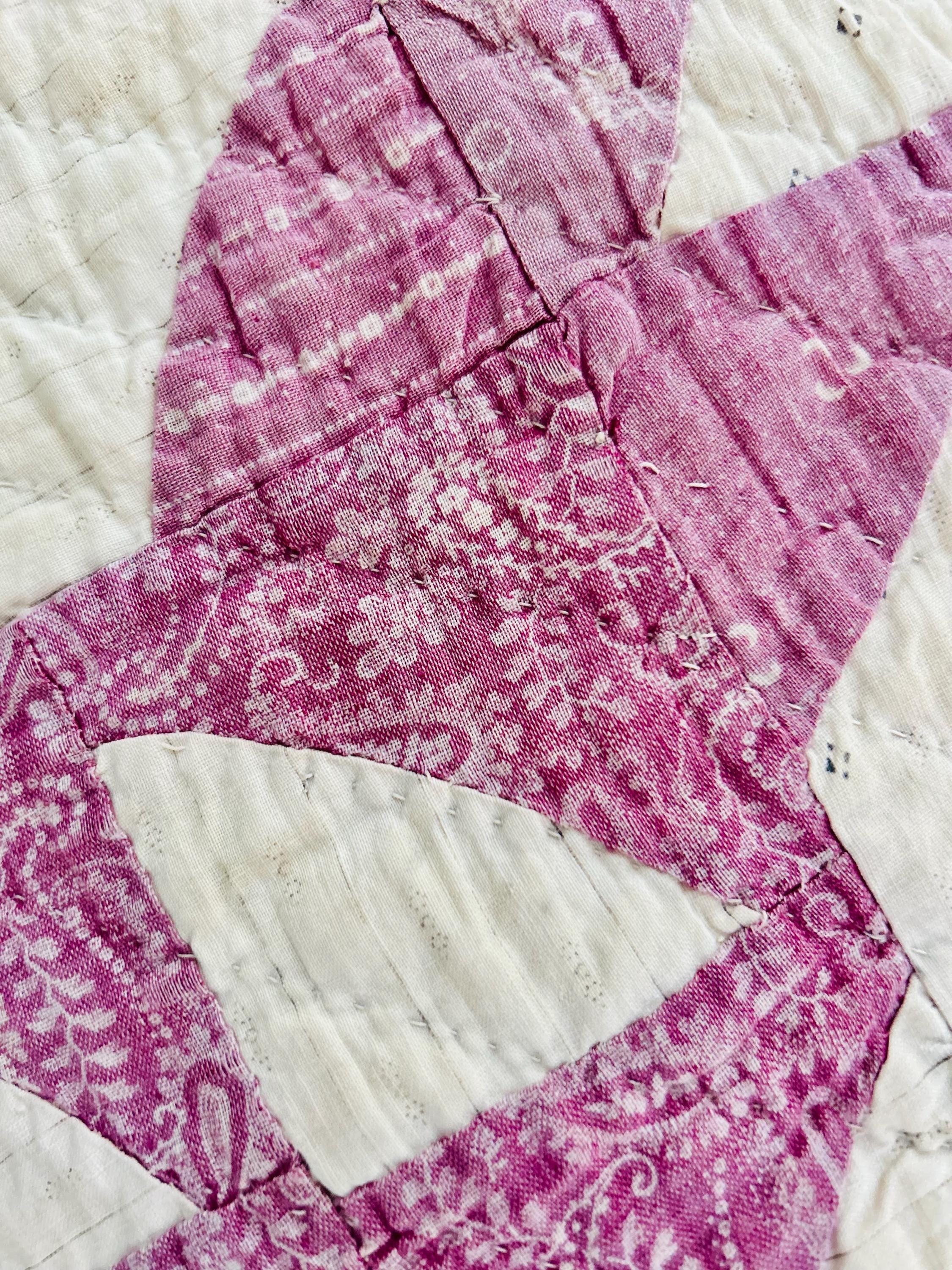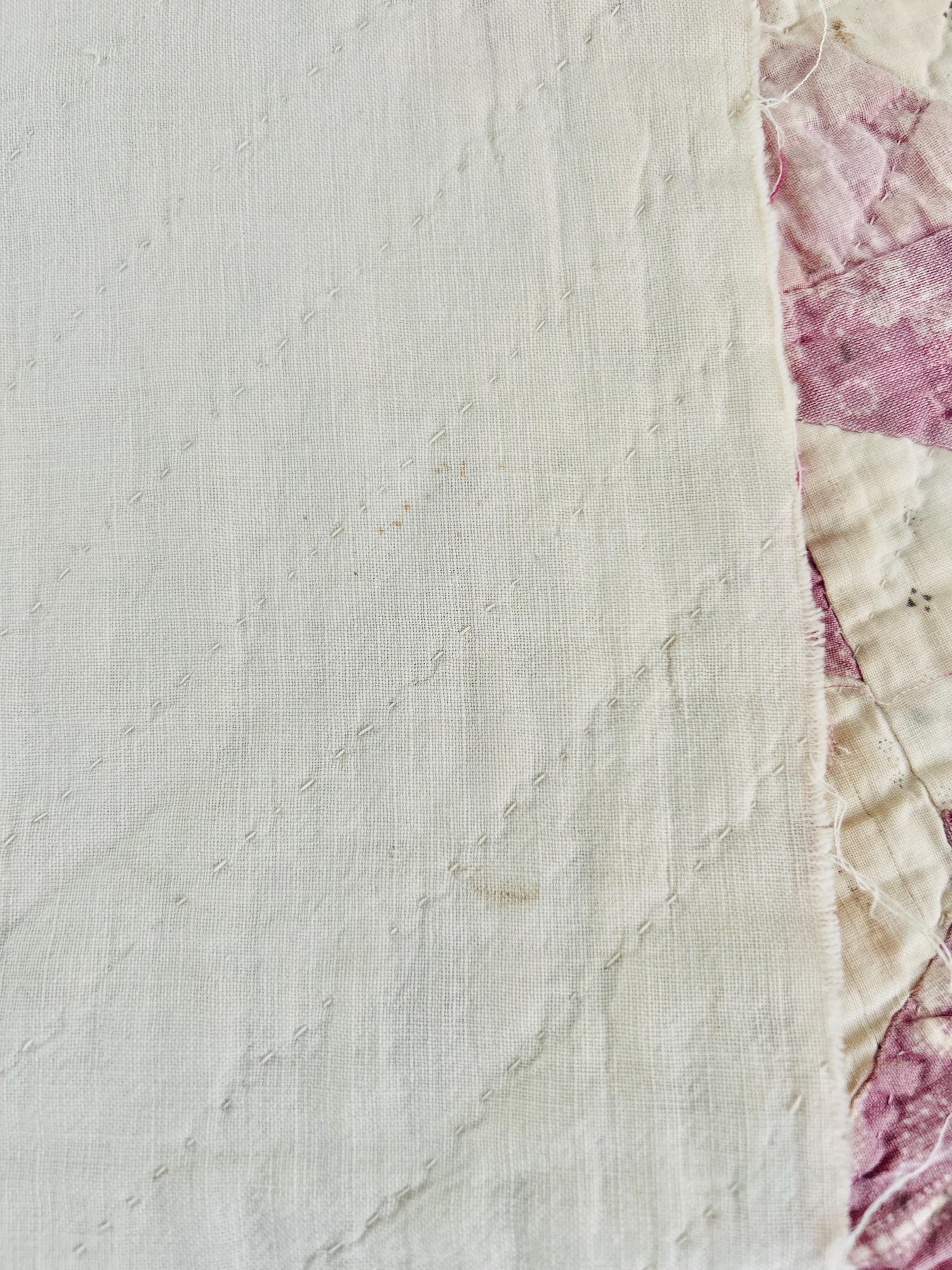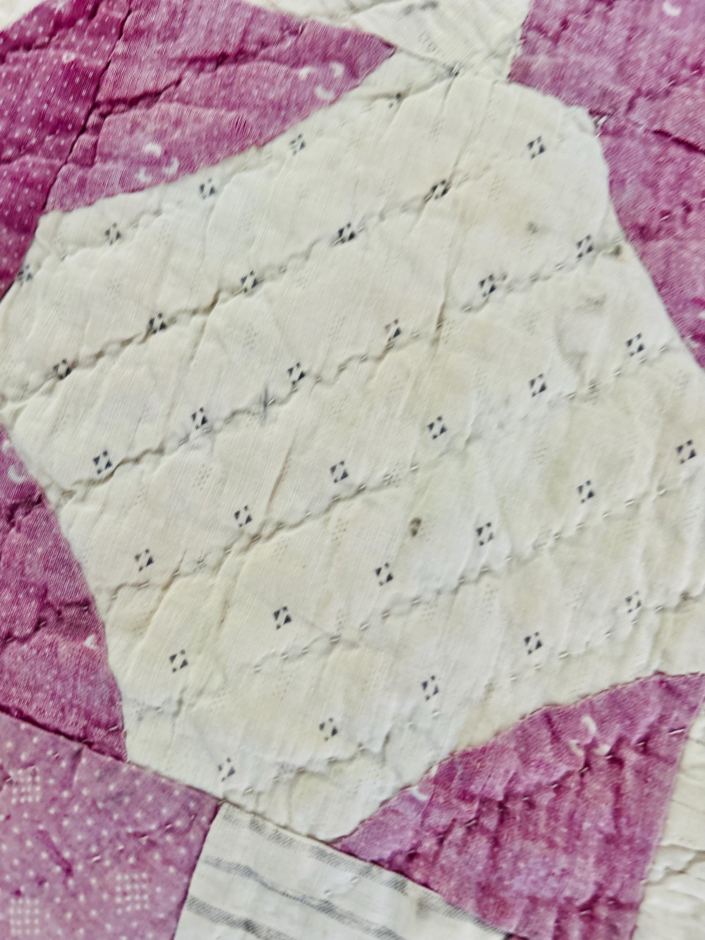 The heart of this quilt is in excellent antique condition - sturdy and intact with no holes, though there are areas of fabric thinning and fading, especially in the pink prints. As stated above, there is also no binding, which has for unknown reasons been removed.