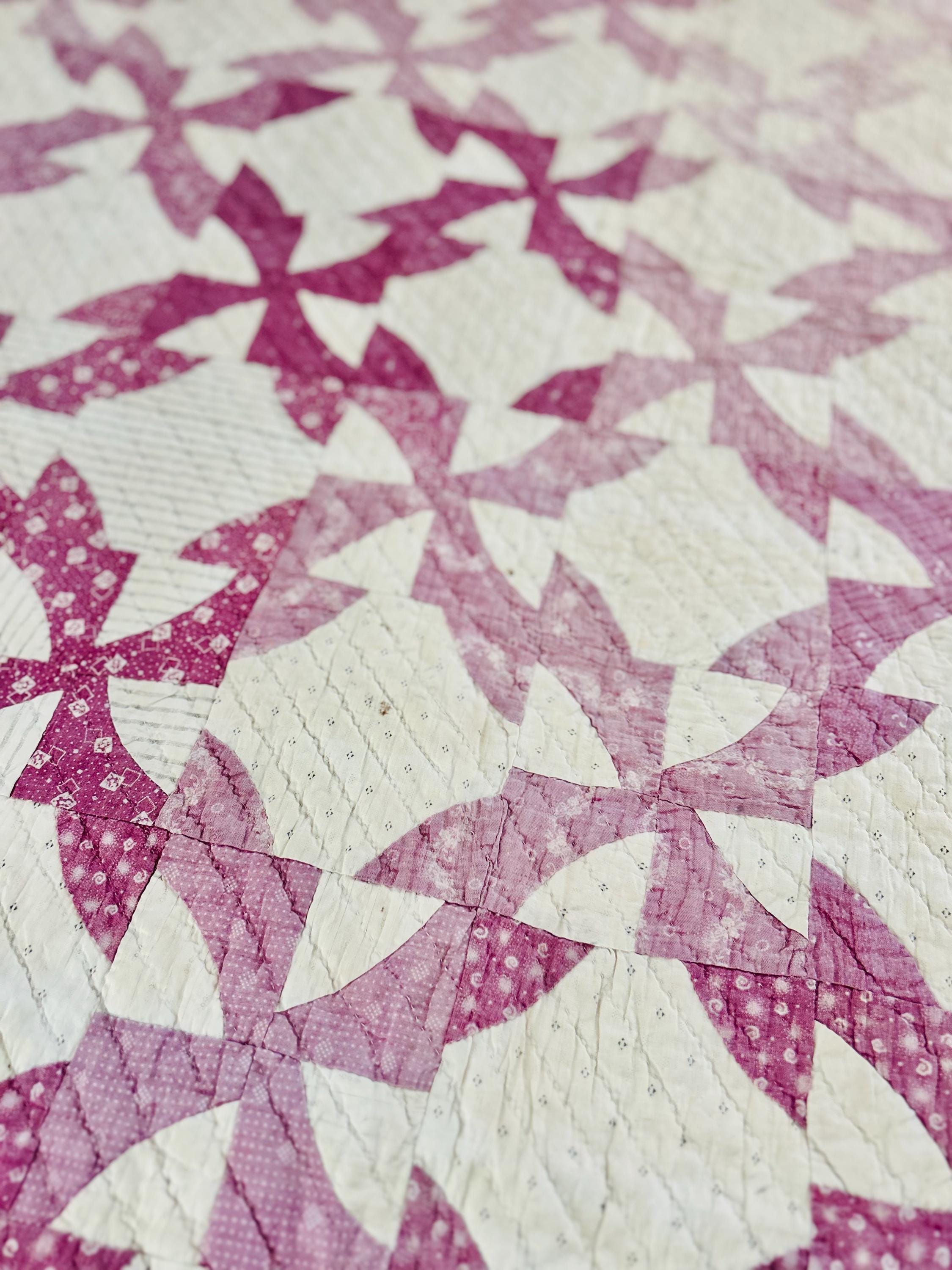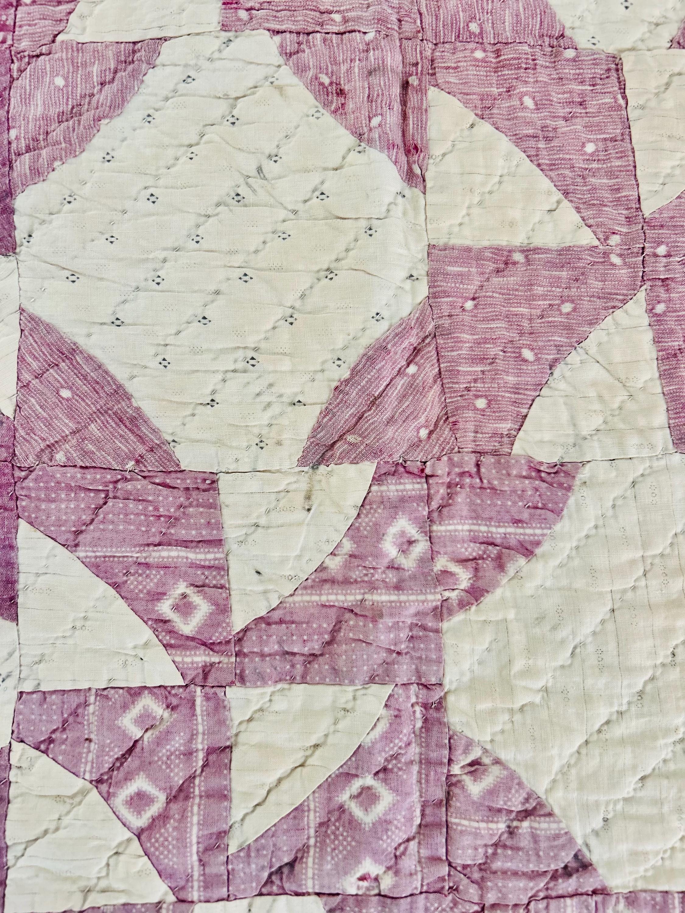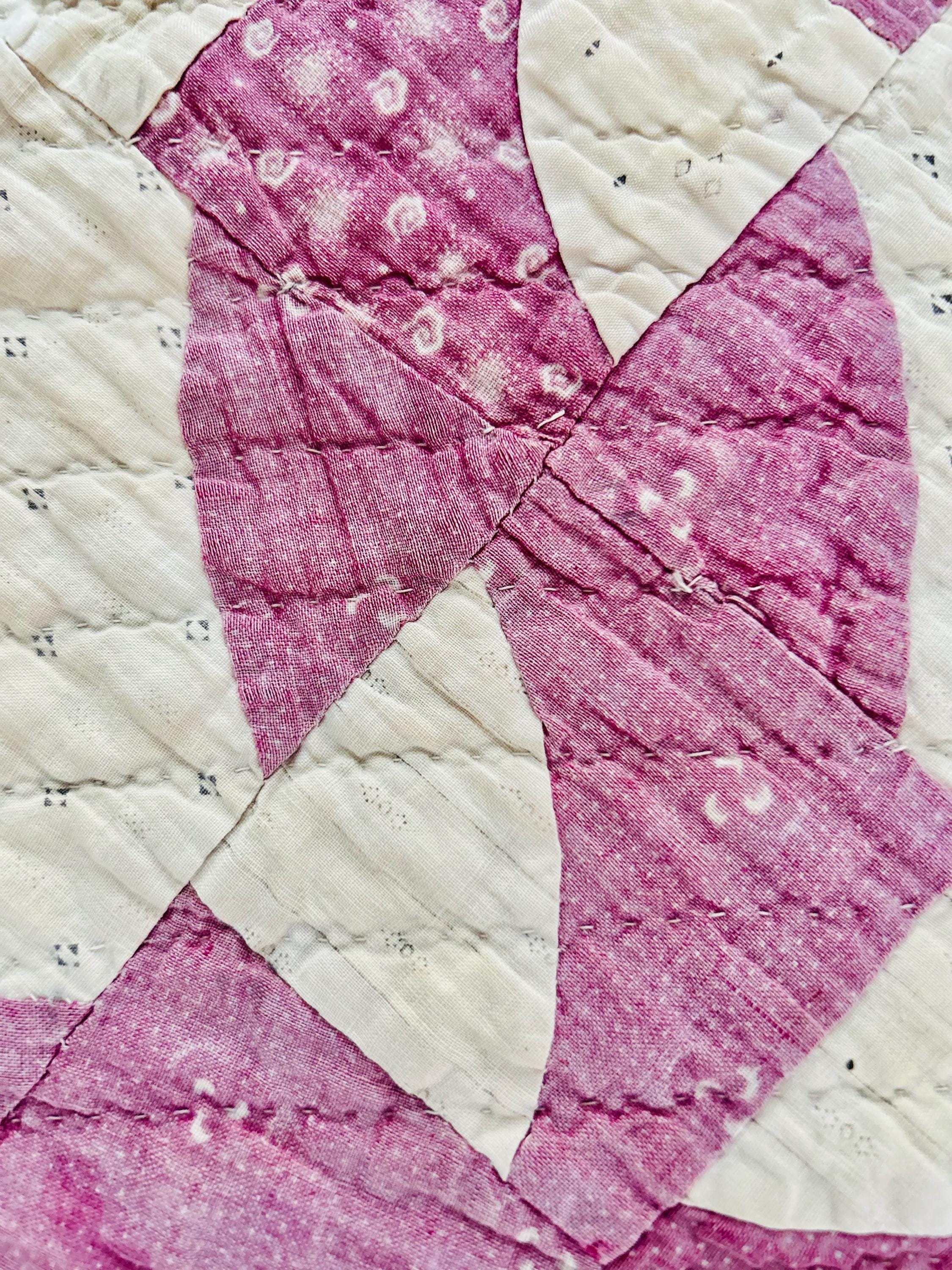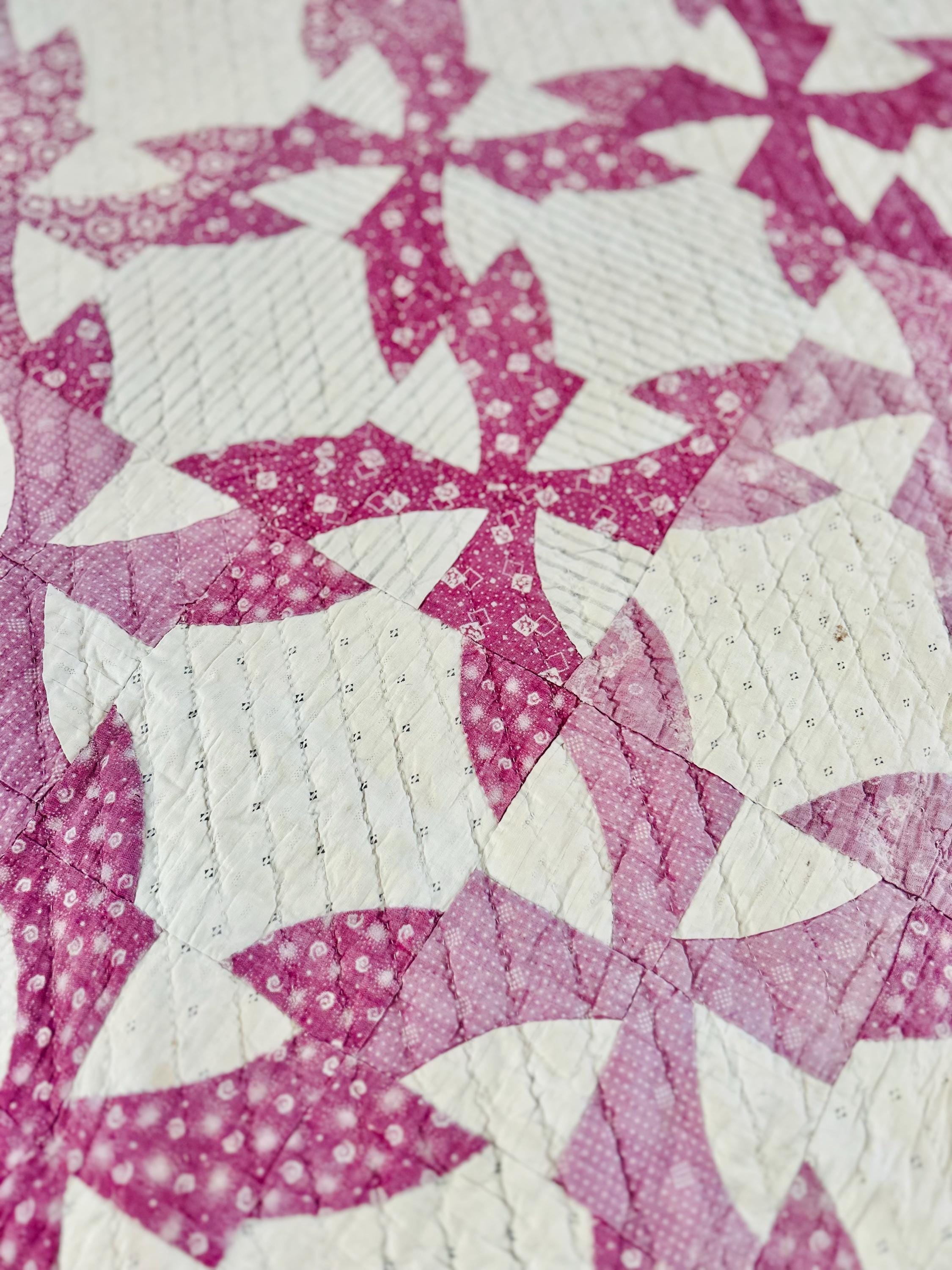 The heart of this quilt is in excellent antique condition - sturdy and intact with no holes, though there are areas of fabric thinning and fading, especially in the pink prints. As stated above, there is also no binding, which has for unknown reasons been removed.