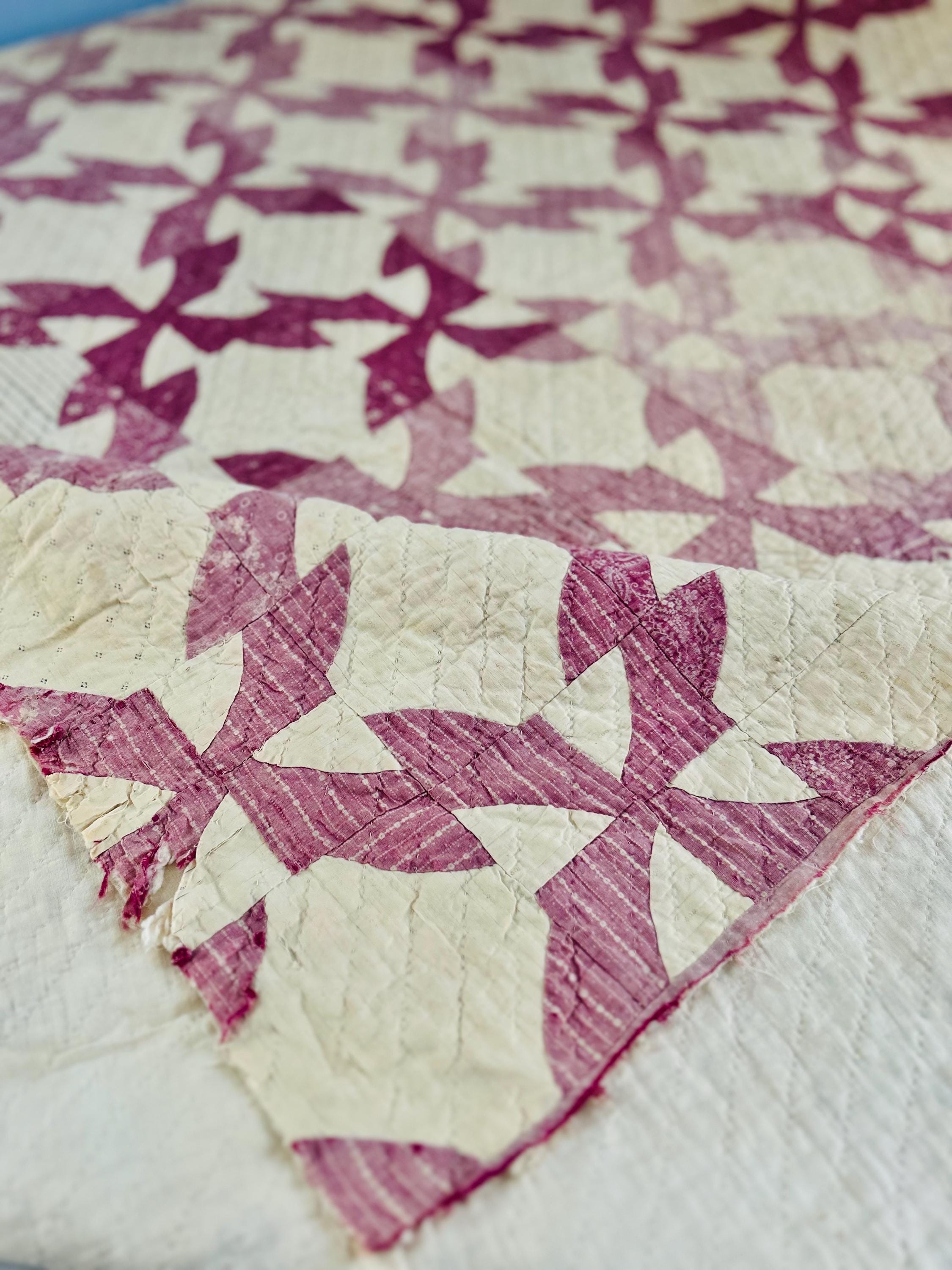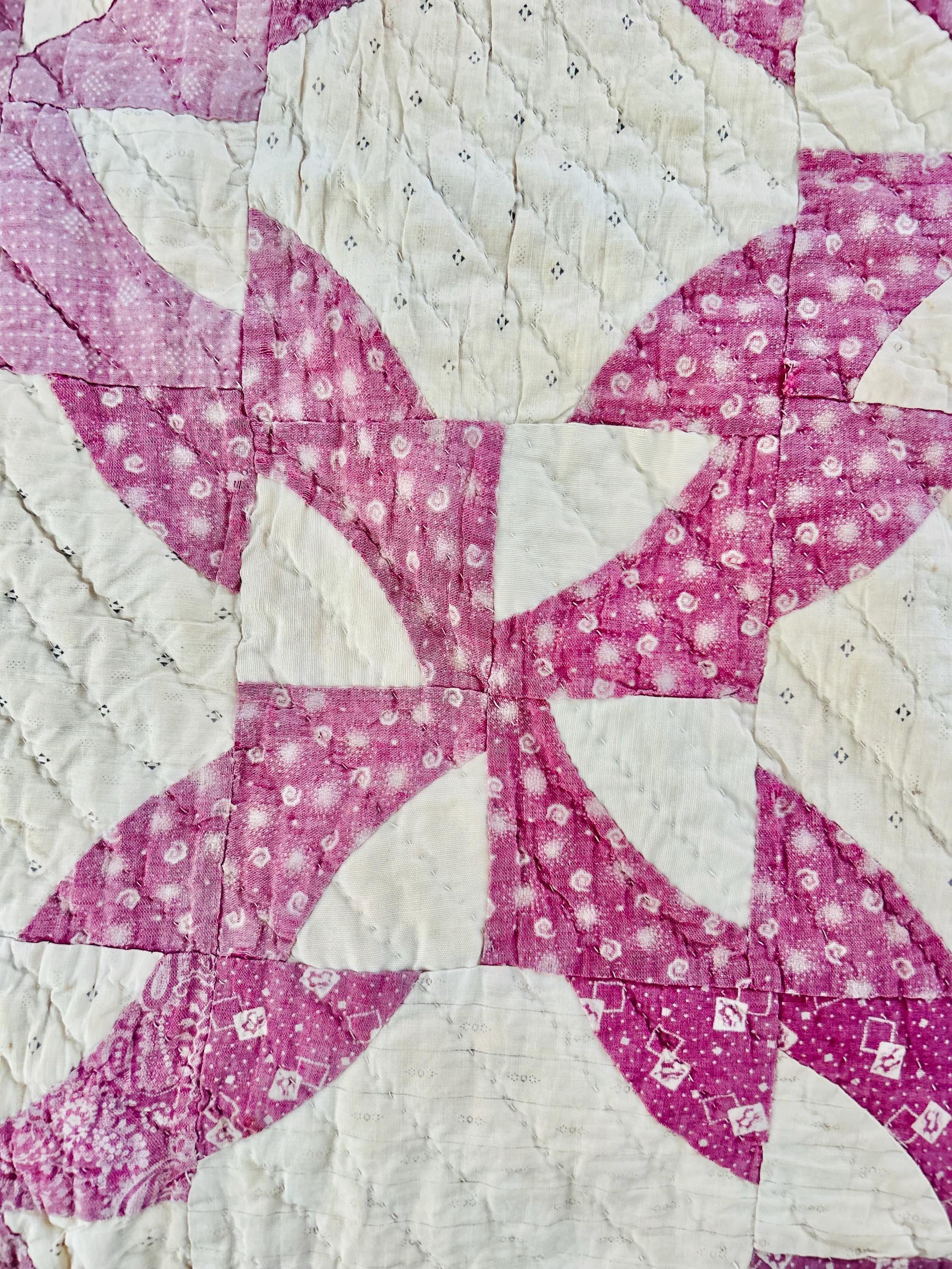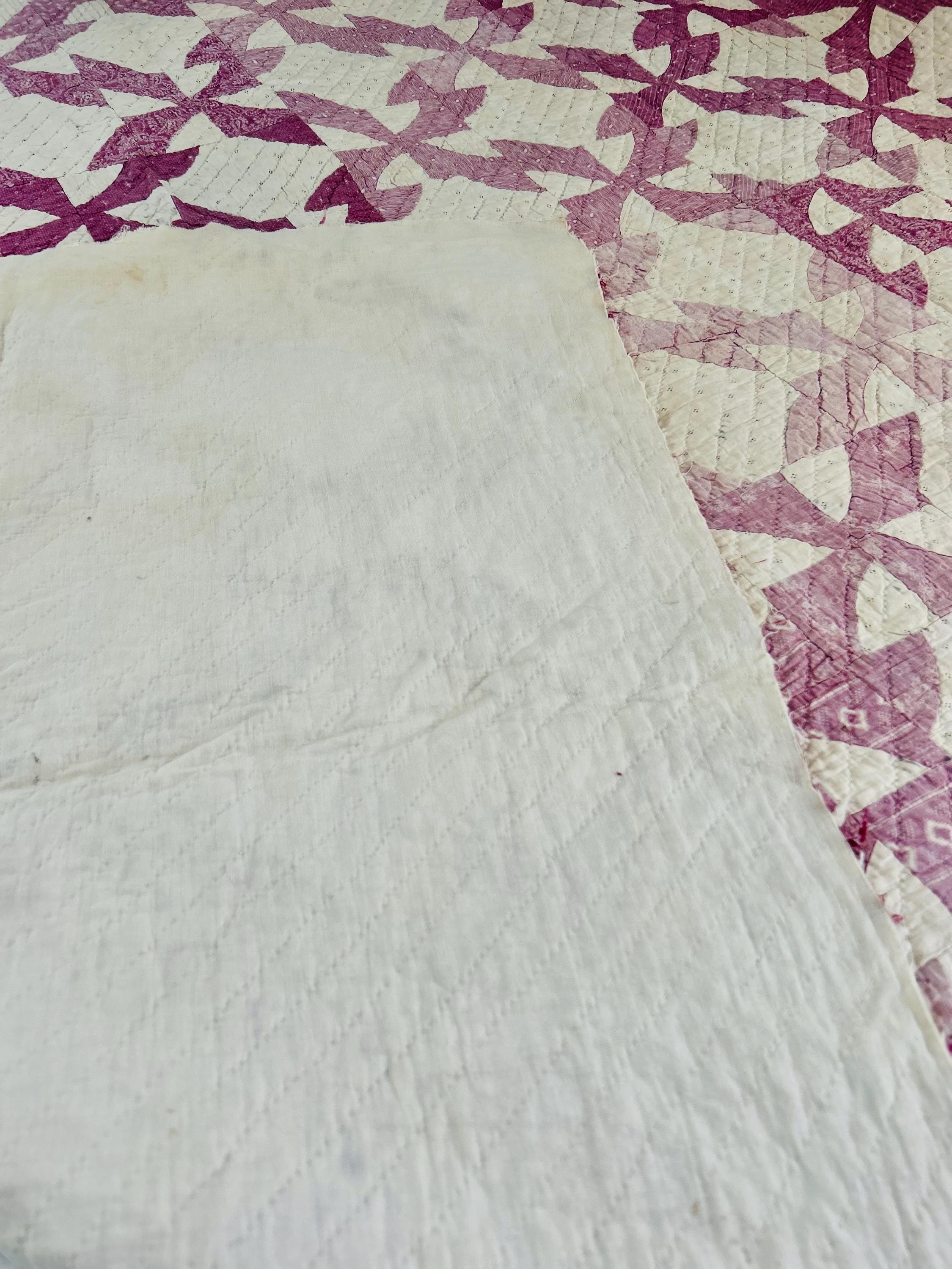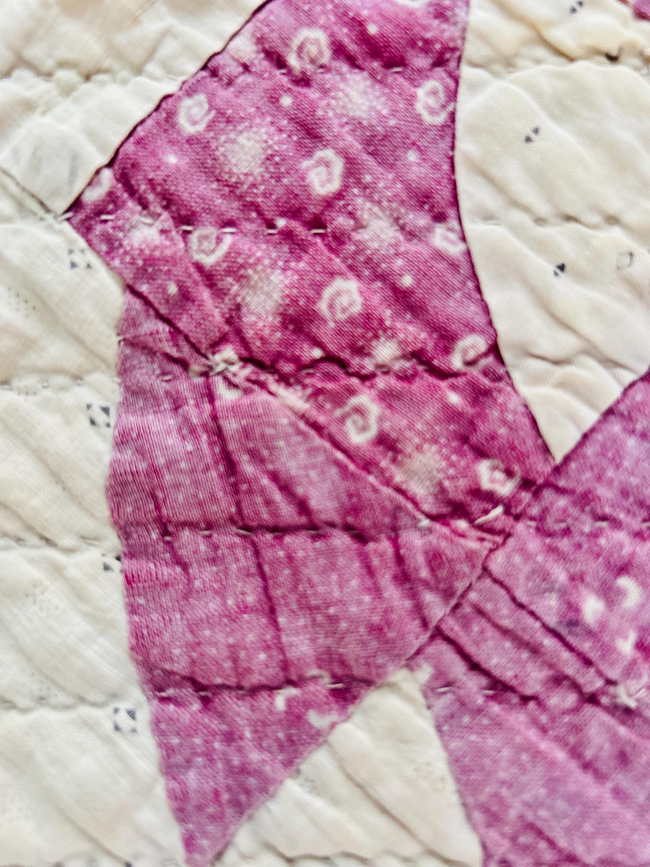 The heart of this quilt is in excellent antique condition - sturdy and intact with no holes, though there are areas of fabric thinning and fading, especially in the pink prints. As stated above, there is also no binding, which has for unknown reasons been removed.