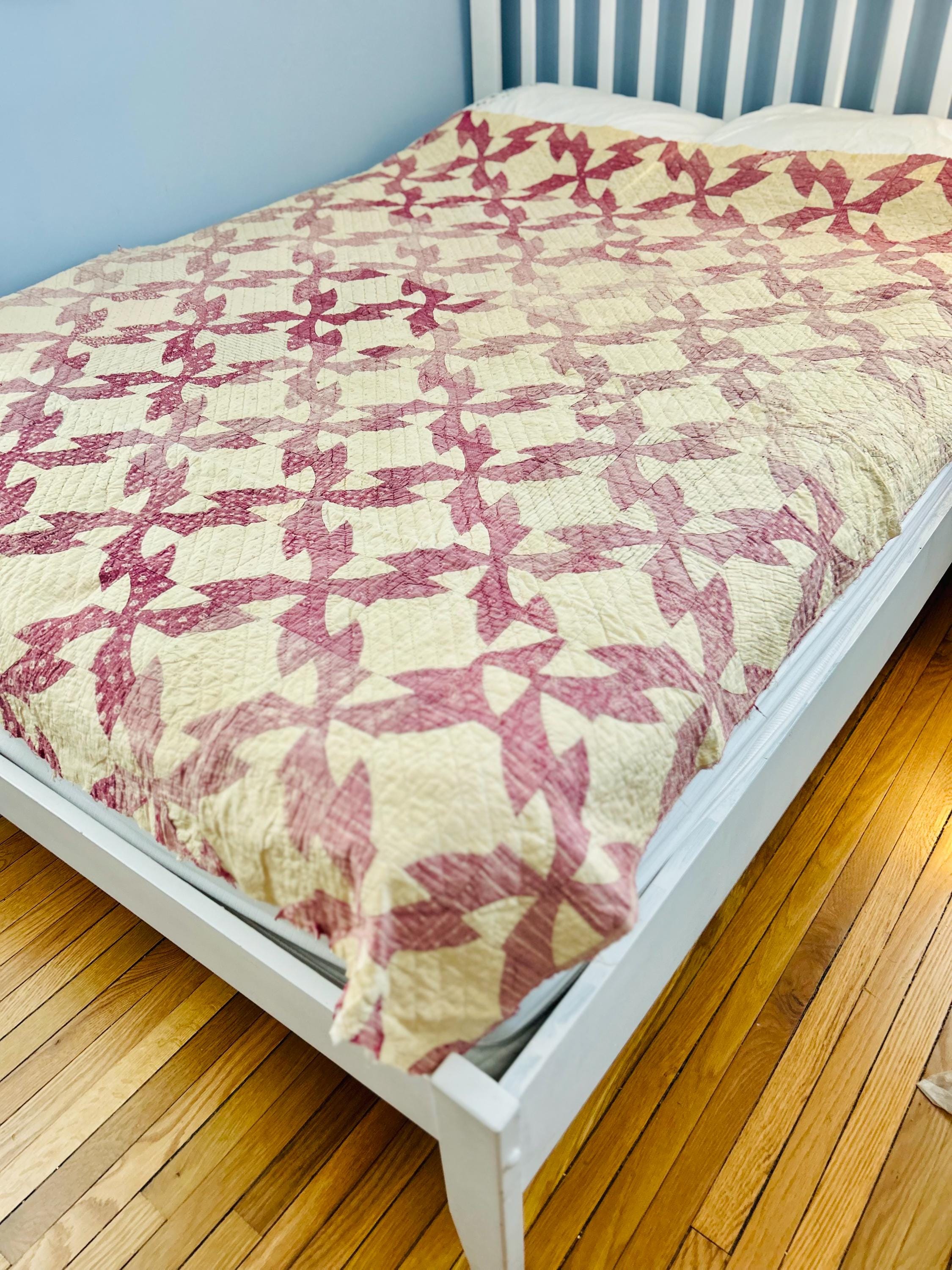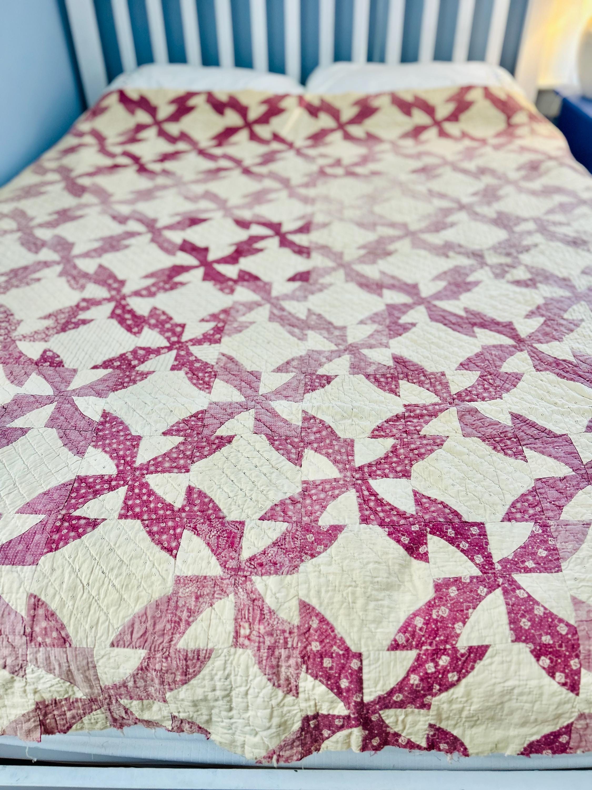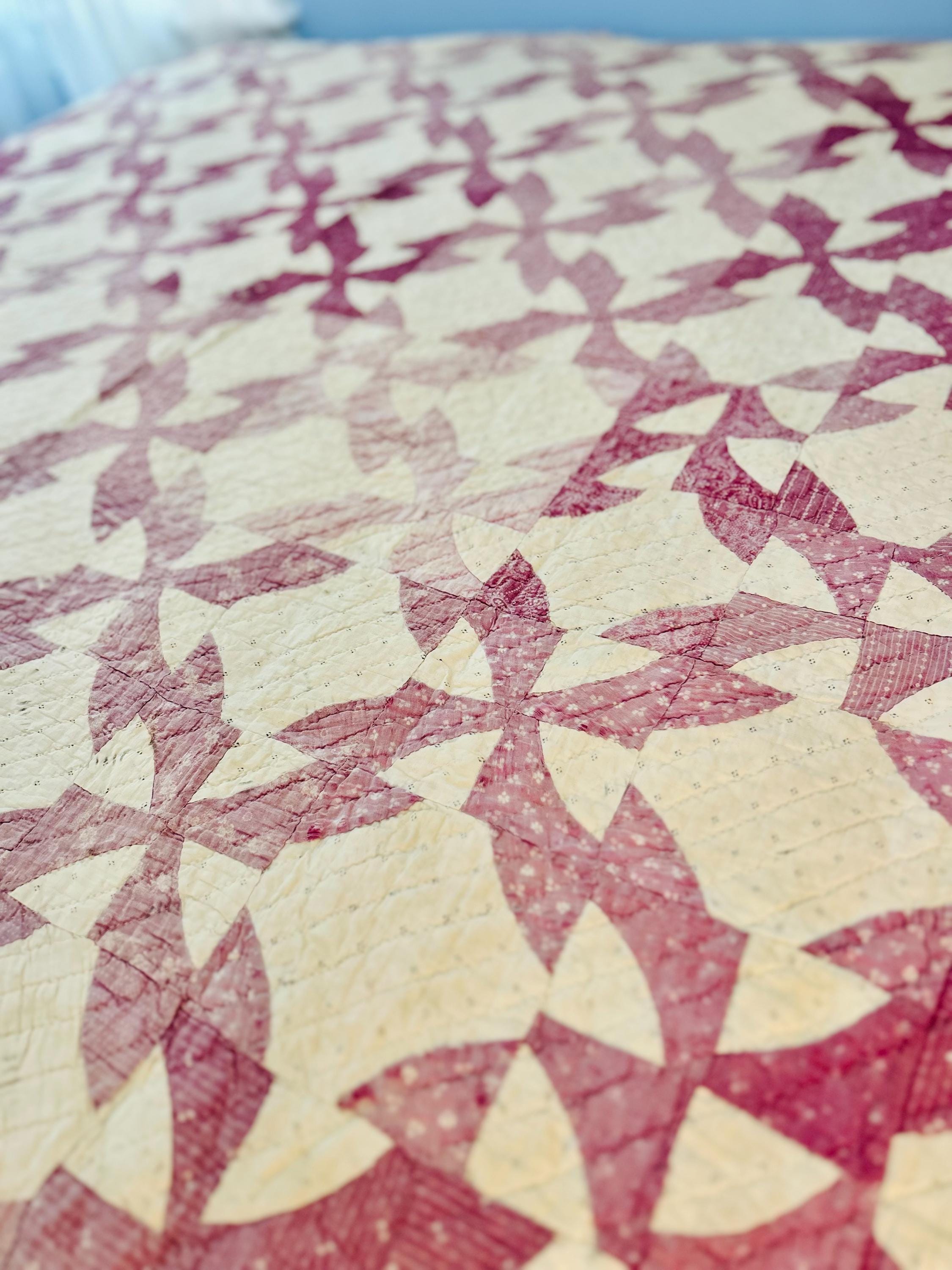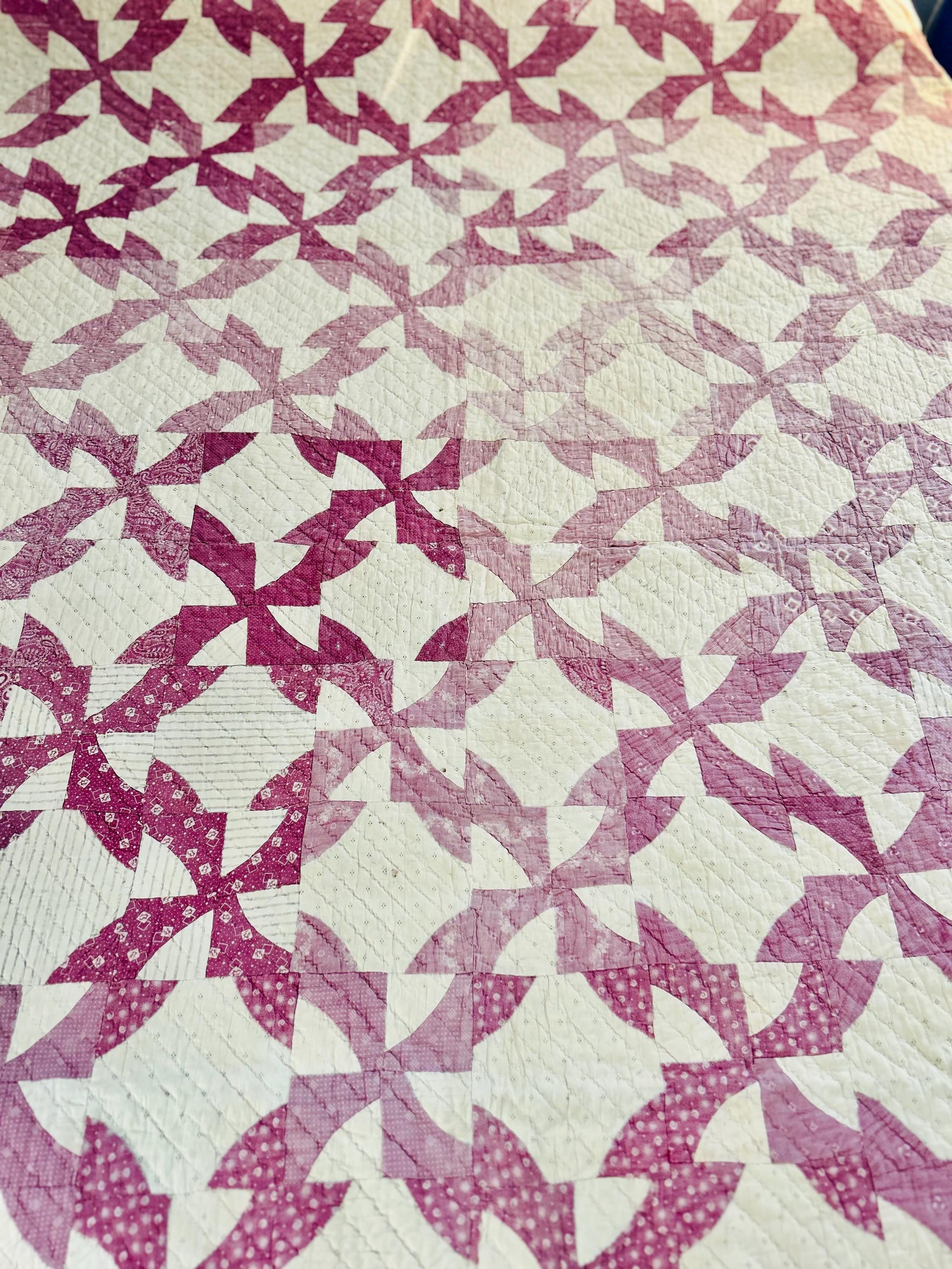 The heart of this quilt is in excellent antique condition - sturdy and intact with no holes, though there are areas of fabric thinning and fading, especially in the pink prints. As stated above, there is also no binding, which has for unknown reasons been removed.