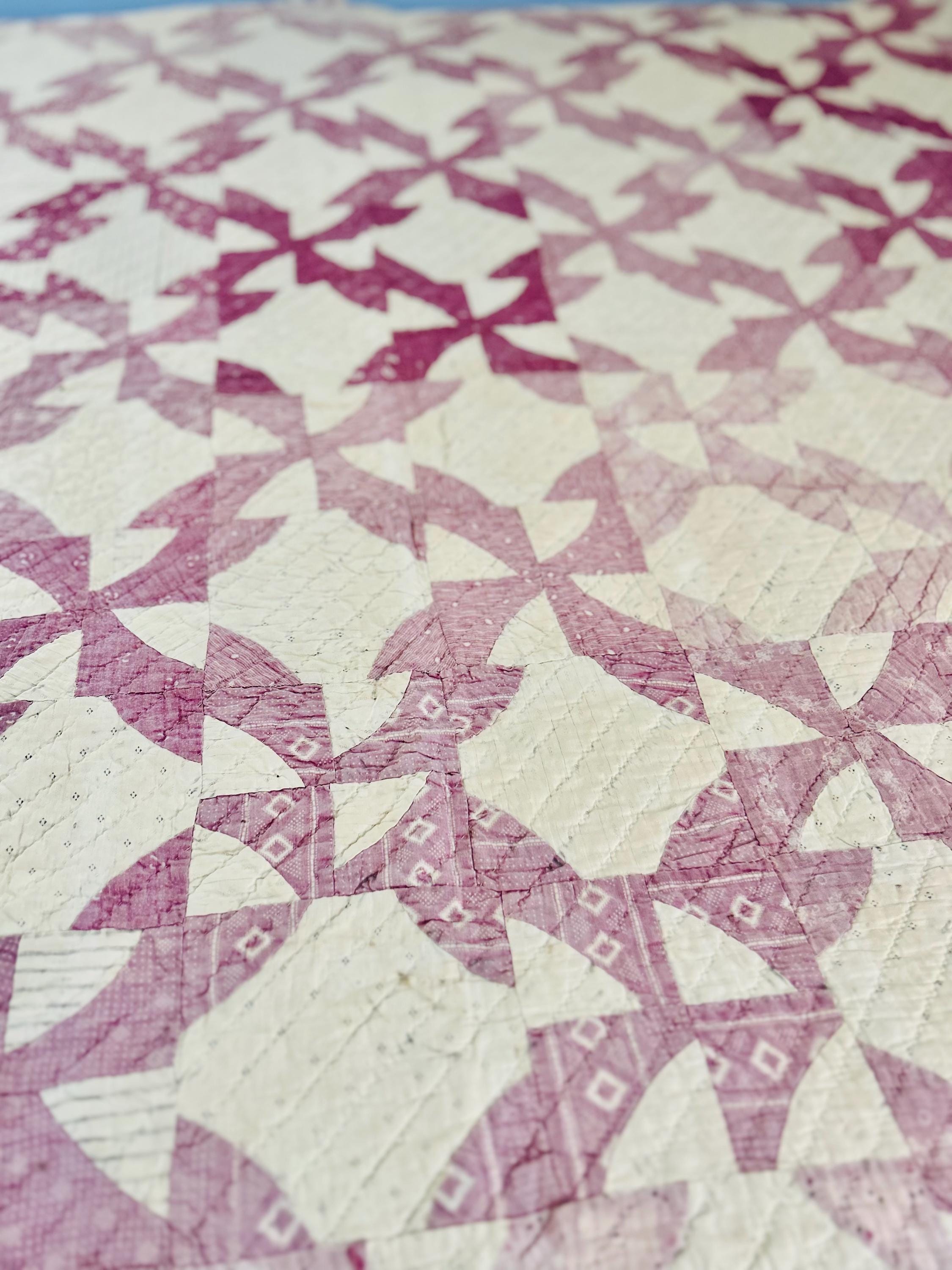 This beautiful antique quilt in a classic Falling Timber pattern is pieced in double-pink calicos and tiny shirting-print whites dating from about 1885 to the 1890s. Entirely hand-stitched and hand-quilted, the quilting runs across the Falling Timber blocks in neat and expertly quilted diagonals.