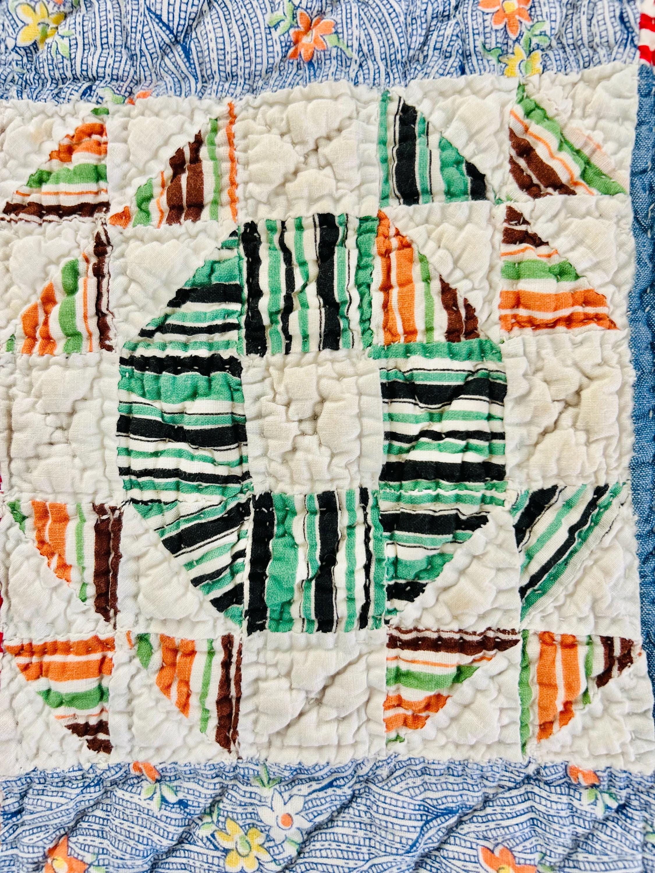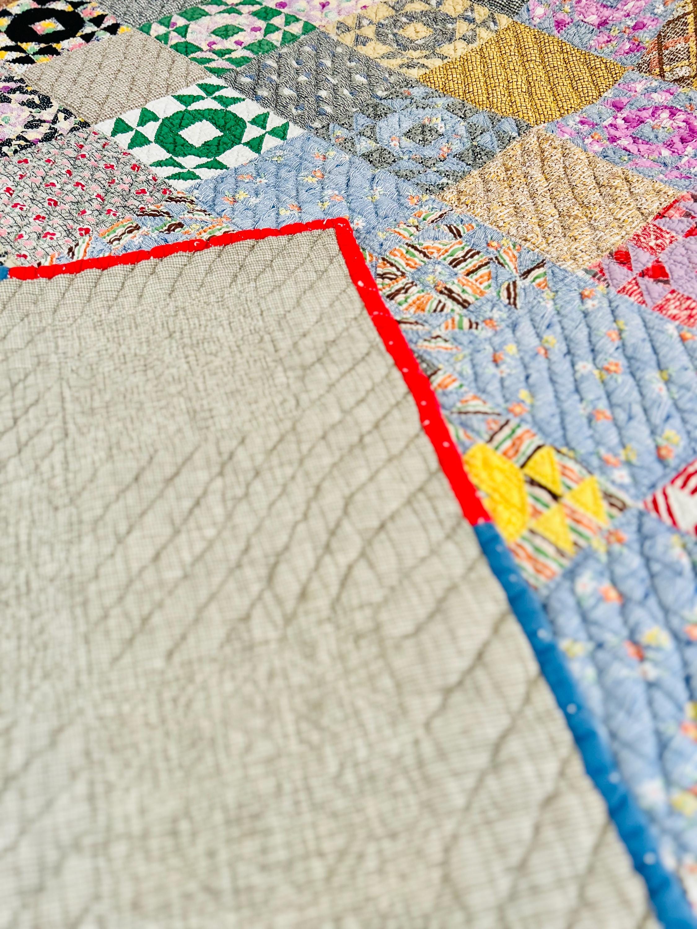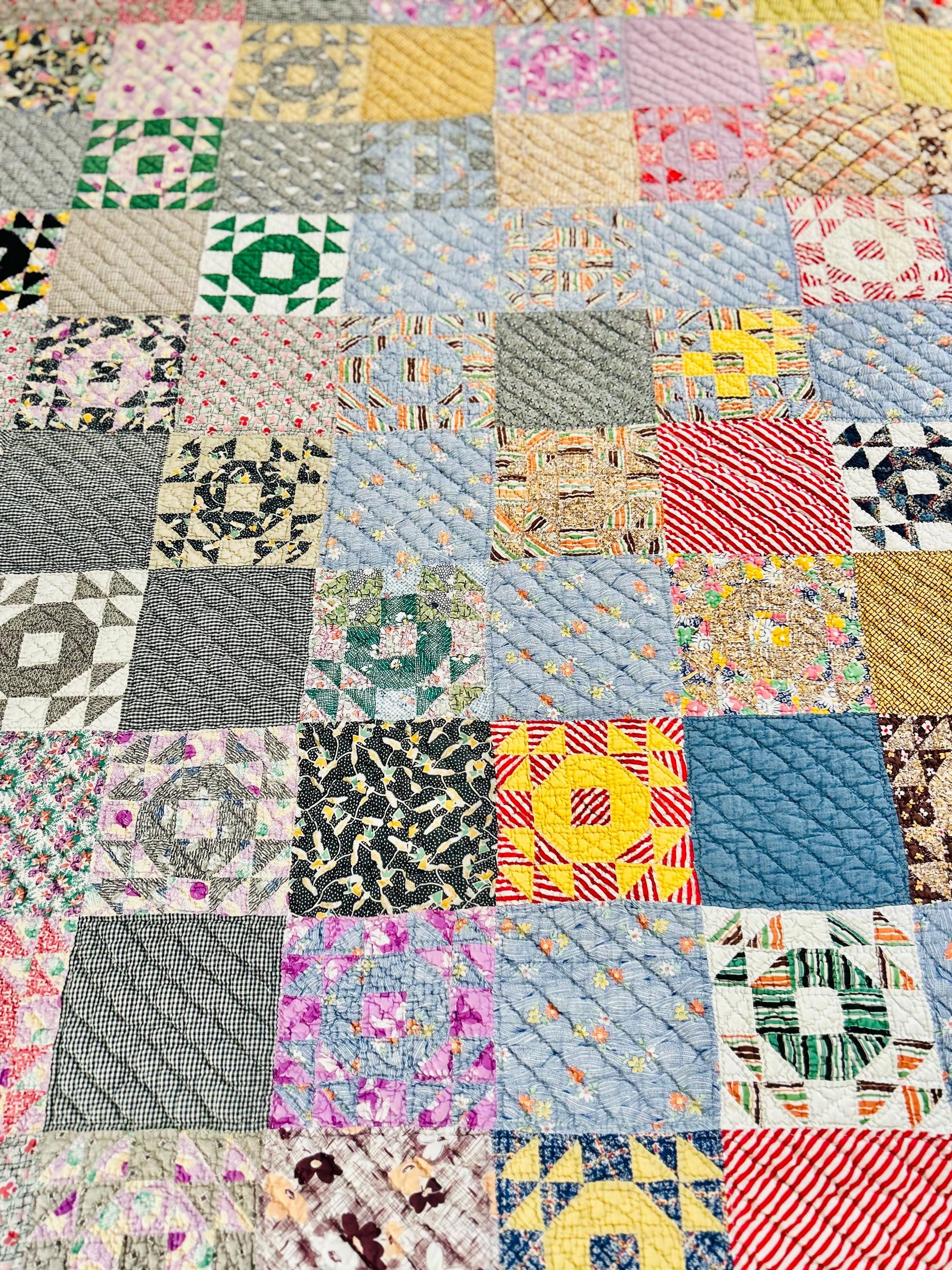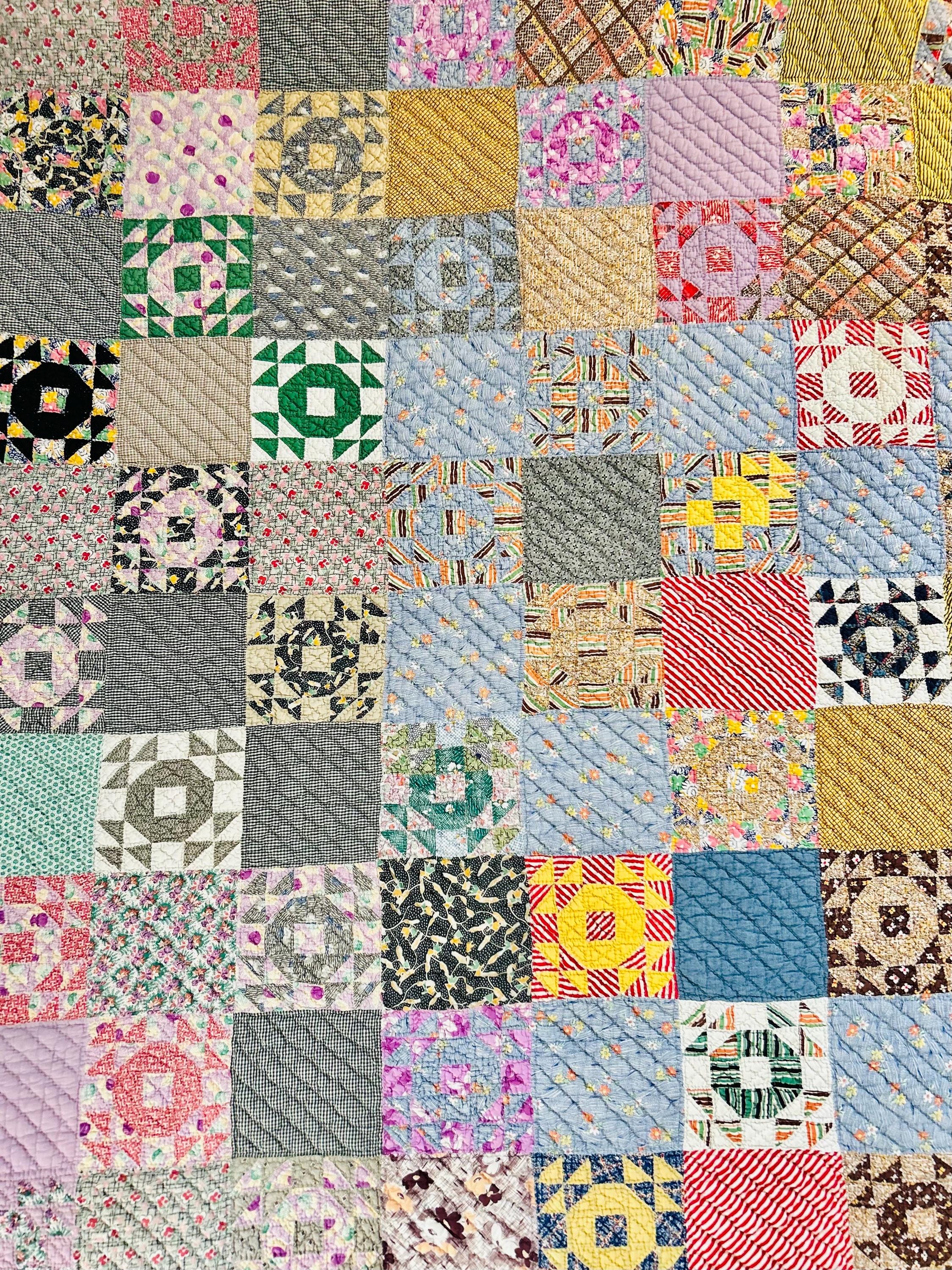 This amazing old quilt has individual Georgetown Circle blocks (a very difficult pattern) that are tiny -- just 6-inches square -- which would have made the piecing and quilting even more challenging. It is an authentic scrappy 1930s quilt with its Depression-era feedsack fabrics, novelty prints, and shirtings. The tiny-stitched hand-quilting outlines each tiny triangle and square and is in diagonals through the rest of the quilt, including through the four-sided border.