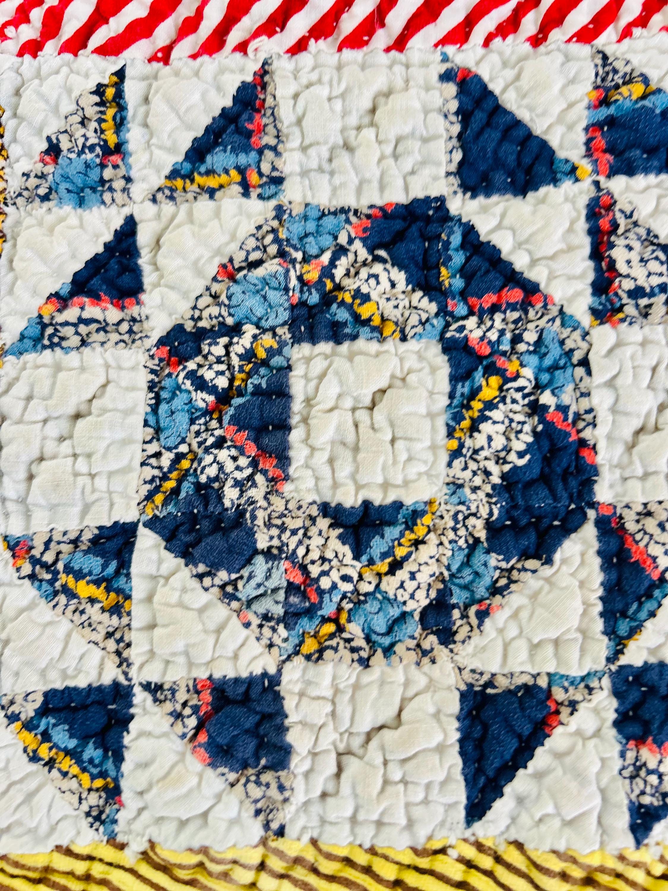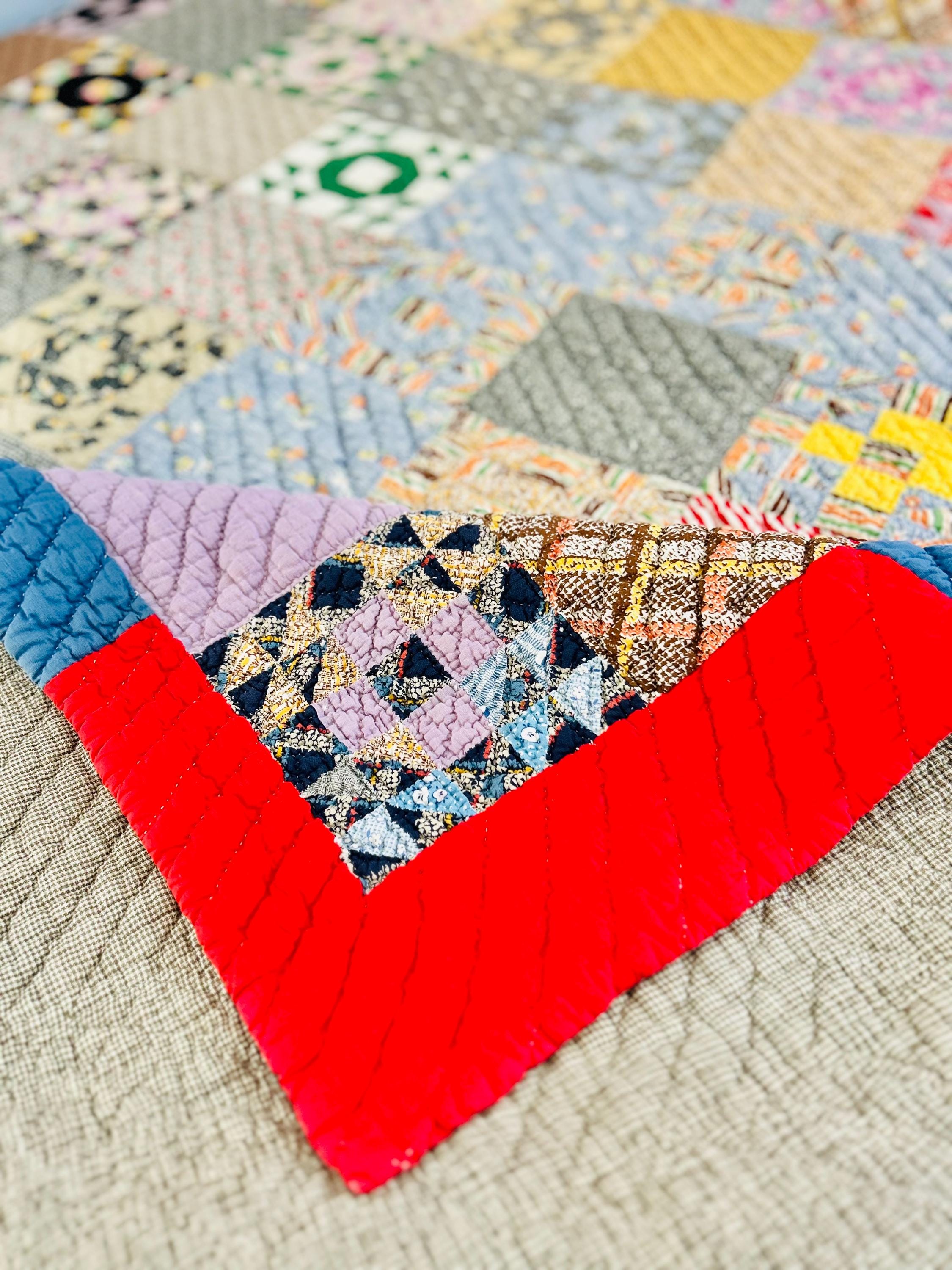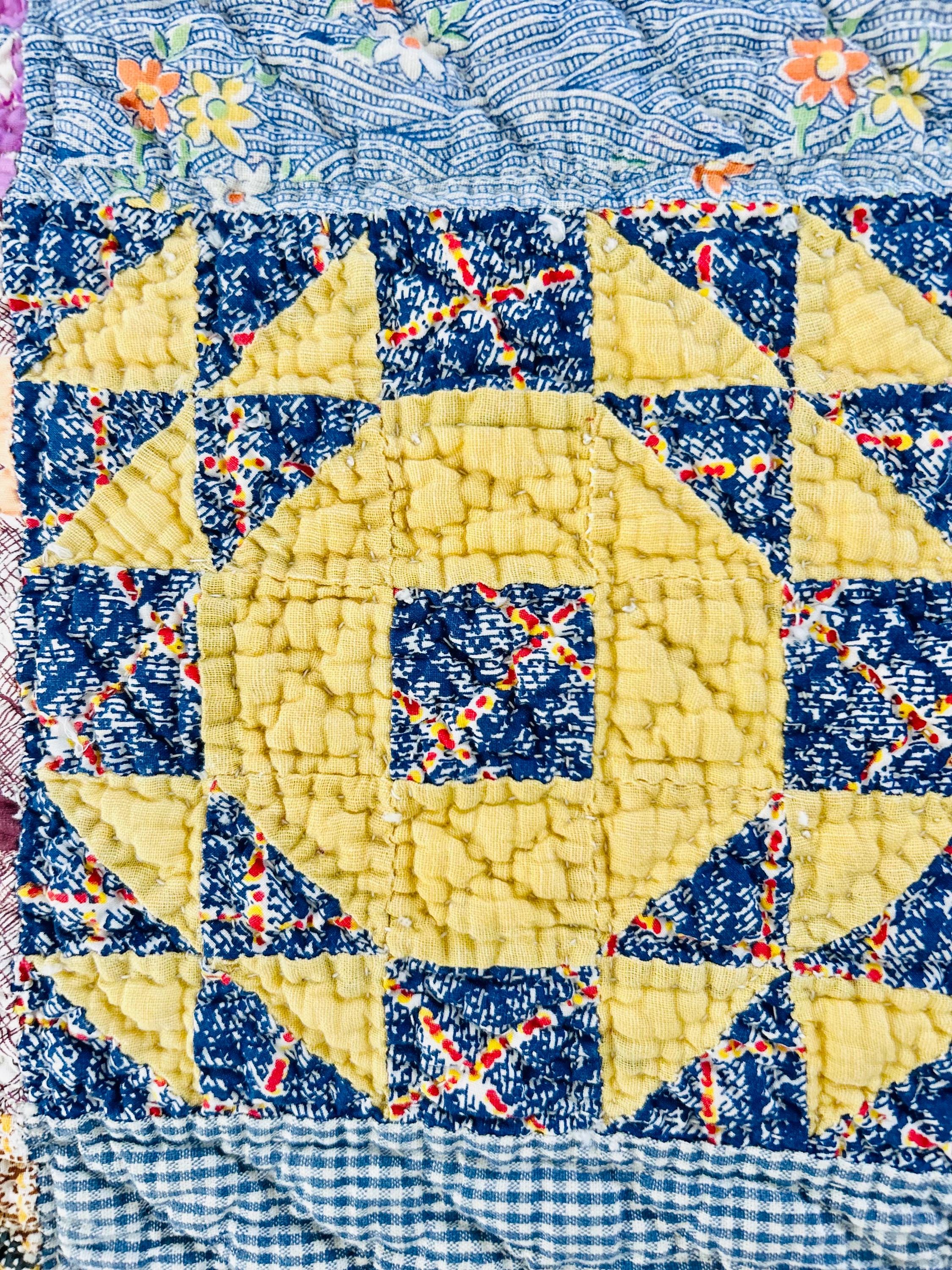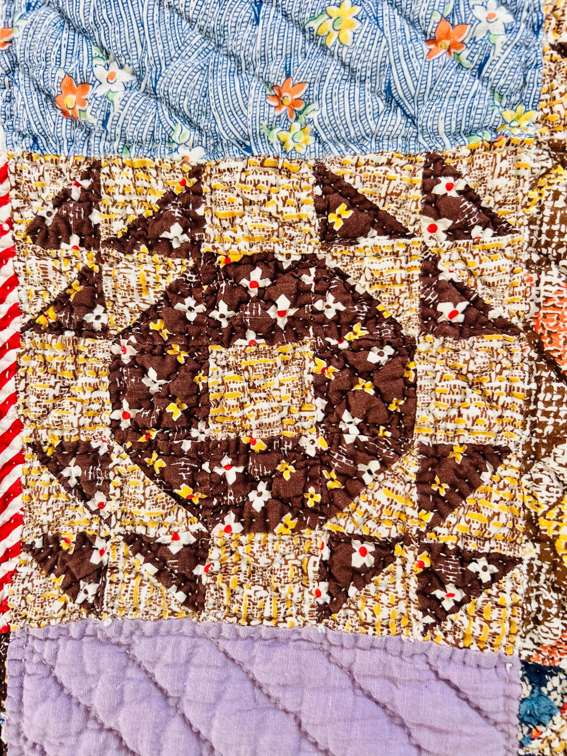 This amazing old quilt has individual Georgetown Circle blocks (a very difficult pattern) that are tiny -- just 6-inches square -- which would have made the piecing and quilting even more challenging. It is an authentic scrappy 1930s quilt with its Depression-era feedsack fabrics, novelty prints, and shirtings. The tiny-stitched hand-quilting outlines each tiny triangle and square and is in diagonals through the rest of the quilt, including through the four-sided border.