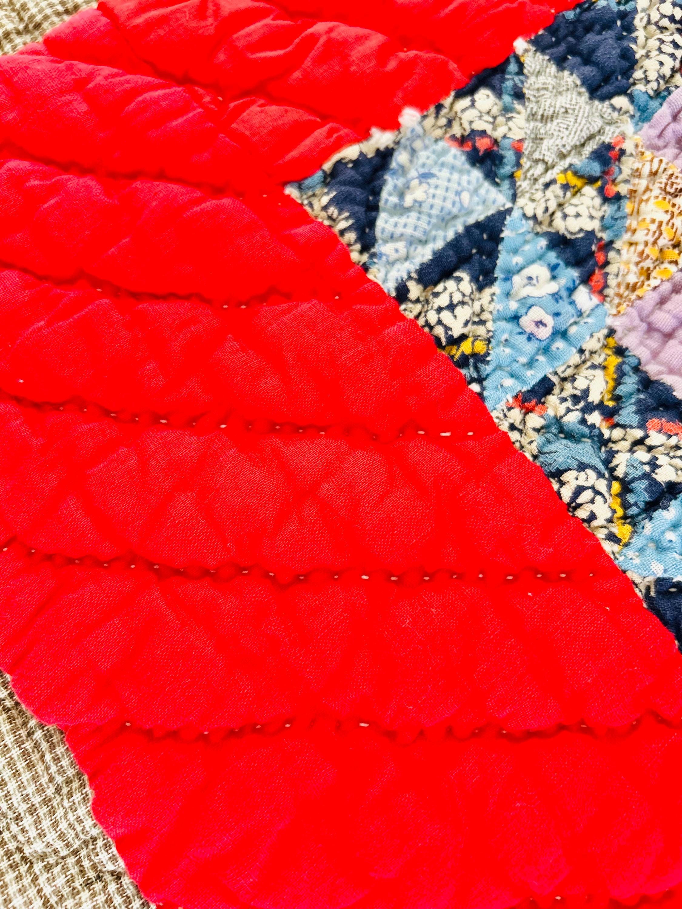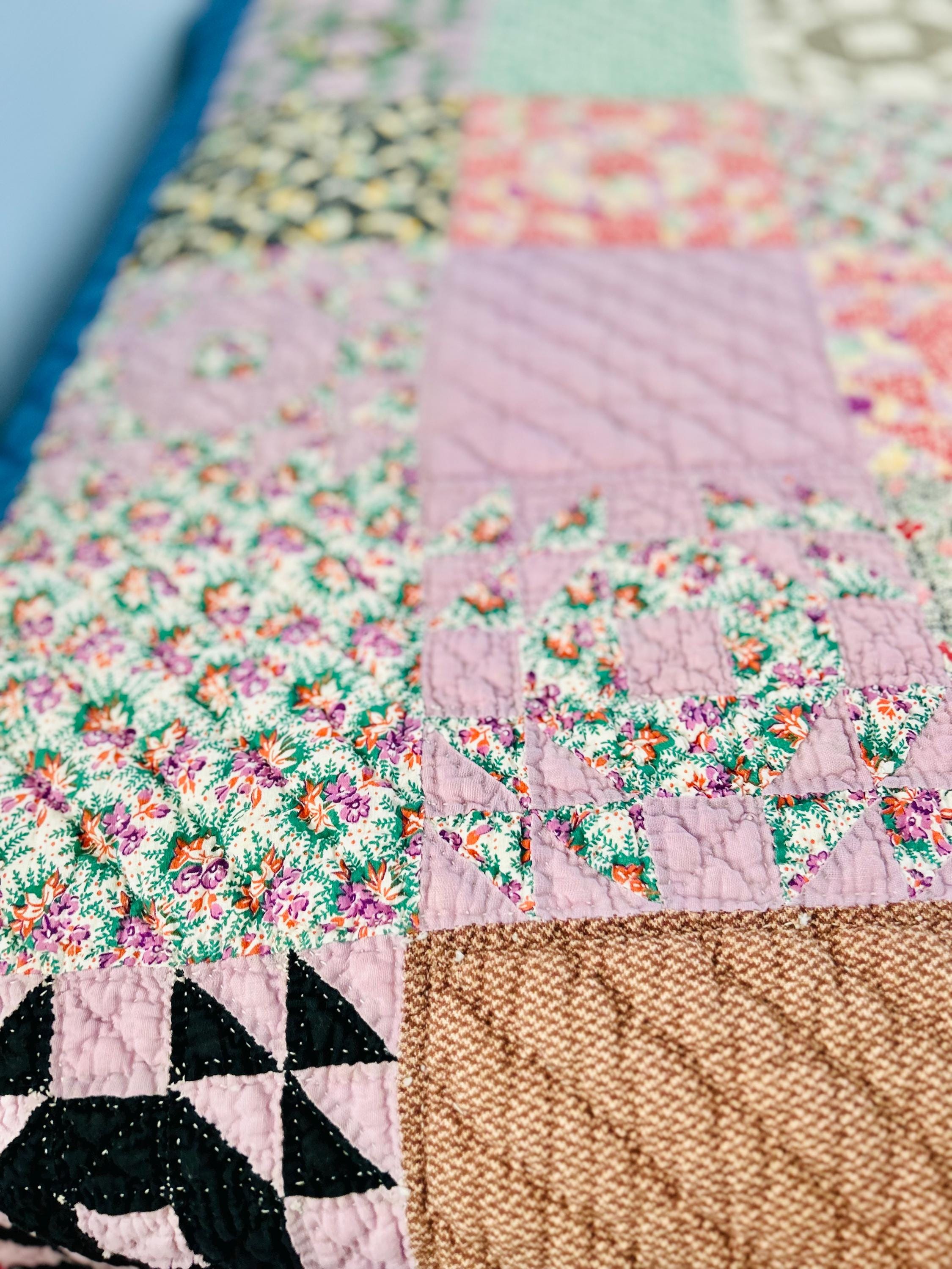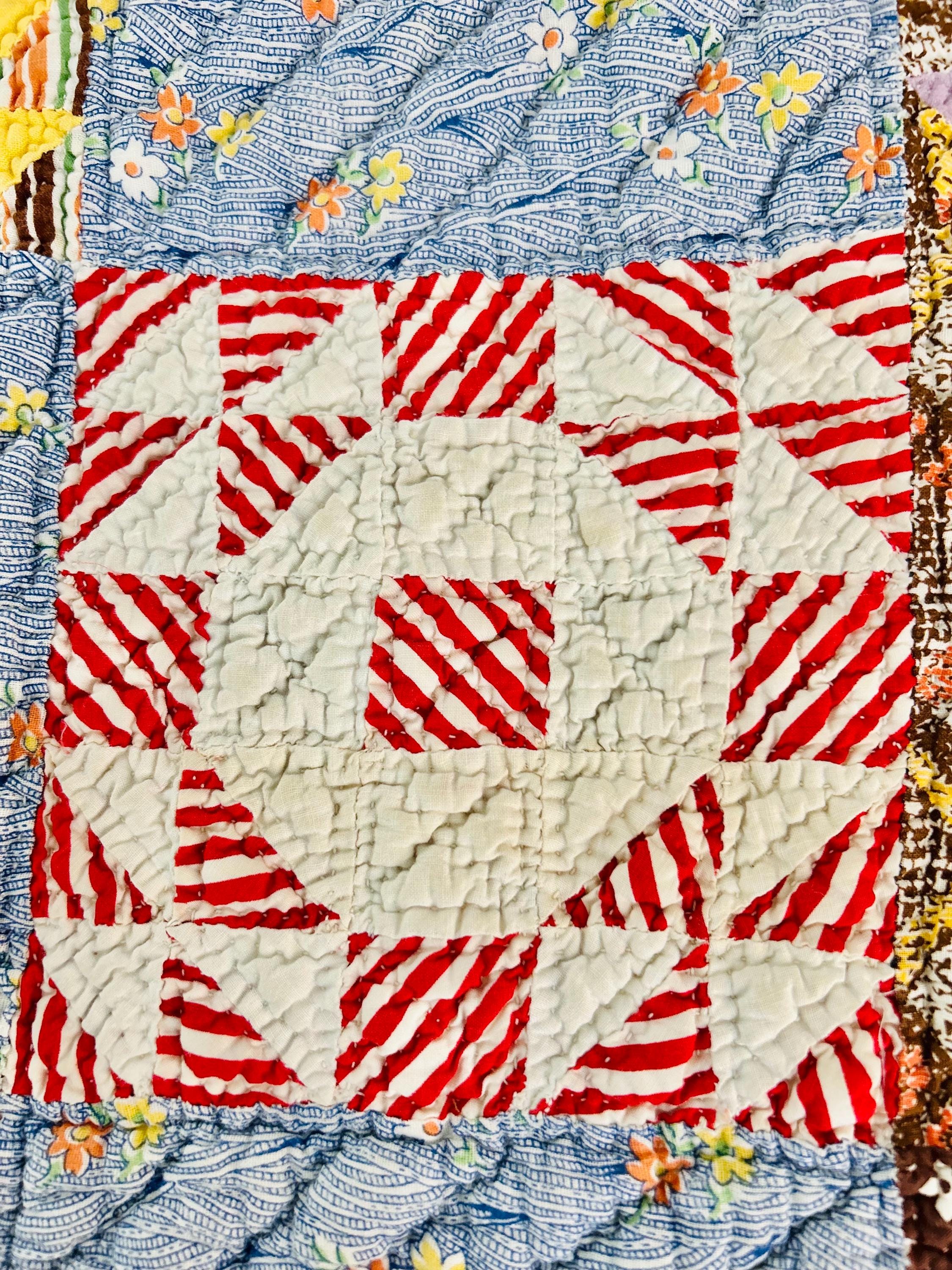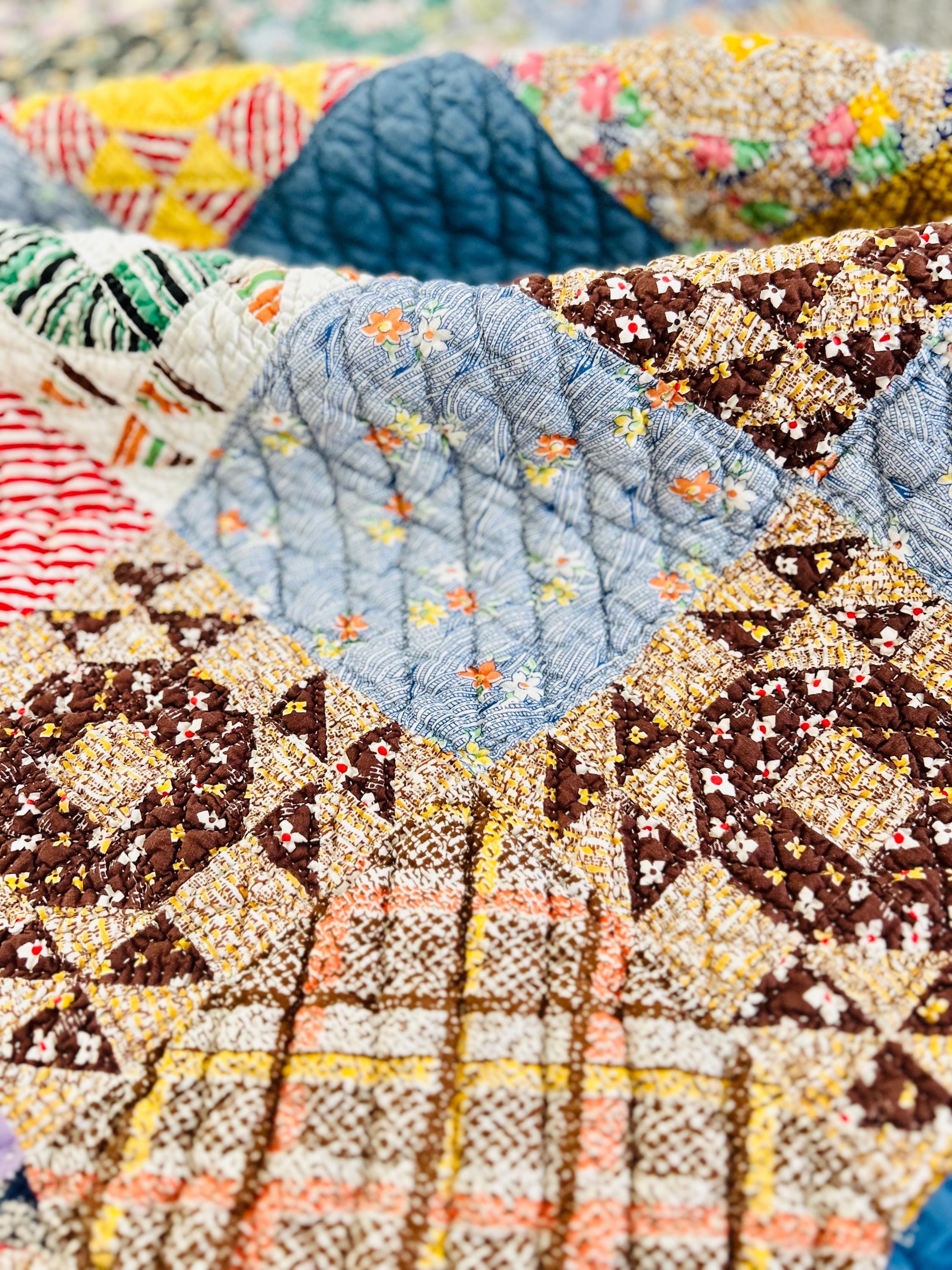 This amazing old quilt has individual Georgetown Circle blocks (a very difficult pattern) that are tiny -- just 6-inches square -- which would have made the piecing and quilting even more challenging. It is an authentic scrappy 1930s quilt with its Depression-era feedsack fabrics, novelty prints, and shirtings. The tiny-stitched hand-quilting outlines each tiny triangle and square and is in diagonals through the rest of the quilt, including through the four-sided border.
