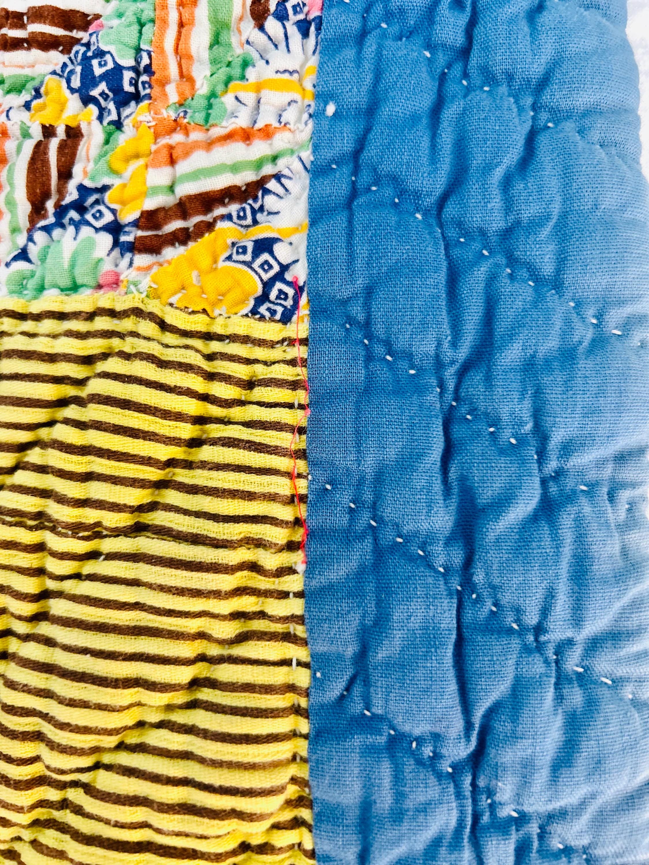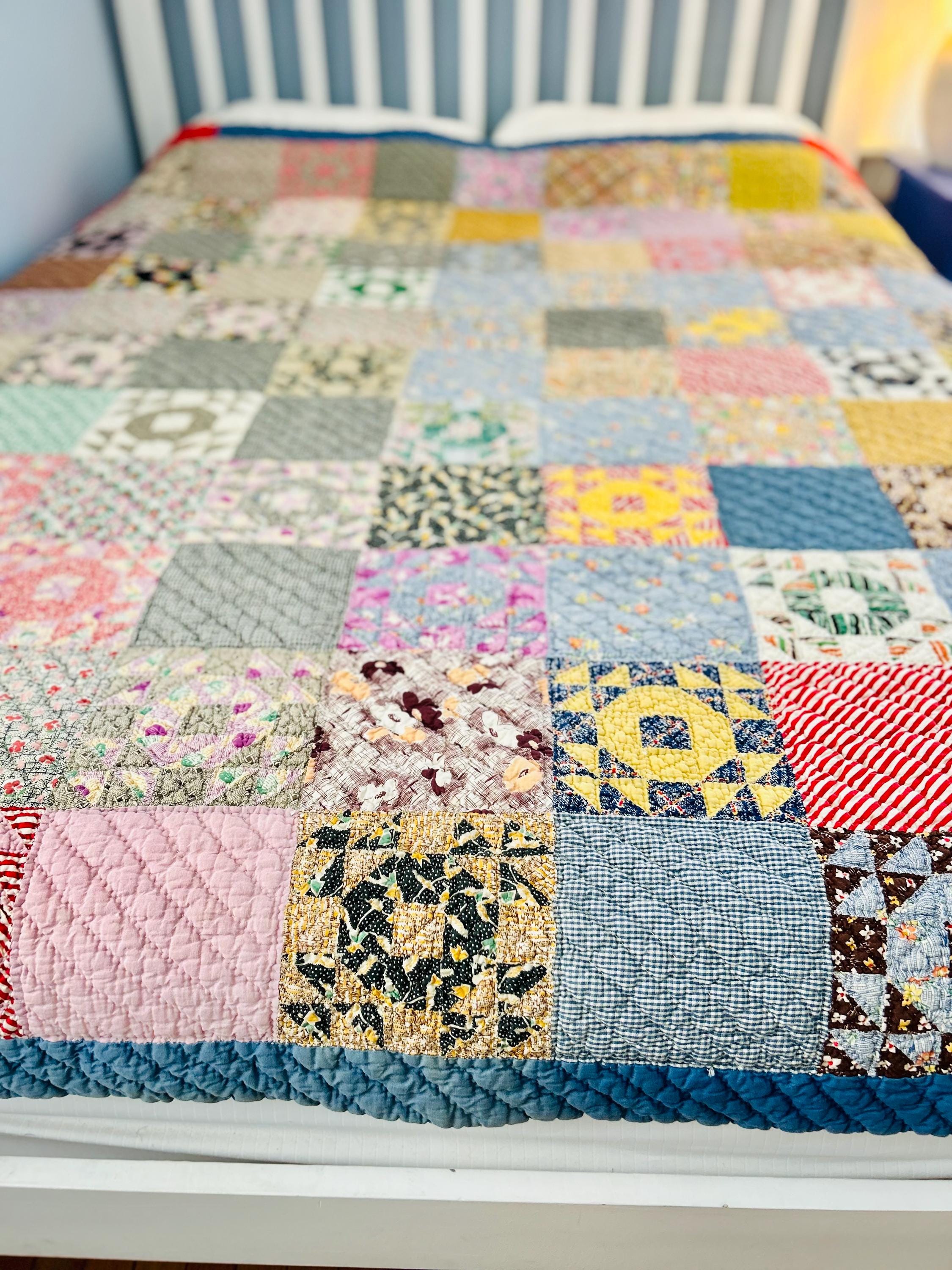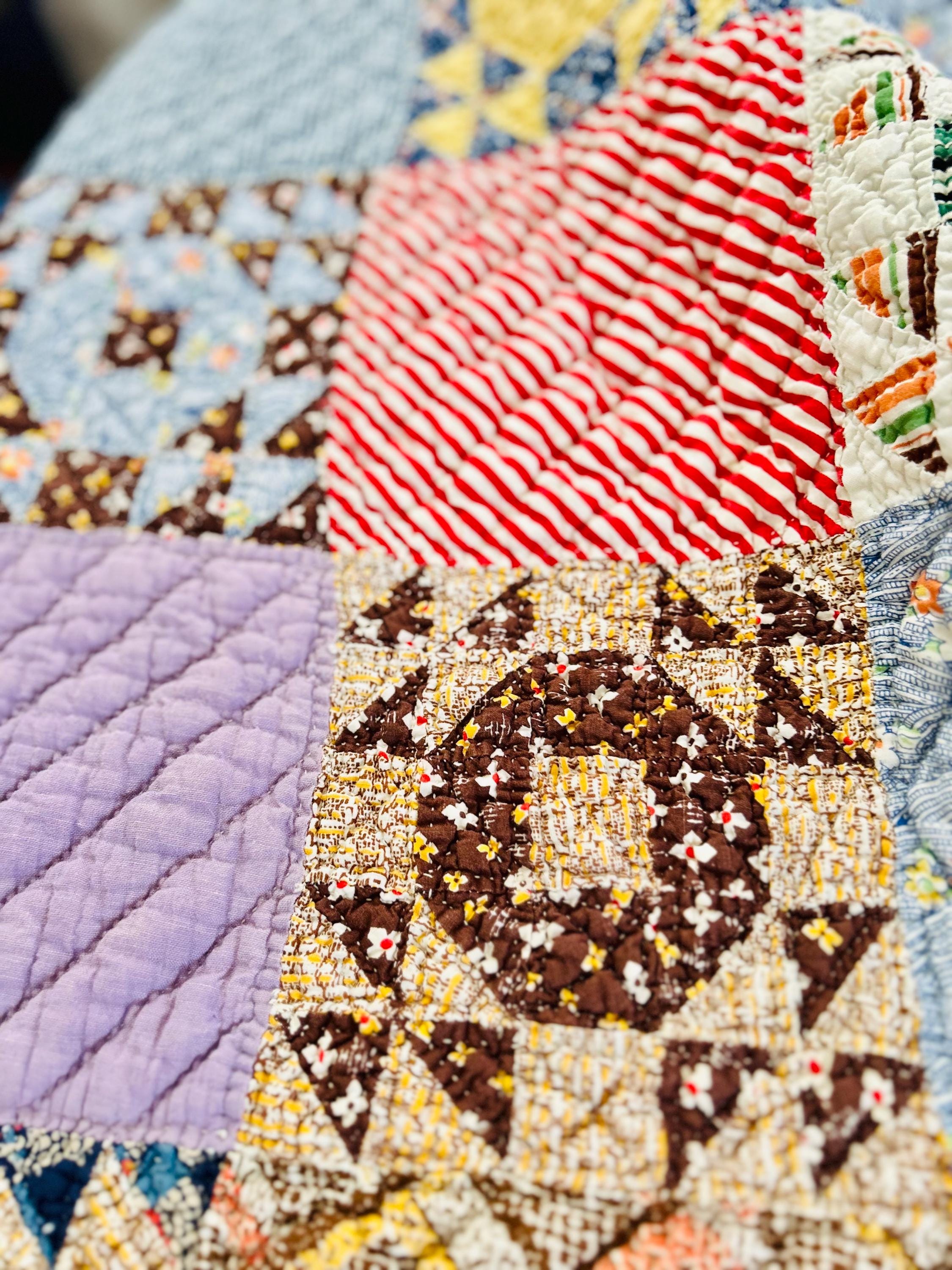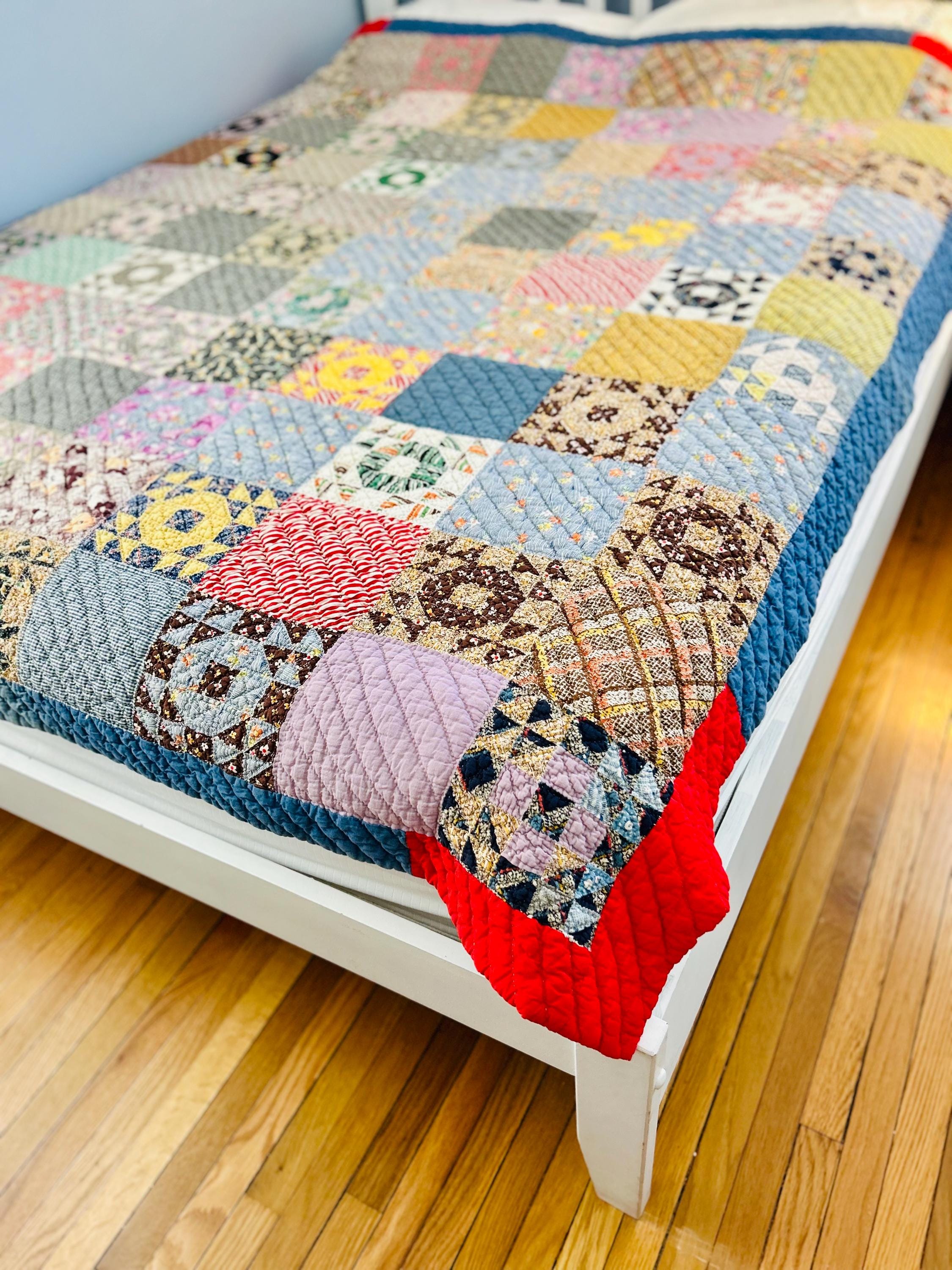 This amazing old quilt has individual Georgetown Circle blocks (a very difficult pattern) that are tiny -- just 6-inches square -- which would have made the piecing and quilting even more challenging. It is an authentic scrappy 1930s quilt with its Depression-era feedsack fabrics, novelty prints, and shirtings. The tiny-stitched hand-quilting outlines each tiny triangle and square and is in diagonals through the rest of the quilt, including through the four-sided border.