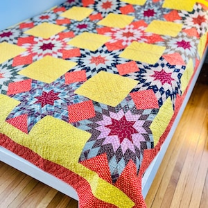 The quilt measures 81 inches by 90 inches and comes from a smoke-free, pet free home. It is shown on a queen size bed.