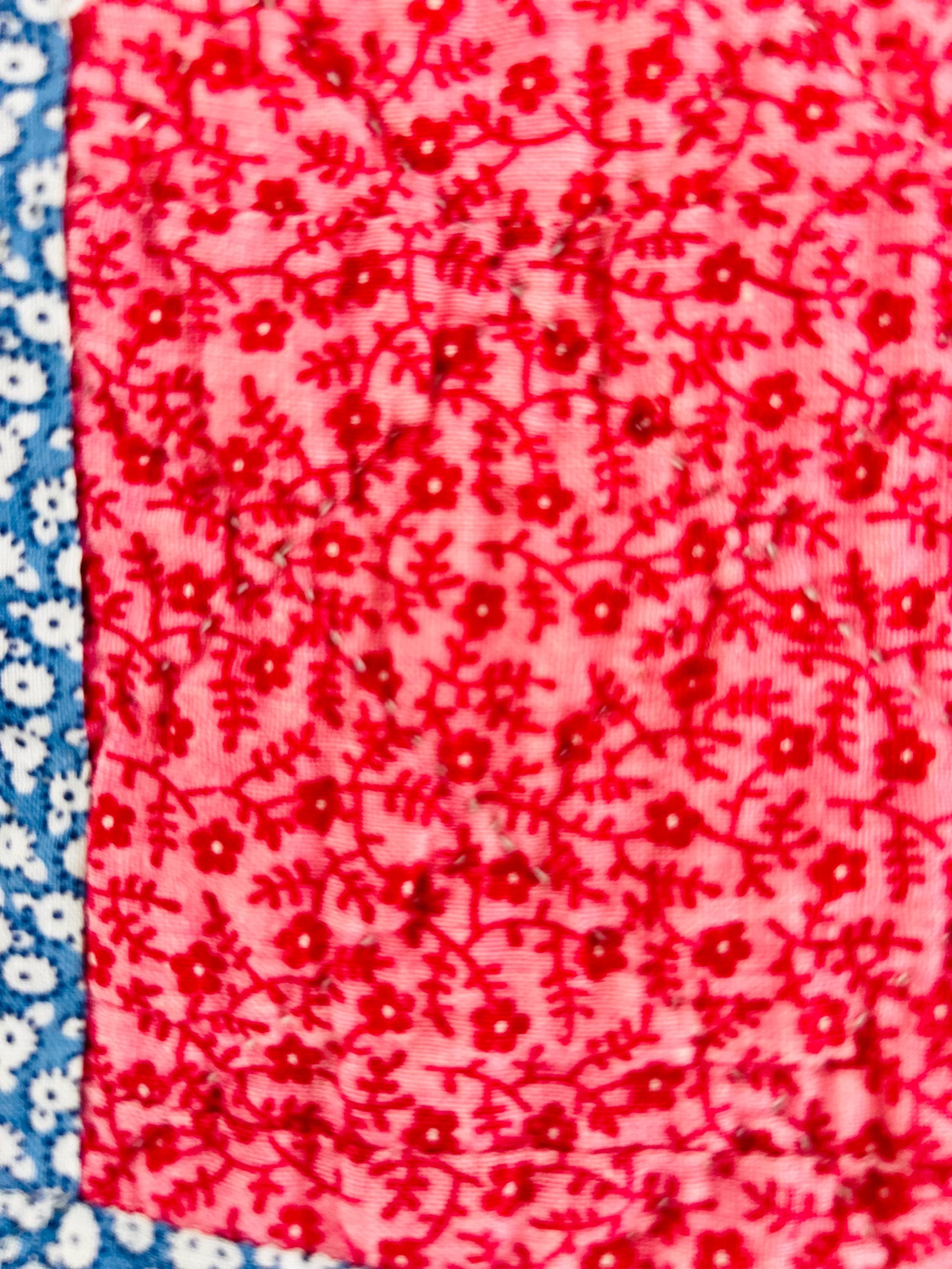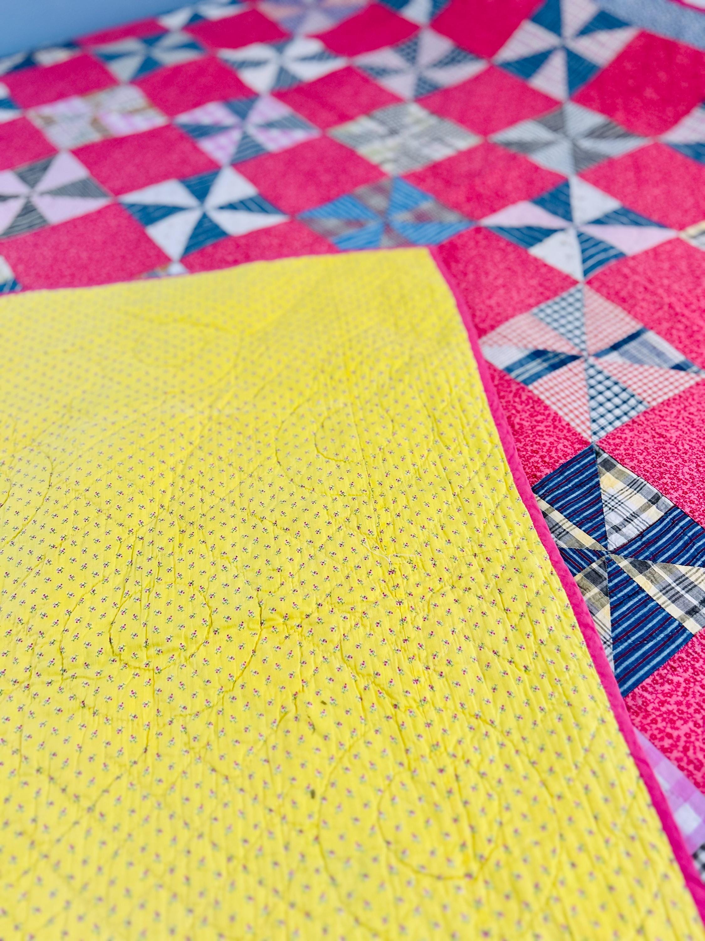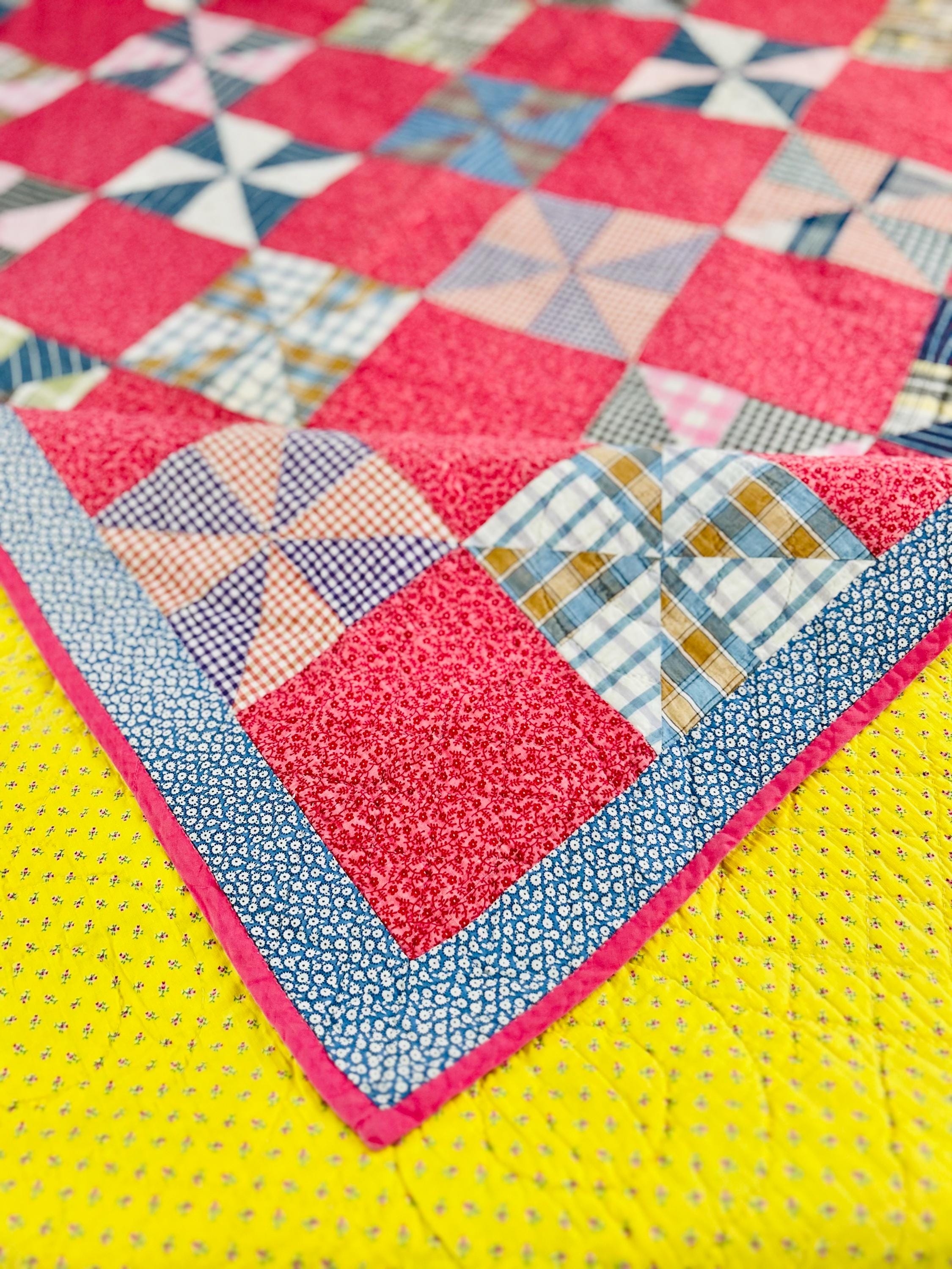 This very impressive 1940s quilt in a classic Pinwheel pattern is bright and cheerful is in never used condition and is made from classic 1940s ginghams, plaids, striped, and feedsack-style fabrics. Alternating raspberry-pink floral squares create a beautiful checkerboard pattern. The hand-quilting is in circles and diamonds in the body of the quilt and in a shell pattern along the four-sided border.