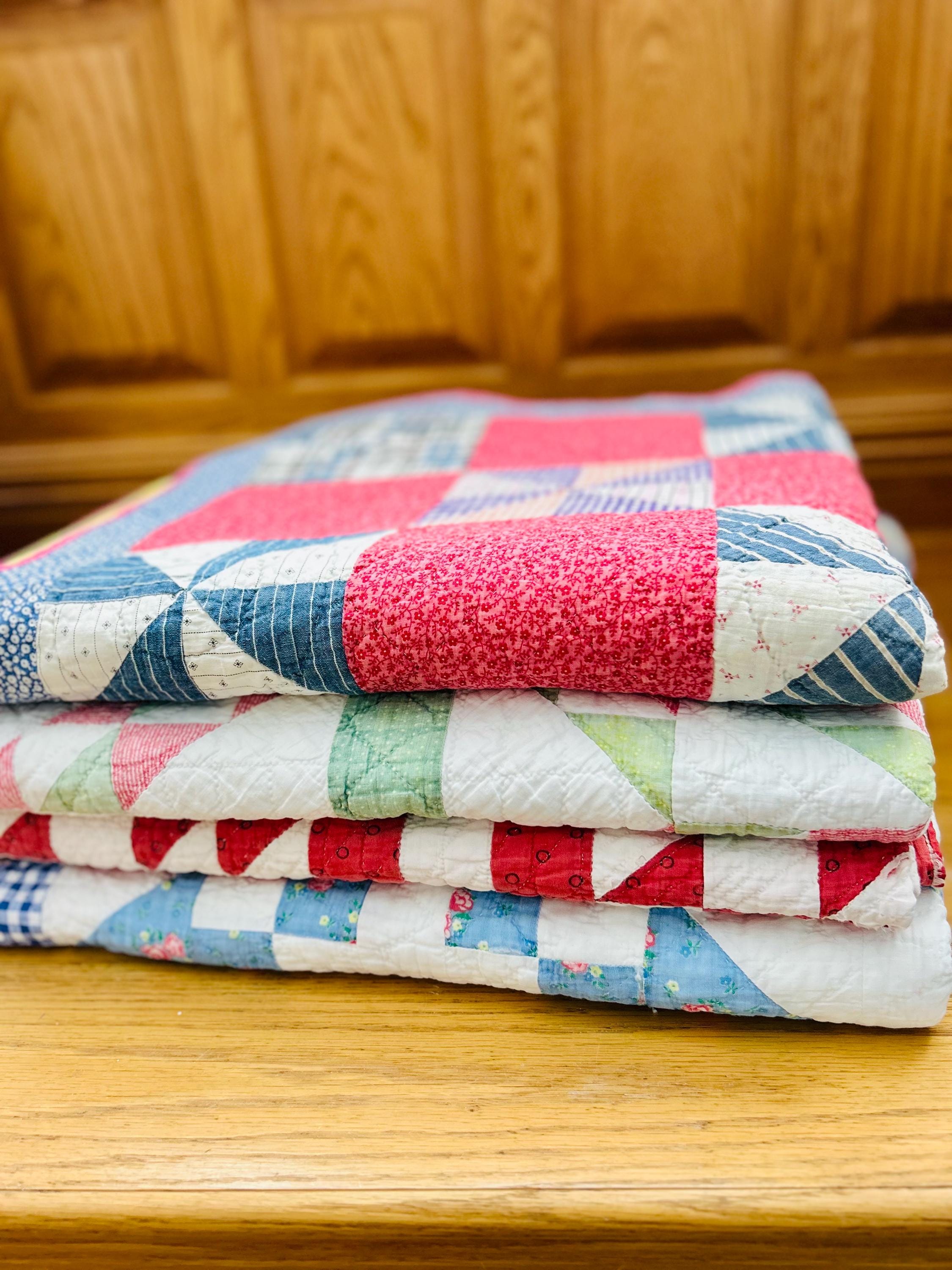 The quilt measures 70 inches by 76 inches and comes from a smoke-free and pet-free home. Shown on a queen-size bed.