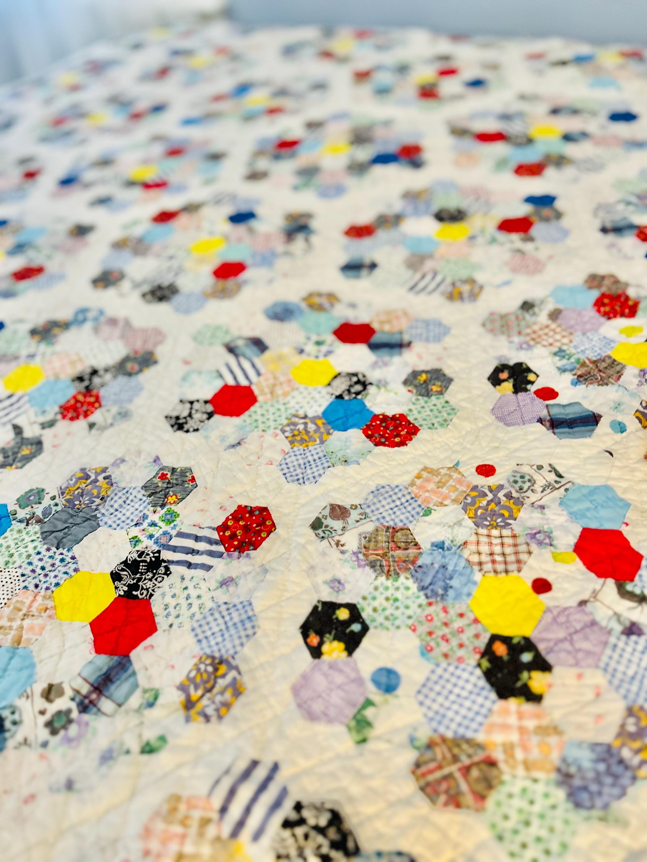 This is a charming Wheel of Life Quilt, circa 1930s, made with more than 2,000 multicolored hexagons in gardens surrounded by white hexagons. It is in the family of quilt patterns as Grandmother's Flower Garden. The exacting hand-quilting is in a repeating diamond pattern throughout the quilt. All four sides are scalloped following the outlines of the gardens.