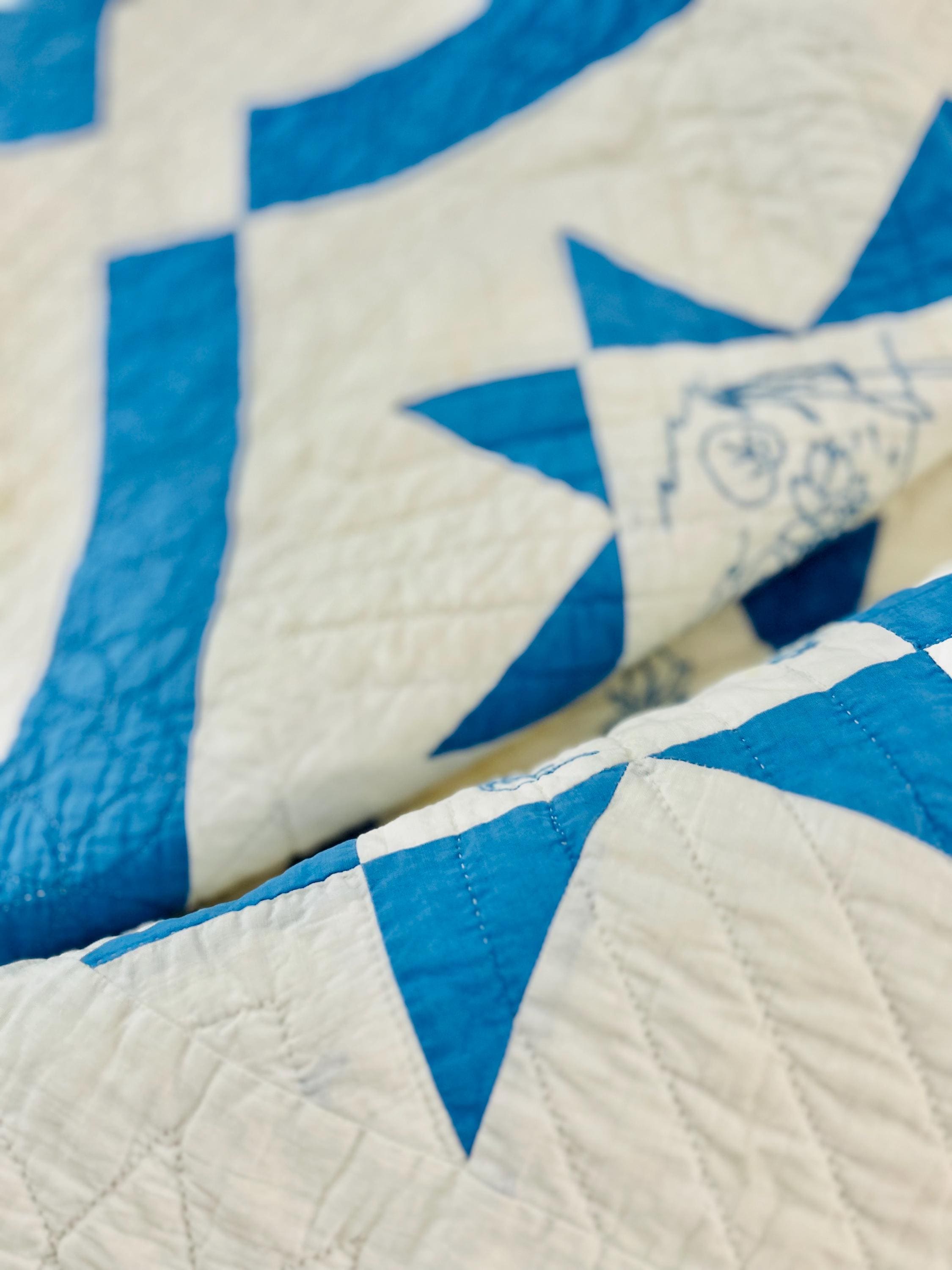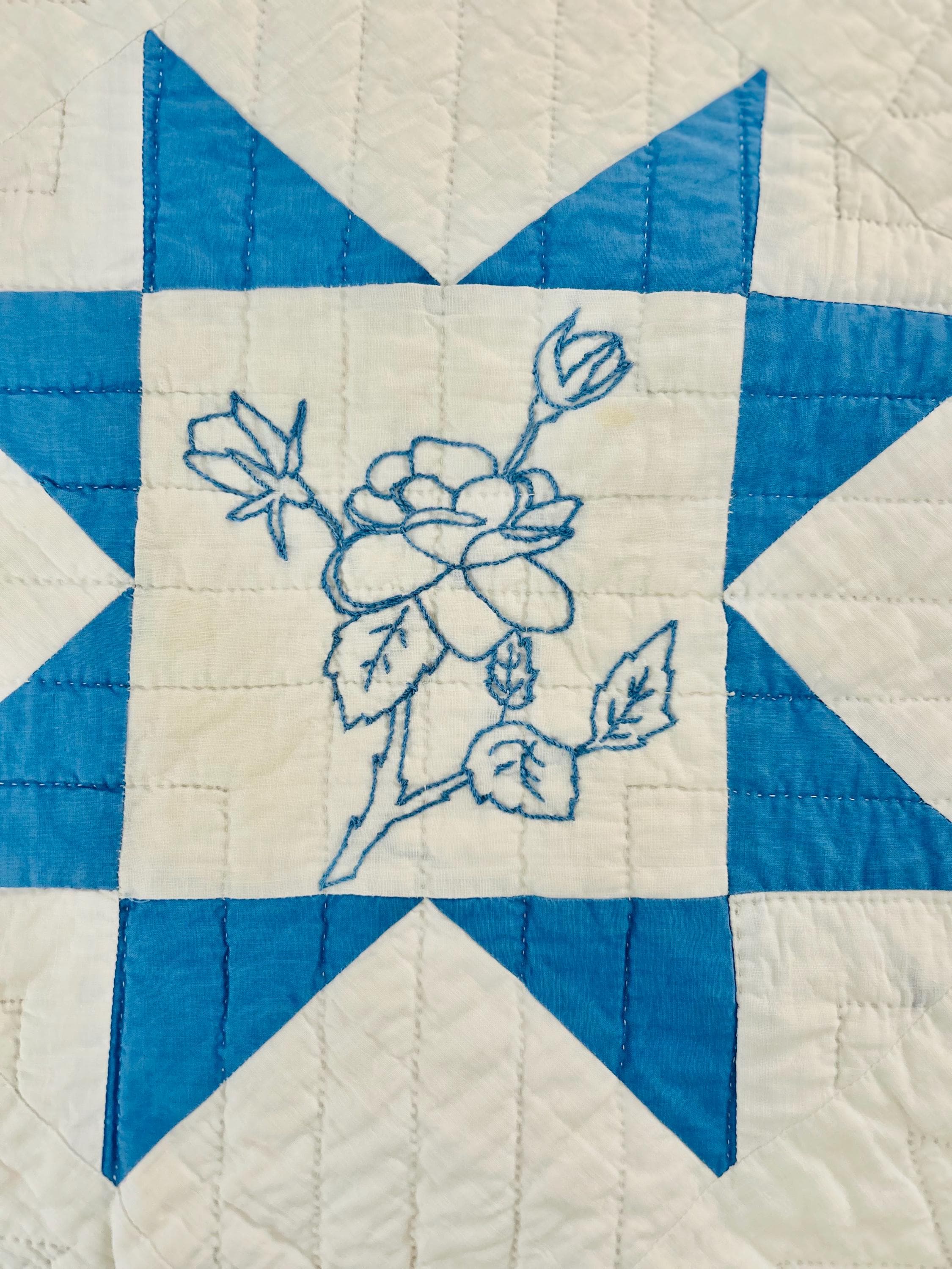 This beautiful 1940s quilt features striking Ohio Star blocks with bluework embroidered centers, each stitched by hand with classic mid-century motifs—birds, flowers, fruit sprays, and scrolling florals. The vivid blue stars stand out sharply against a crisp white background, giving the quilt a timeless cottage or farmhouse look. Entirely hand quilted, the quilting includes sunburst medallions, interlocking circles, and diamond-grid stitching throughout with impeccable quilting in tiny, even and painstaking stitches. The embroidery is also finely executed and remains strong and intact.