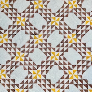 Details • Pattern: Six-Pointed Star / Star of Bethlehem (hexagon construction) • Date: c. 1930s • Measurements: 74"x86" • Construction: Machine pieced & machine and hand-quilted • Fabrics: Period cotton prints (feedsack era) • Batting: Cotton • Condition: Excellent vintage condition with expected age-related fading of the fabrics