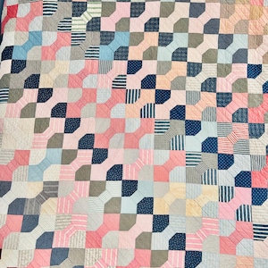 The quilt is a combination of hand-quilting and machine quilting, all in a grid of diagonals. The back is a plain-weave cotton in a bold geometric novelty print typical of the era. The back has been turned to the front and machine-stitched to form the binding. The cotton batting is lightweight.