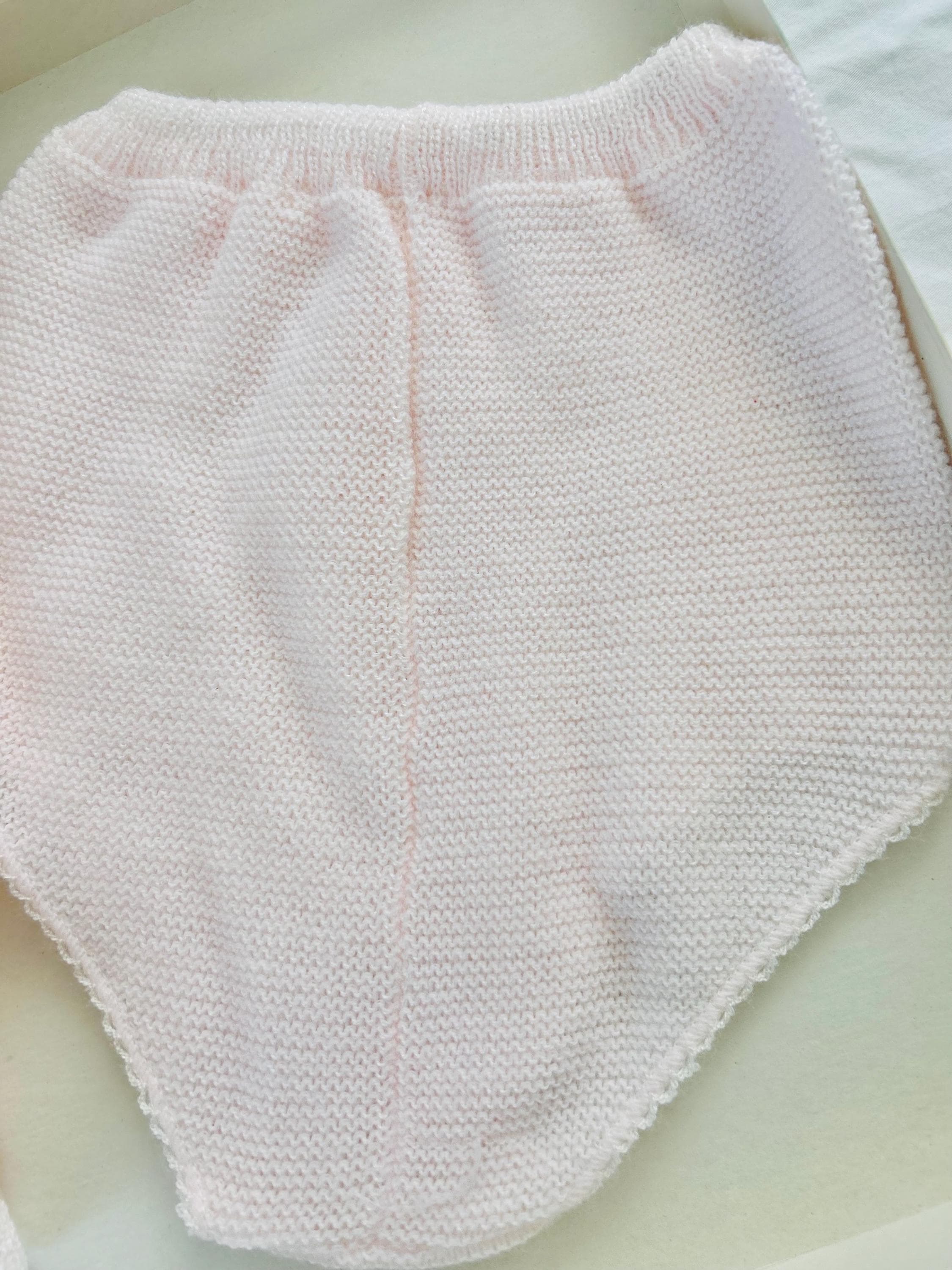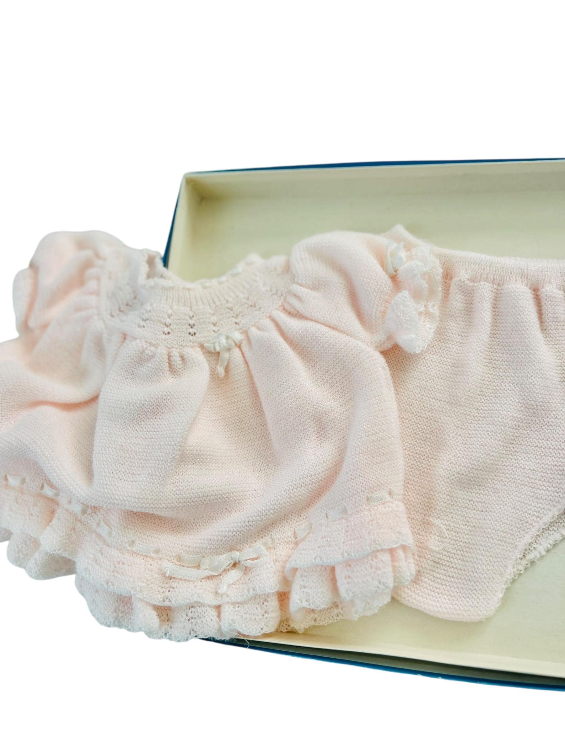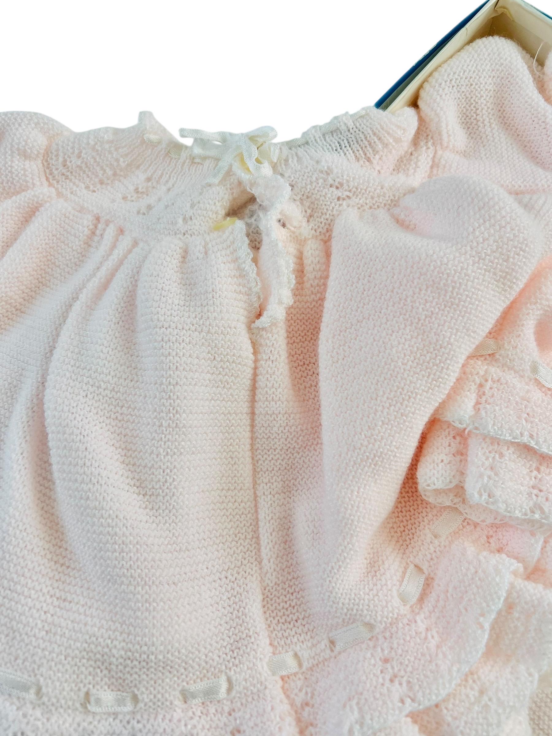 This set is labeled size 6–9 months, ideal for collectors, displays, or photography rather than modern wear. The craftsmanship is unmistakably mid-century Italian: fine-gauge knit, lace-edged sleeves and hem, gathered neckline, and sweet ribbon details throughout. The outfit appears never worn and has been stored for decades, showing only a faint trace of age toning near the neckline ribbon.