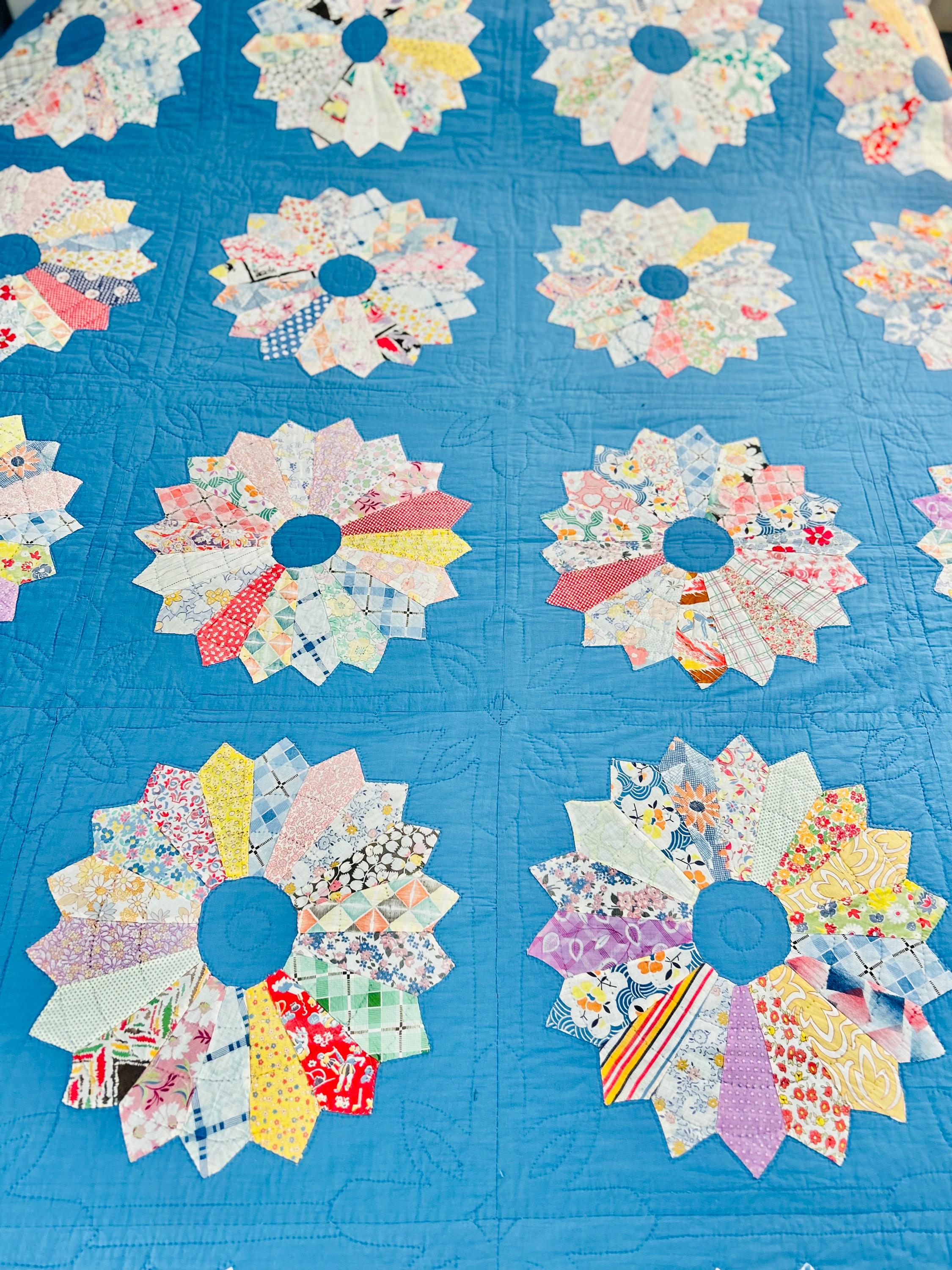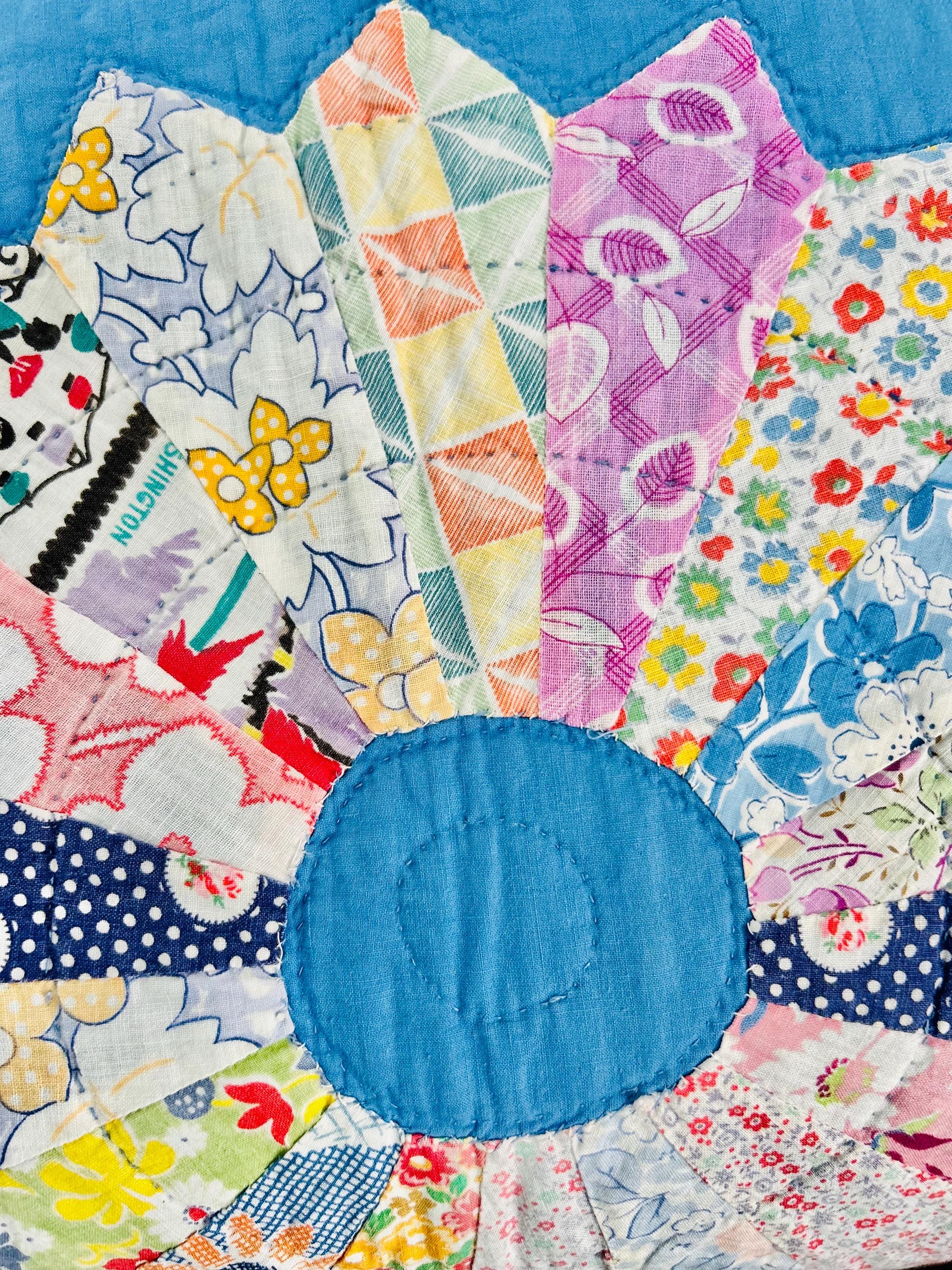 Beautiful authentic Depression-era Dresden Plate quilt, hand pieced and hand quilted, dating to approximately 1930–1940. This striking quilt features colorful Dresden Plate blocks made from a wide variety of vintage feed sack and early printed cotton fabrics, set against a rich blue background. Each Dresden Plate showcases a unique combination of florals, plaids, dots, and novelty prints, creating a joyful, one-of-a-kind composition. The quilt is entirely hand quilted with graceful stars, diagonal grids, concentric circles and unique geometric patterns throughout, adding texture and depth.