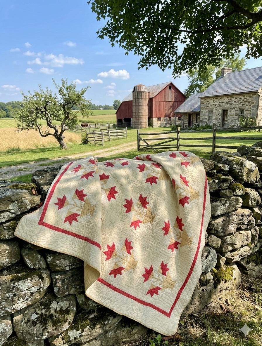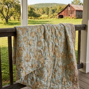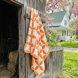 The back is white cotton while the binding is tan cotton that has been machine-stitched to the front and hand-stitched to the back. The cotton batting is lightweight.
