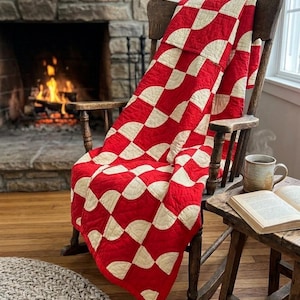 Details: • Hand pieced • Hand quilted throughout • Fine diagonal grid quilting • Turkey red cotton tulips with resist speckling • Soft cream cotton ground • Tan basket fabrics with beautiful natural aging • Knife-edge binding with narrow applied edging • Size: 62" x 78"