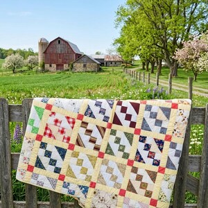 Details: • Handmade vintage patchwork quilt • Circa 1940s • Hand-pieced and hand-quilted • Mostly cotton scrap fabrics with a small amount of wool, and cotton batting • Size: 65” x 74” • Colors: red, green, yellow, floral prints • Backing: solid red cotton flannel