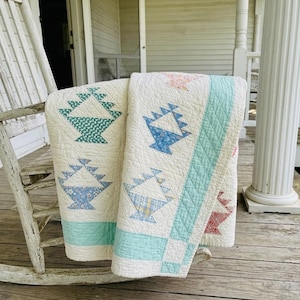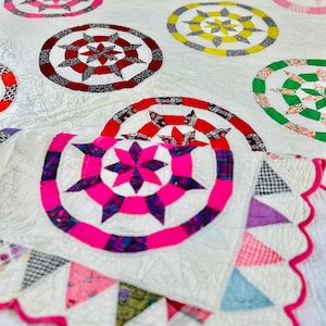 The quilt is hand-quilted with red thread in a traditional running stitch shell pattern, creating lovely texture and gentle crinkle that only comes with age and use. Backed in solid red cotton flannel, the binding is red cotton that has been machine stitched to the front and hand-stitched to the back. The cotton batting is lightweight.