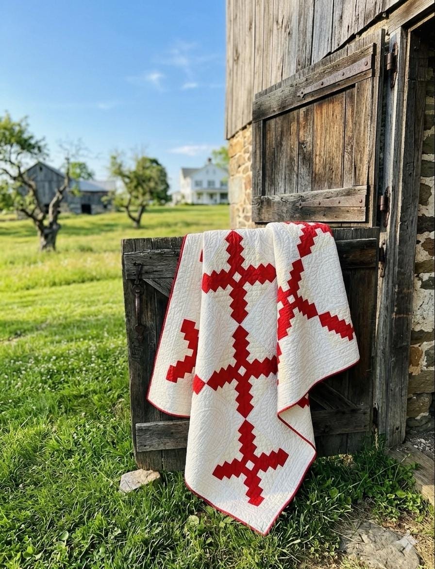 Details: • Pattern: Tête-à-Tête (X-layout variation) • Date: circa 1930–1940 • Materials: 100% cotton in red and white • Construction: Hand pieced and hand quilted • Quilting motifs: Feathered wreaths, grids, hearts, cable borders • Maker: Mary E. Hines (original label present) • Condition: Excellent, never used, never washed condition with light age-appropriate toning • Size: 68 inches by 78 inches