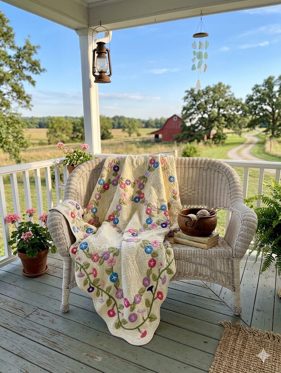 Details • Era: dated 1975 and signed "Vita Nicholson" • Construction: Hand appliquéd with stuffed applique, hand quilted • Materials: 100% cotton fabrics and batting • Design: Floral vine / morning glory motif with circular garlands • Colors: Pink, lavender, purple, blue, green on a soft cream ground • Backing: Original mid-century floral cotton print • Size: 86 inches x 92 inches