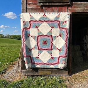 The quilt is backed with a painterly mid-century floral cotton, characteristic of post-war screen-printed textiles and the cotton batting is lightweight. The binding is off-white cotton that has been machine stitched to the back and hand-stitched to the front.