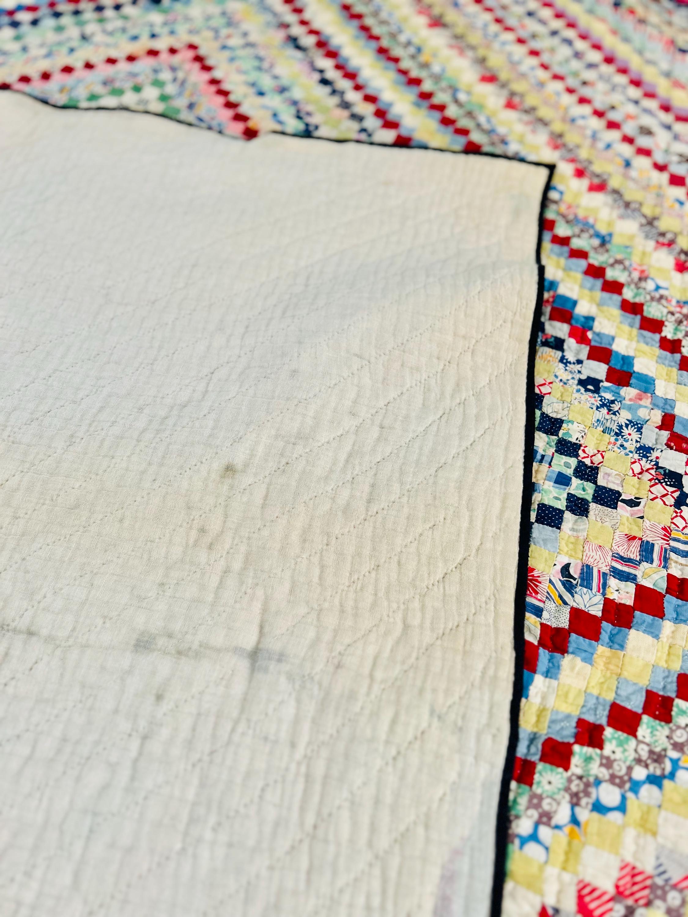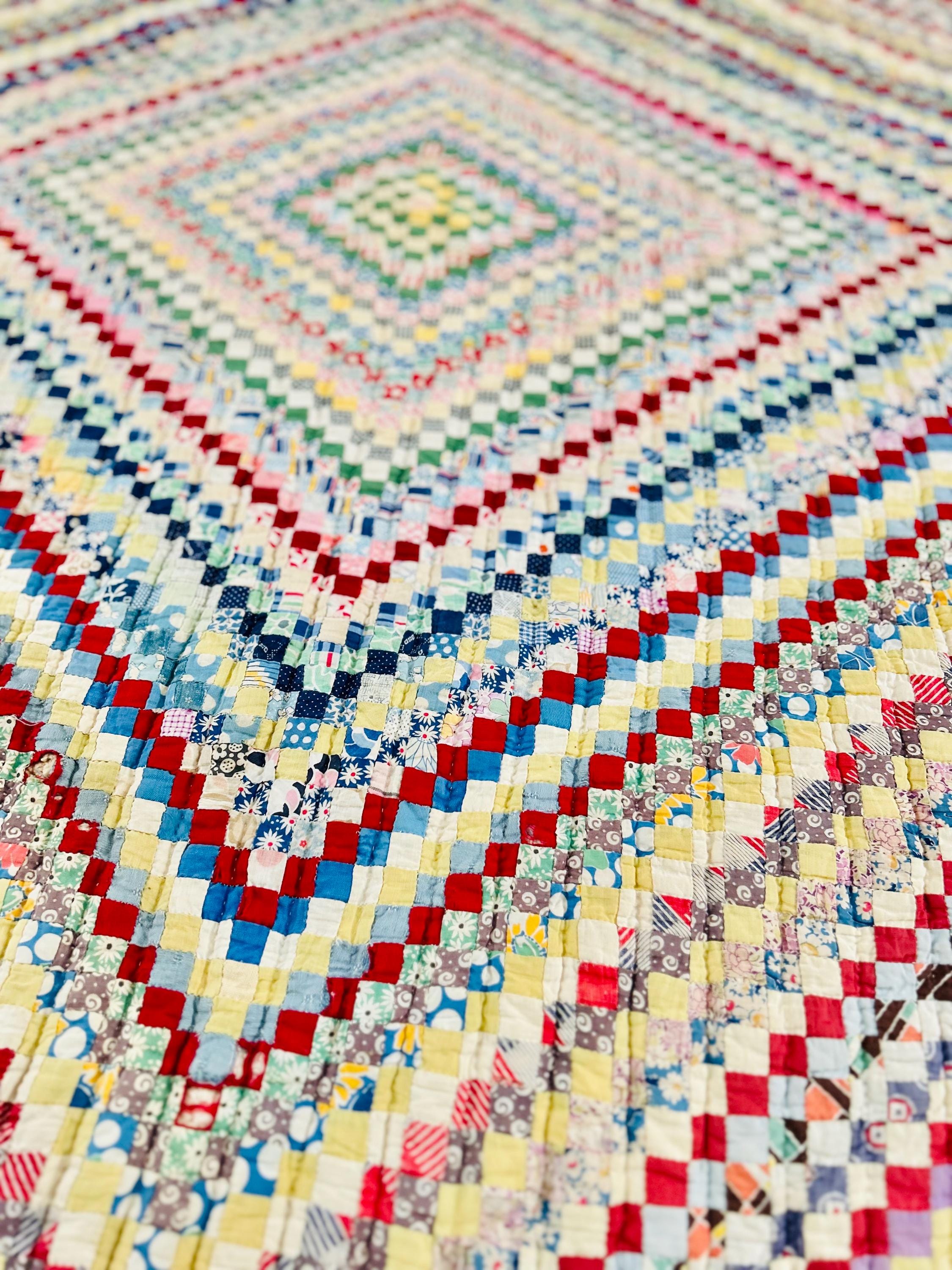 The quilt is entirely hand-pieced and hand-quilted, constructed from a beautiful mix of period cottons including early indigo blues, turkey reds, shirtings, dots, and small florals typical of the 1880s-1890s. The colors remain remarkably harmonious, with the classic “Trip Around the World” visual movement drawing the eye from center to edge. The tiny hand-quilting is in diagonals.