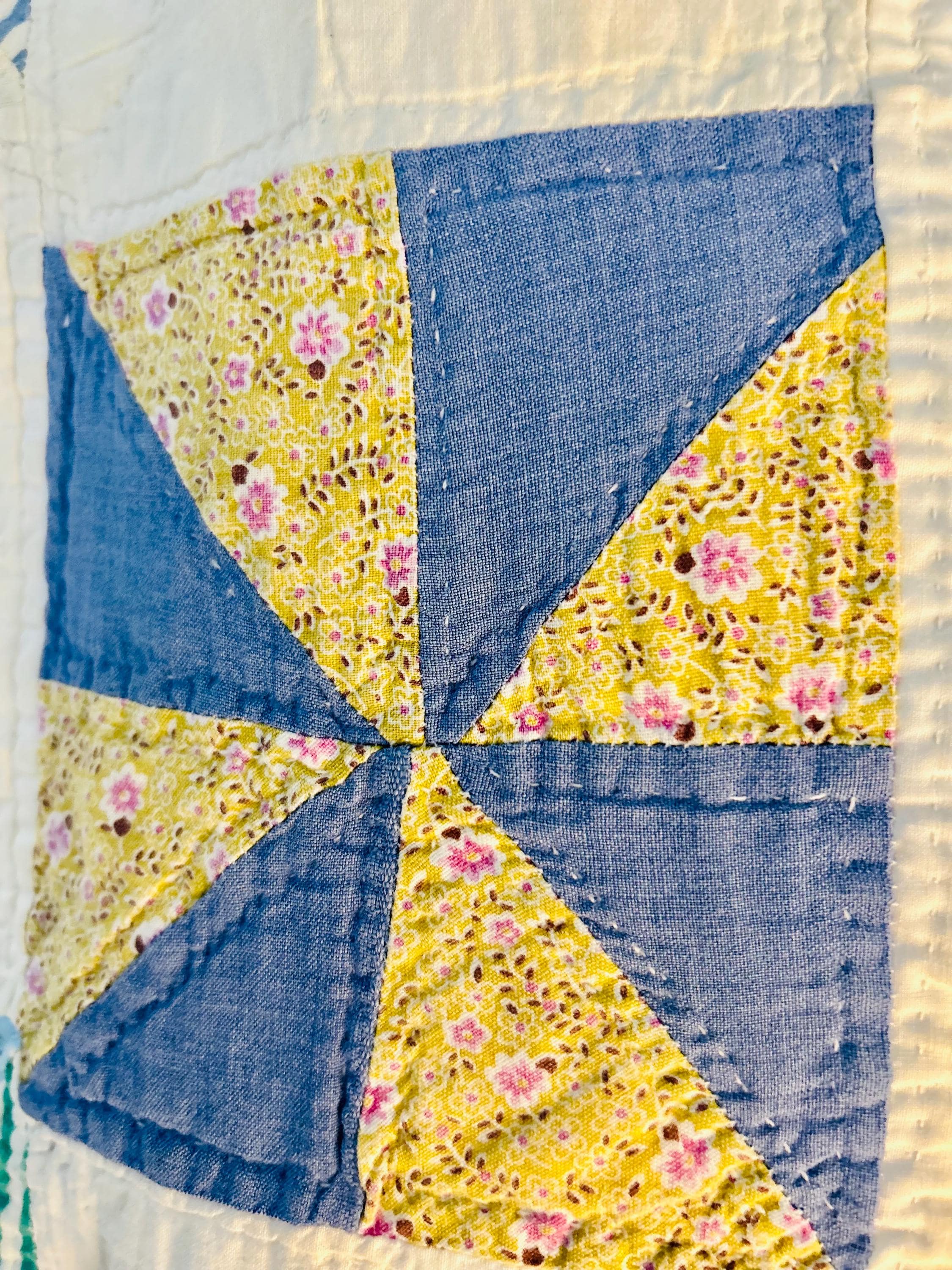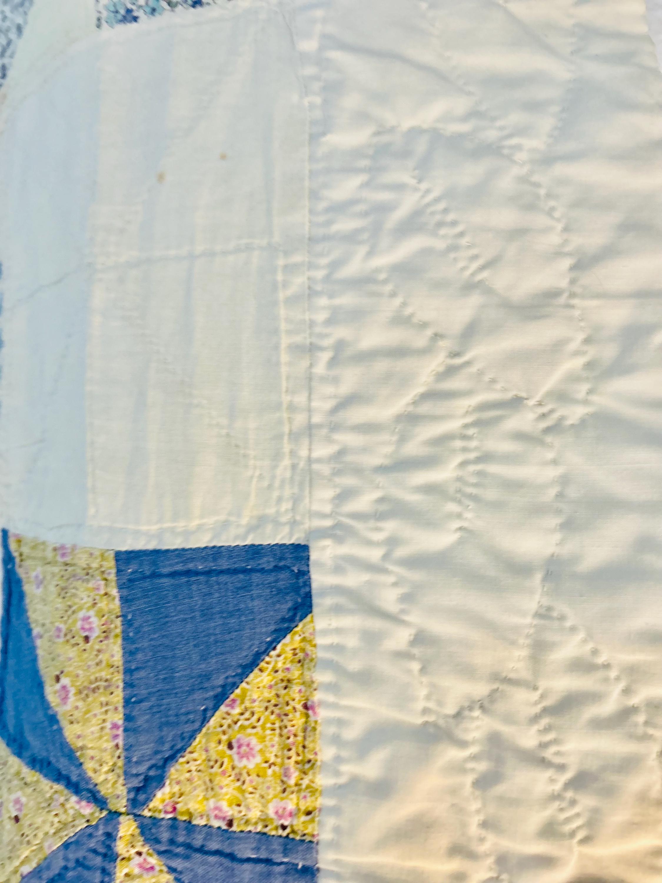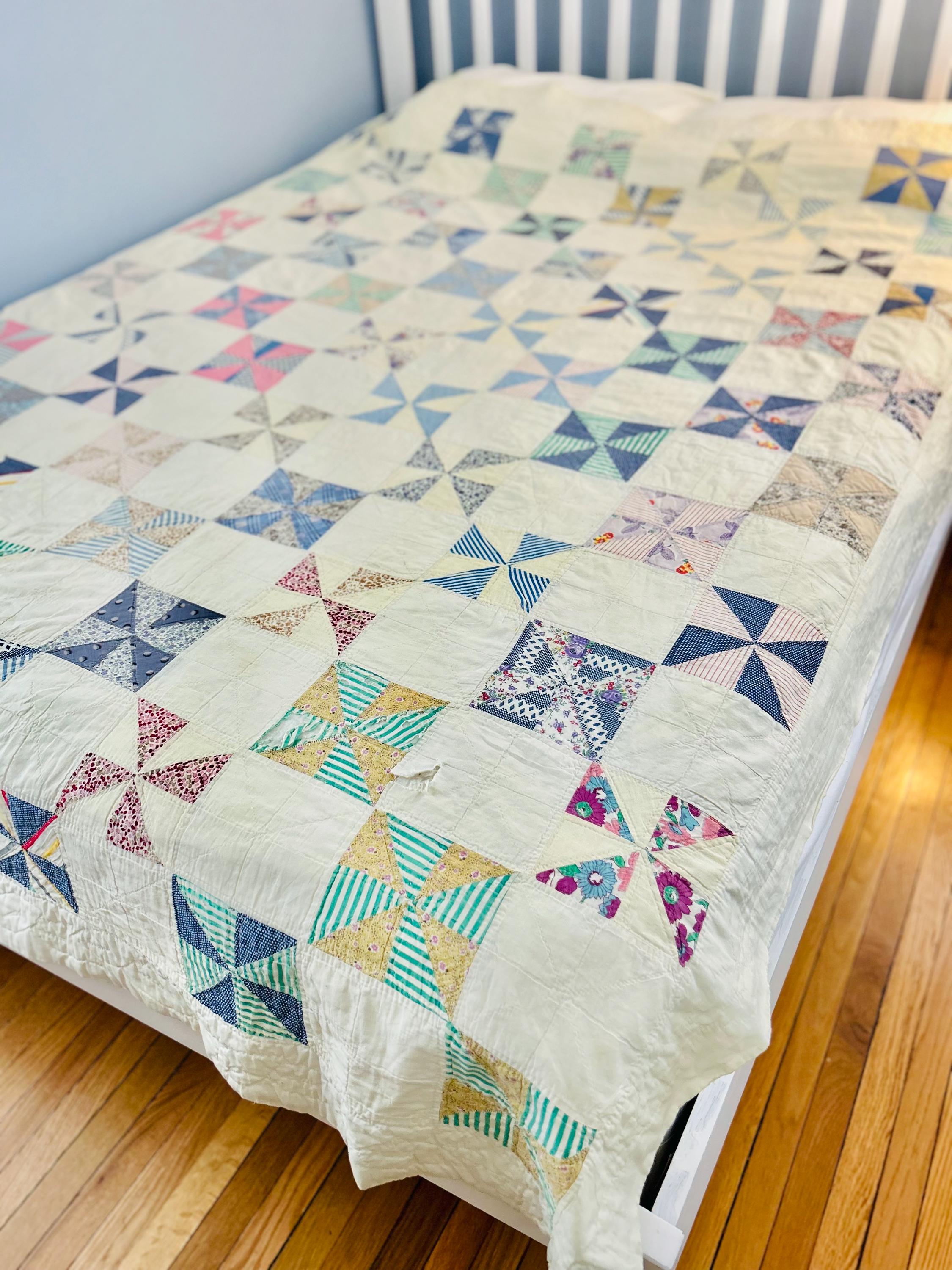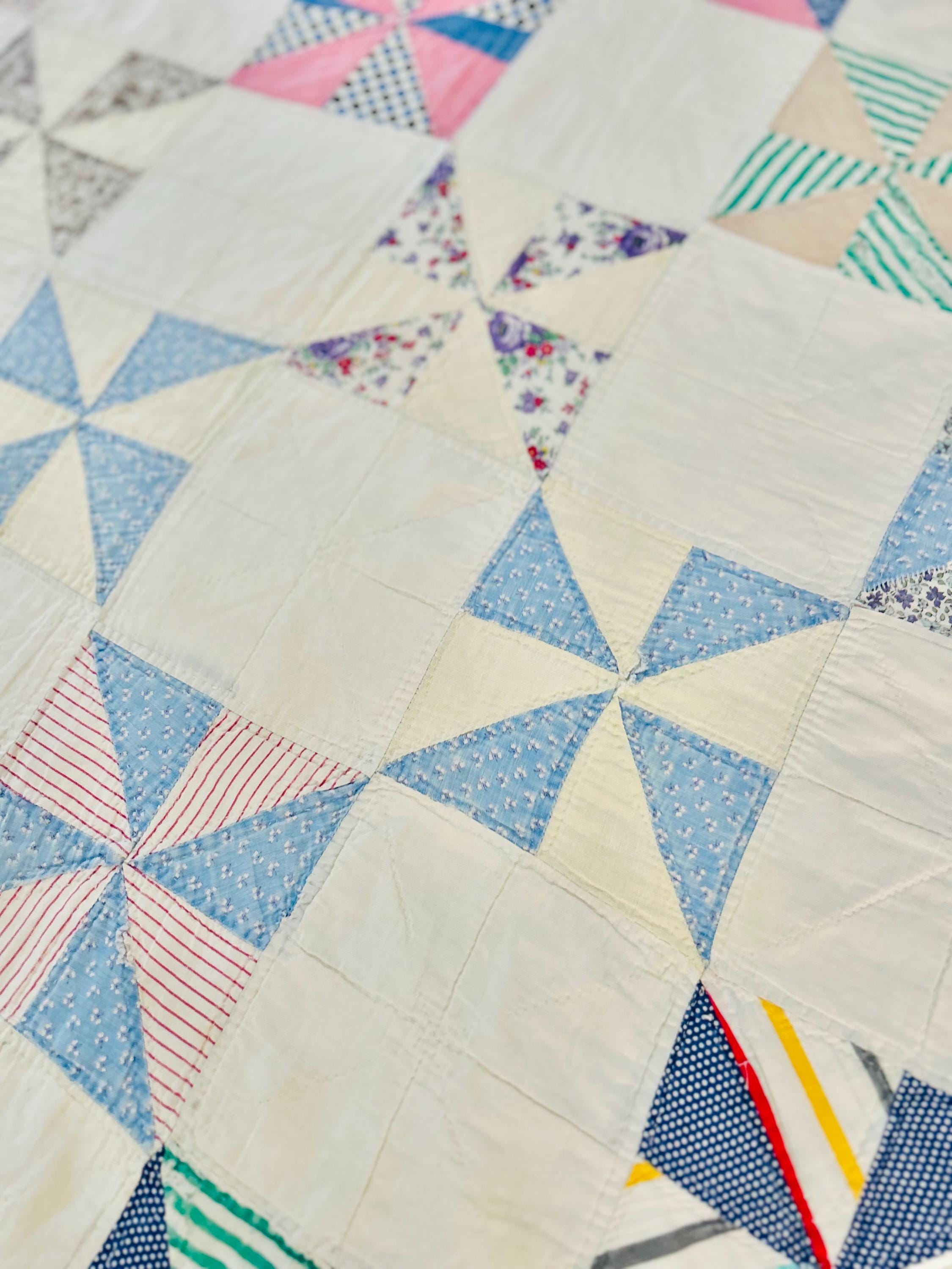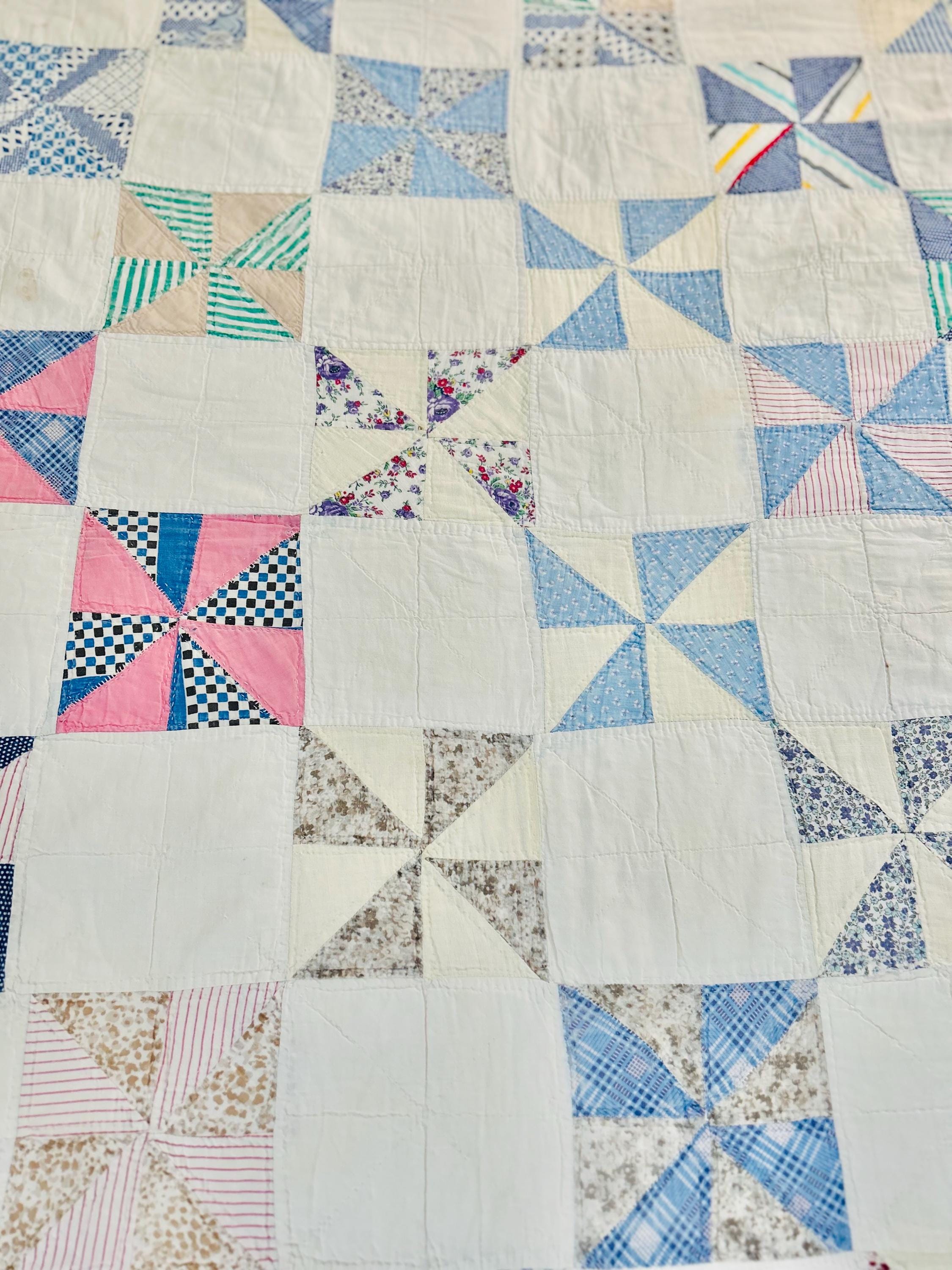 Details: • Pattern: Pinwheel / Broken Dishes variation • Date: circa 1920-1930s • Construction: Hand pieced, hand quilted • Materials: Cotton top, cotton backing, cotton batting • Colors: Indigo blue, green, yellow, pink, cream • Condition: Cutter or crafting condition due to age-related wear • Size: 62" x 82"