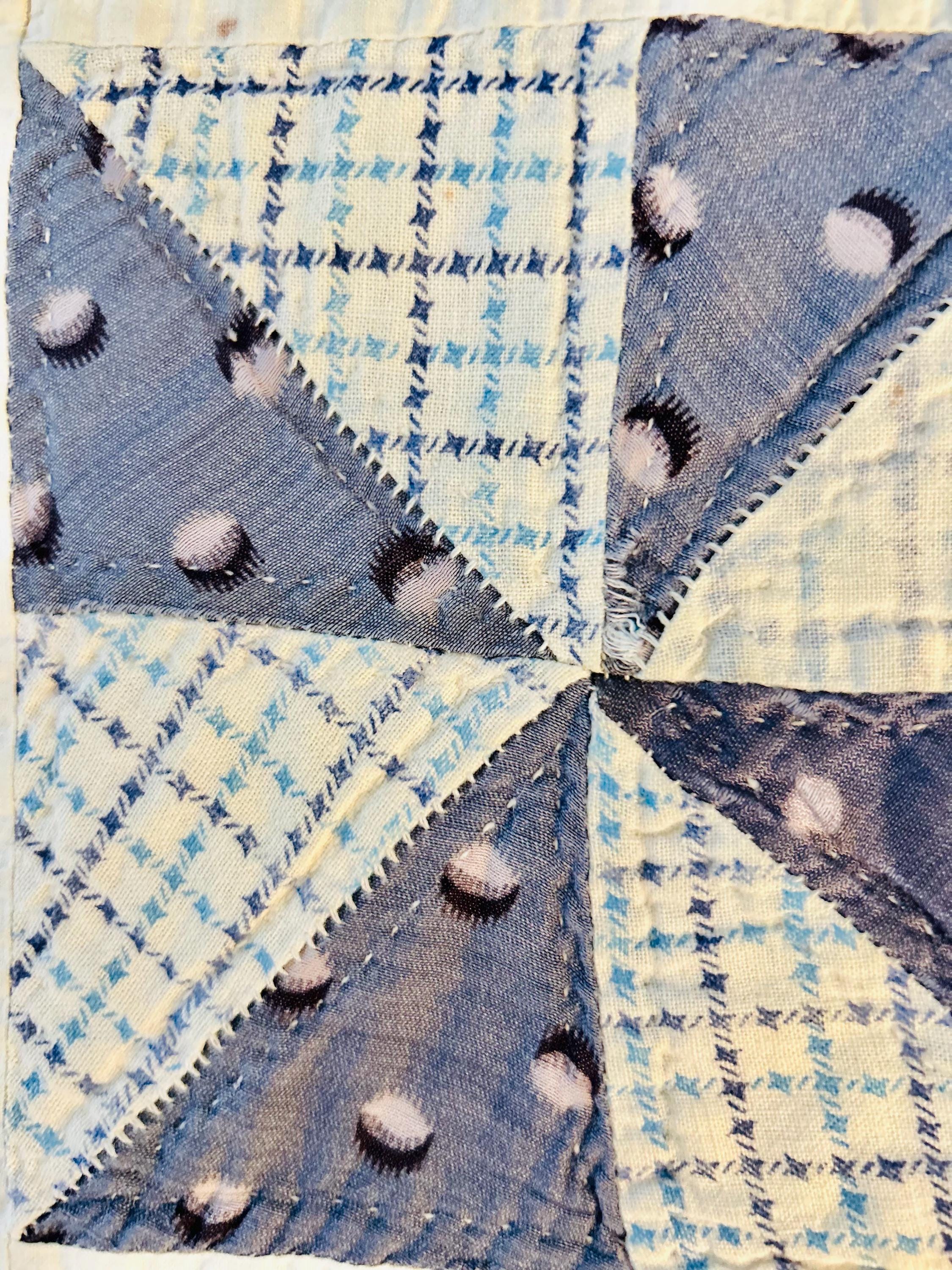A beautifully worn and authentic antique pinwheel quilt, hand pieced and hand quilted in the early 20th century, circa 1920-1930s. This quilt features classic pinwheel blocks set among plain cotton squares with a mix of indigo blues, shirting stripes, green patterns, small florals, and dotted prints. The hand-quilting is in outlines of the patchwork and in diagonals. Along the four-sided border the hand-quilting is in a unique chained-leaf pattern.