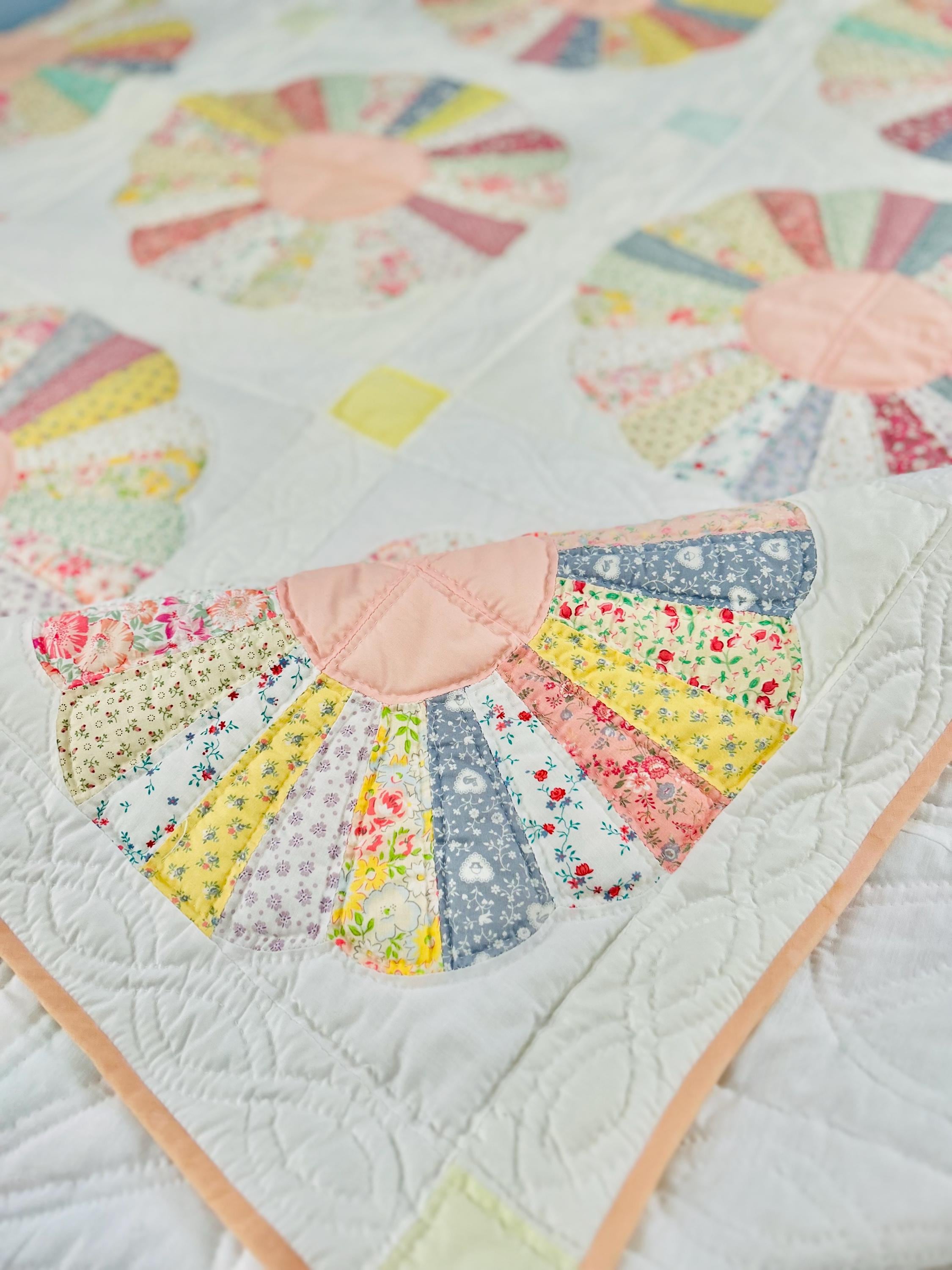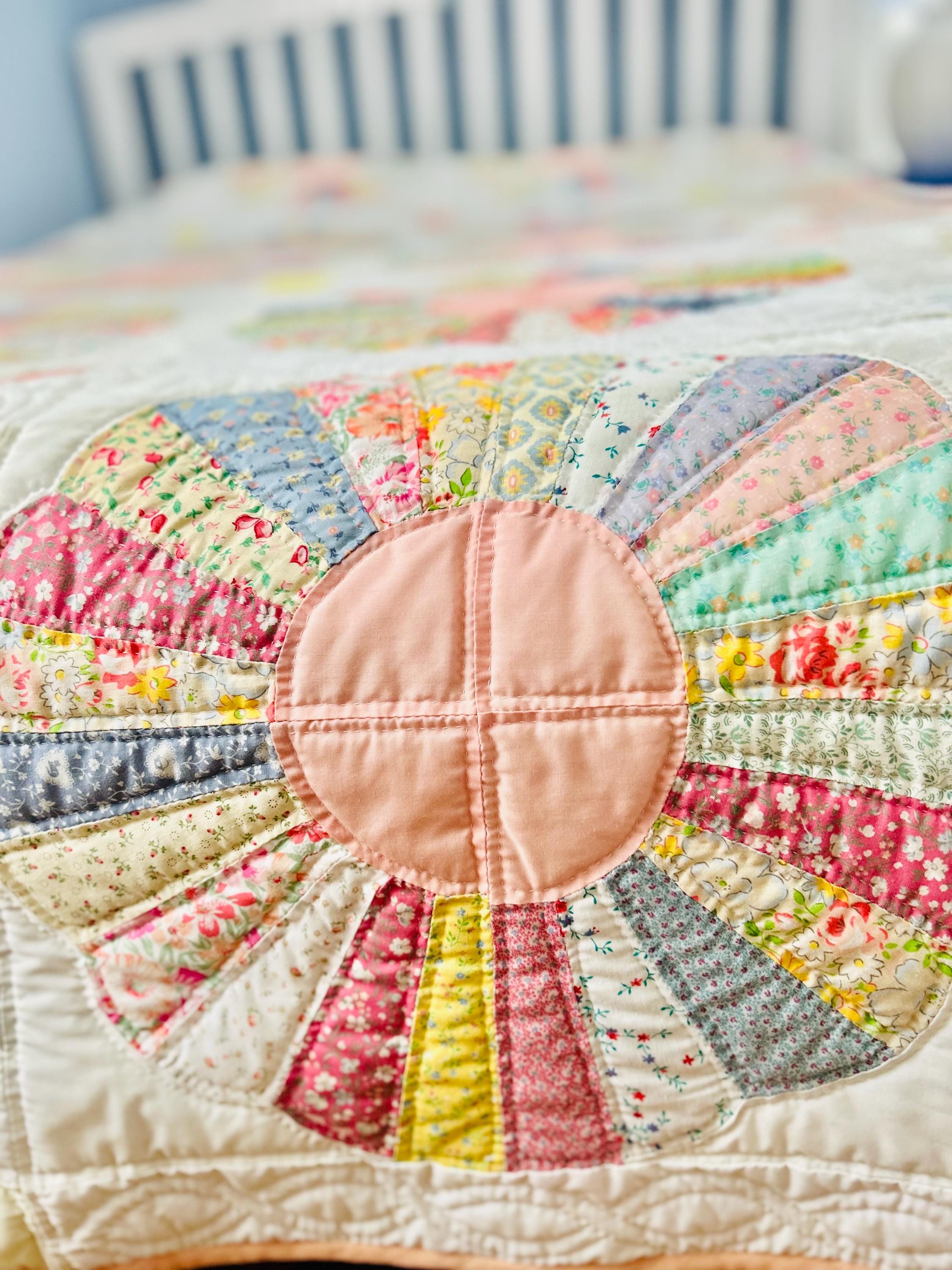 Details: • Pattern: Dresden Plate • Era: Circa 1930s (feedsack era) • Size: 75” x 94” • Fabrics: 1930s pastel cotton prints • Construction: Hand pieced, hand appliquéd, hand quilted • Condition: Excellent vintage condition; unused and never washed • Batting: Cotton, with good loft • Backing: Solid white cotton