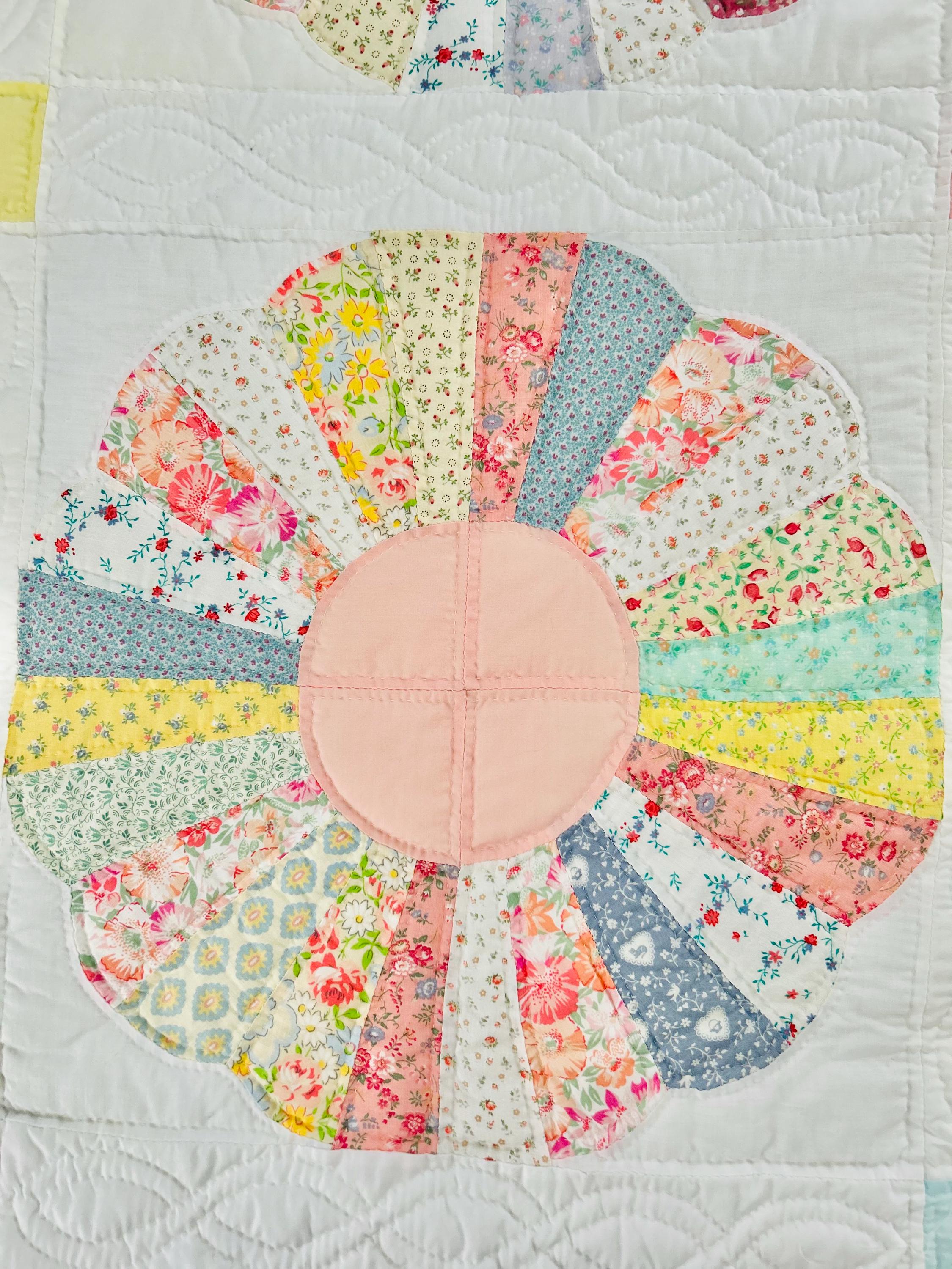 This exceptional vintage Dresden Plate quilt uses a fabric palette, print scale, and construction details characteristic of the Depression-era feedsack period with Dresden plates composed of 1930s cotton prints featuring soft pastels and small-scale florals typical of the era. Those fabrics include pale aqua, mint green, butter yellow, peach, rose, and light blue, all set against a crisp white background, a classic design choice of the 1930s that allowed pastel prints to stand out while creating a clean, cheerful overall appearance.