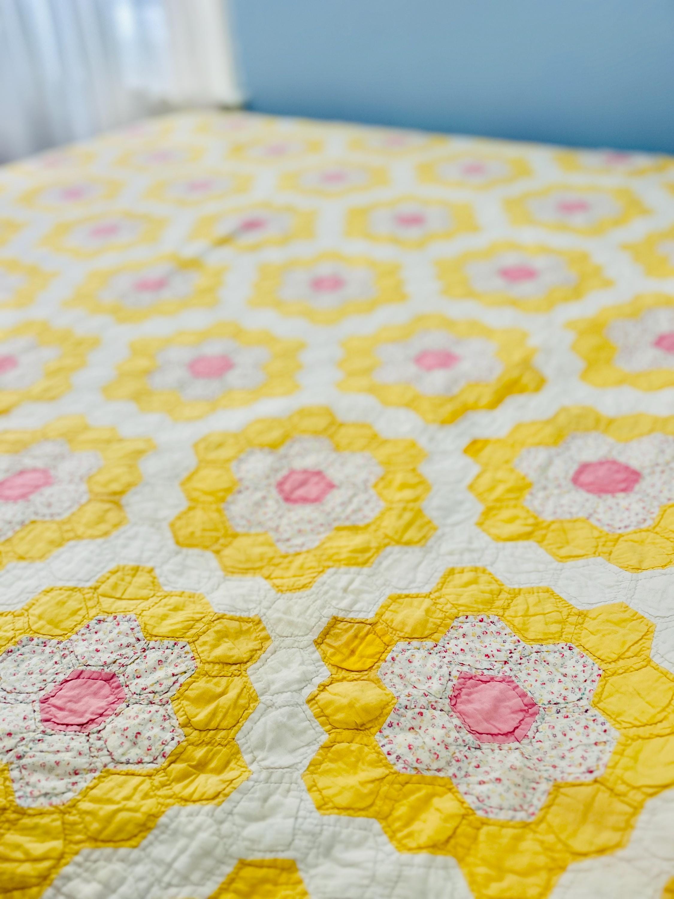 This is a beautiful yellow and pink 1930s Grandmother’s Flower Garden quilt that has been hand-pieced and hand-quilted. Made from more than one thousand small hexagons, this quilt features classic feedsack-era fabrics including sunny chrome yellows, soft blush pink centers, and delicate pastel florals. It has been meticulously hand-quilted in outlines of each hexagon.