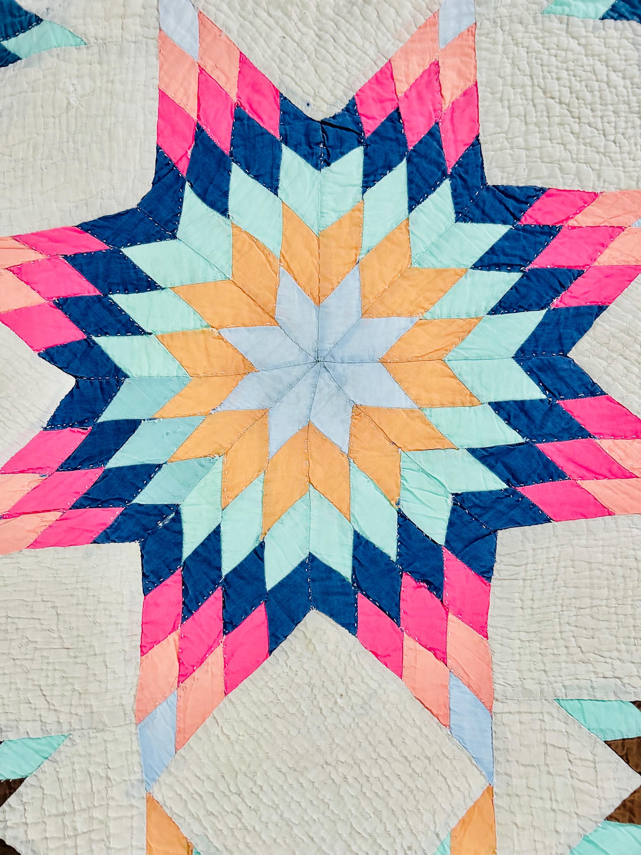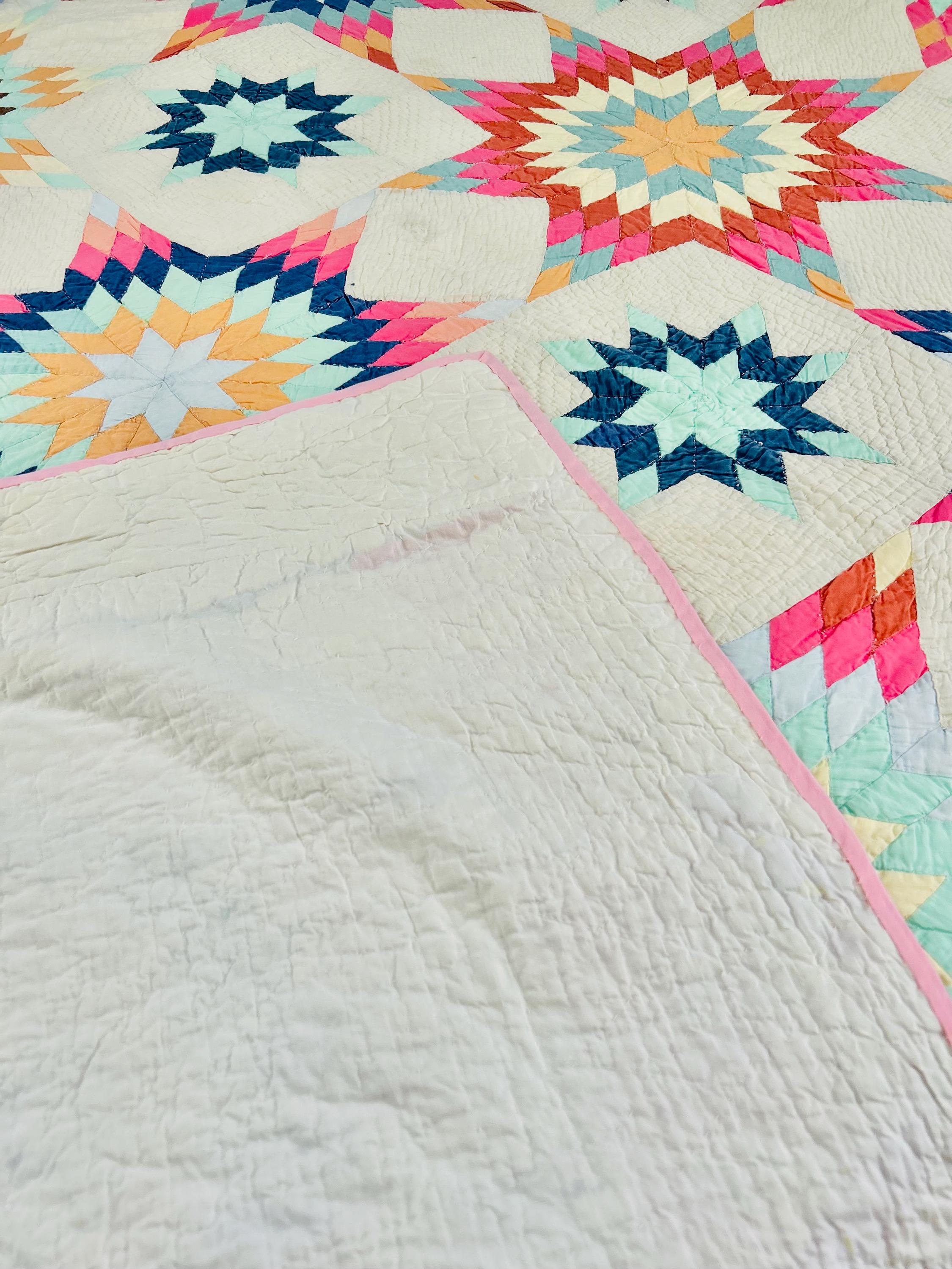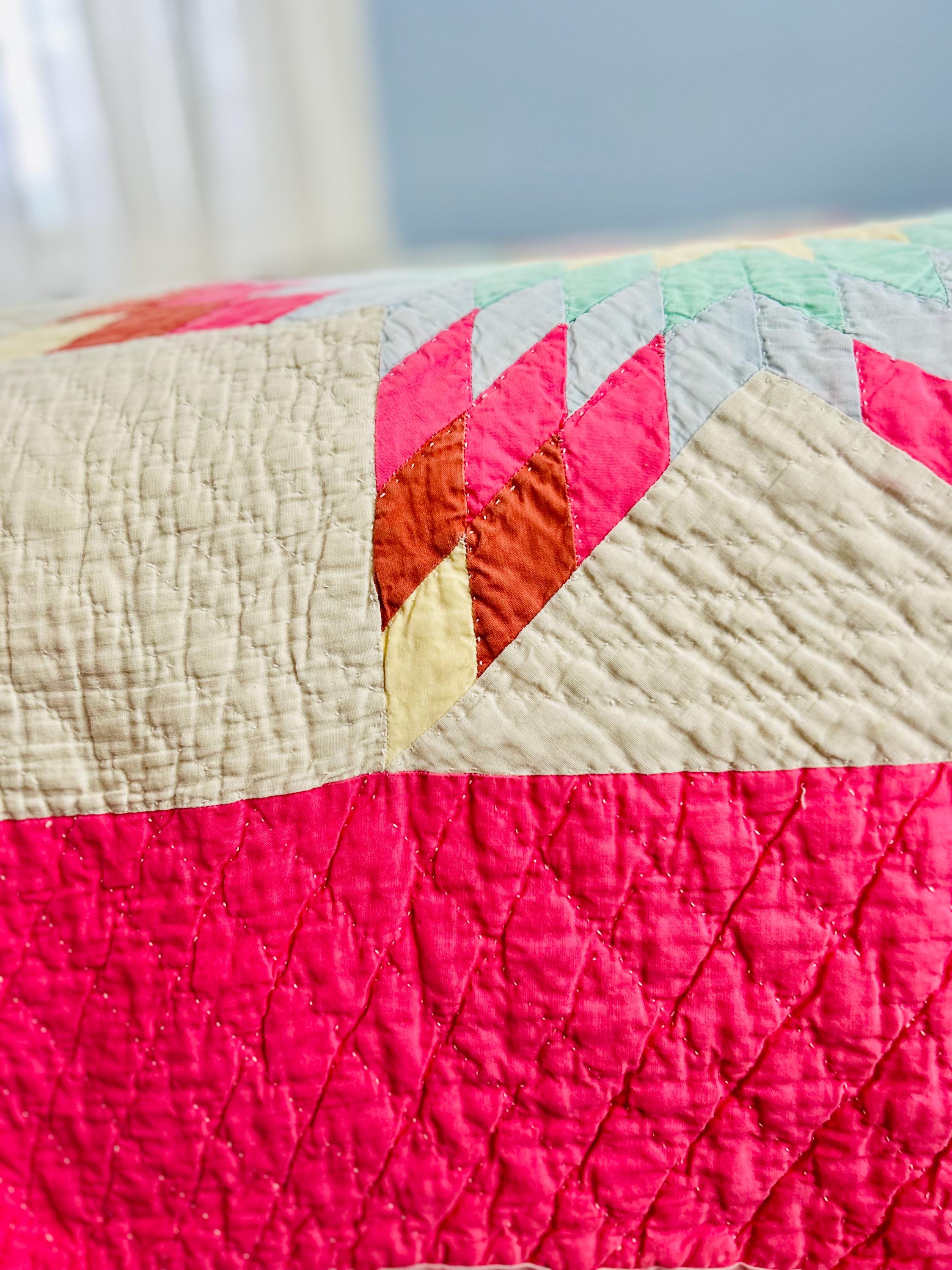 • Unusual radiating multiple-star composition, likely original to the maker • Hand pieced with small, precise components and sharp points • Hand quilted throughout, including selective stipple quilting in key areas • Stipple quilting is a labor-intensive technique rarely used in Depression-era quilts • Quilting adds depth, texture, and movement to the design