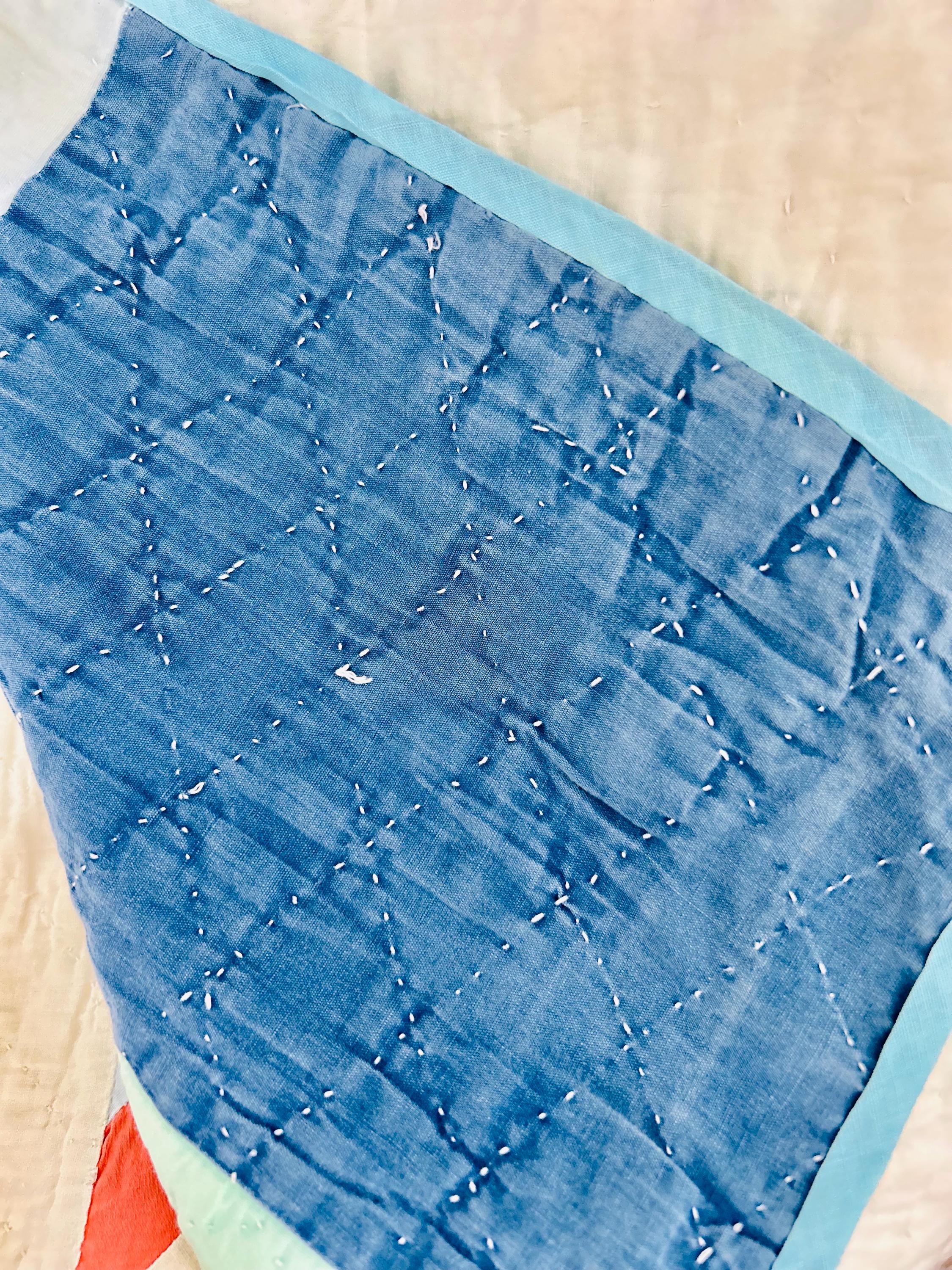 The back is white cotton while the binding is a mix of pink and blue cottons that have been machine stitched to the front and hand-stitched to the back. The cotton batting is unsized and lightweight.
