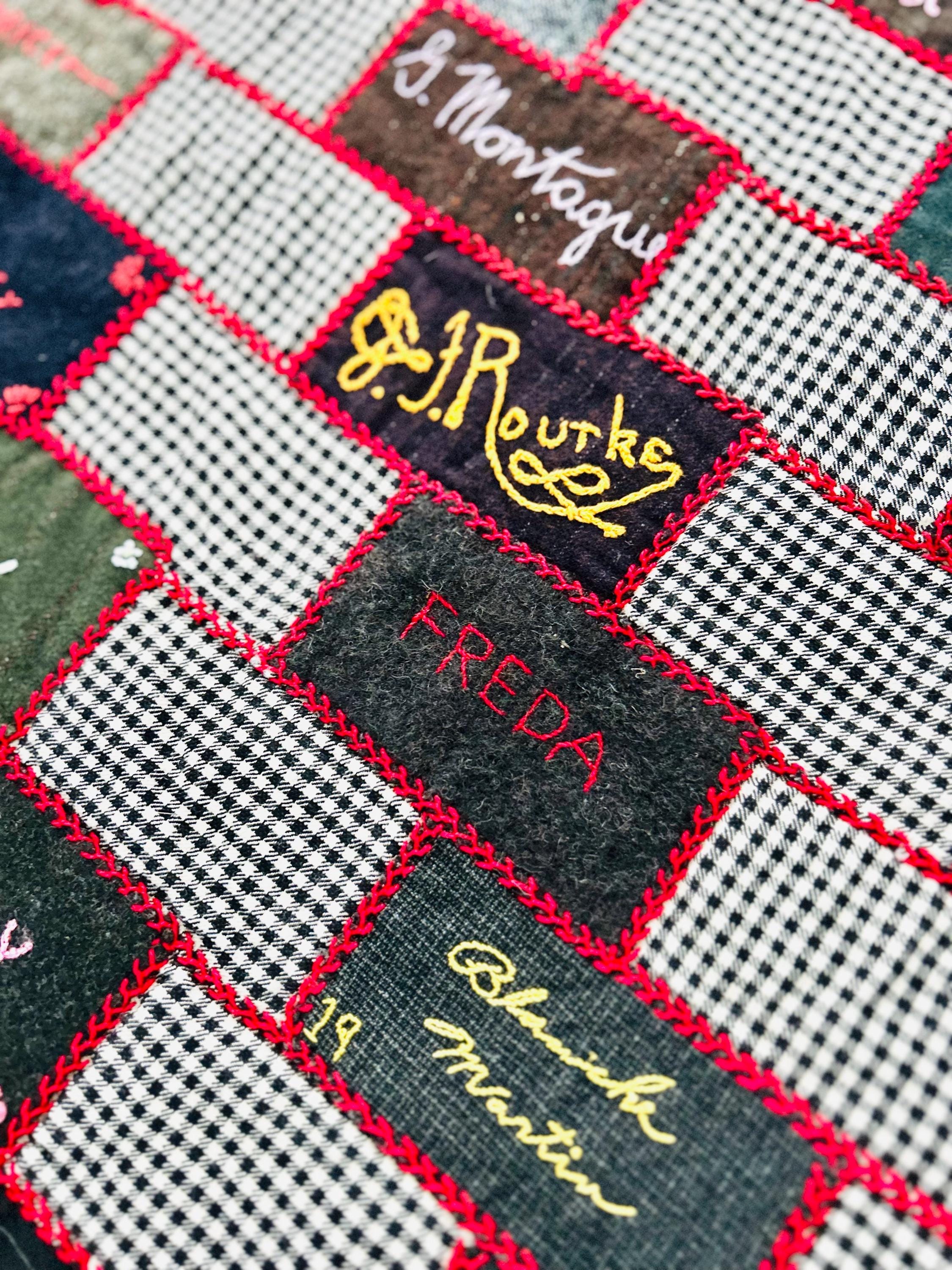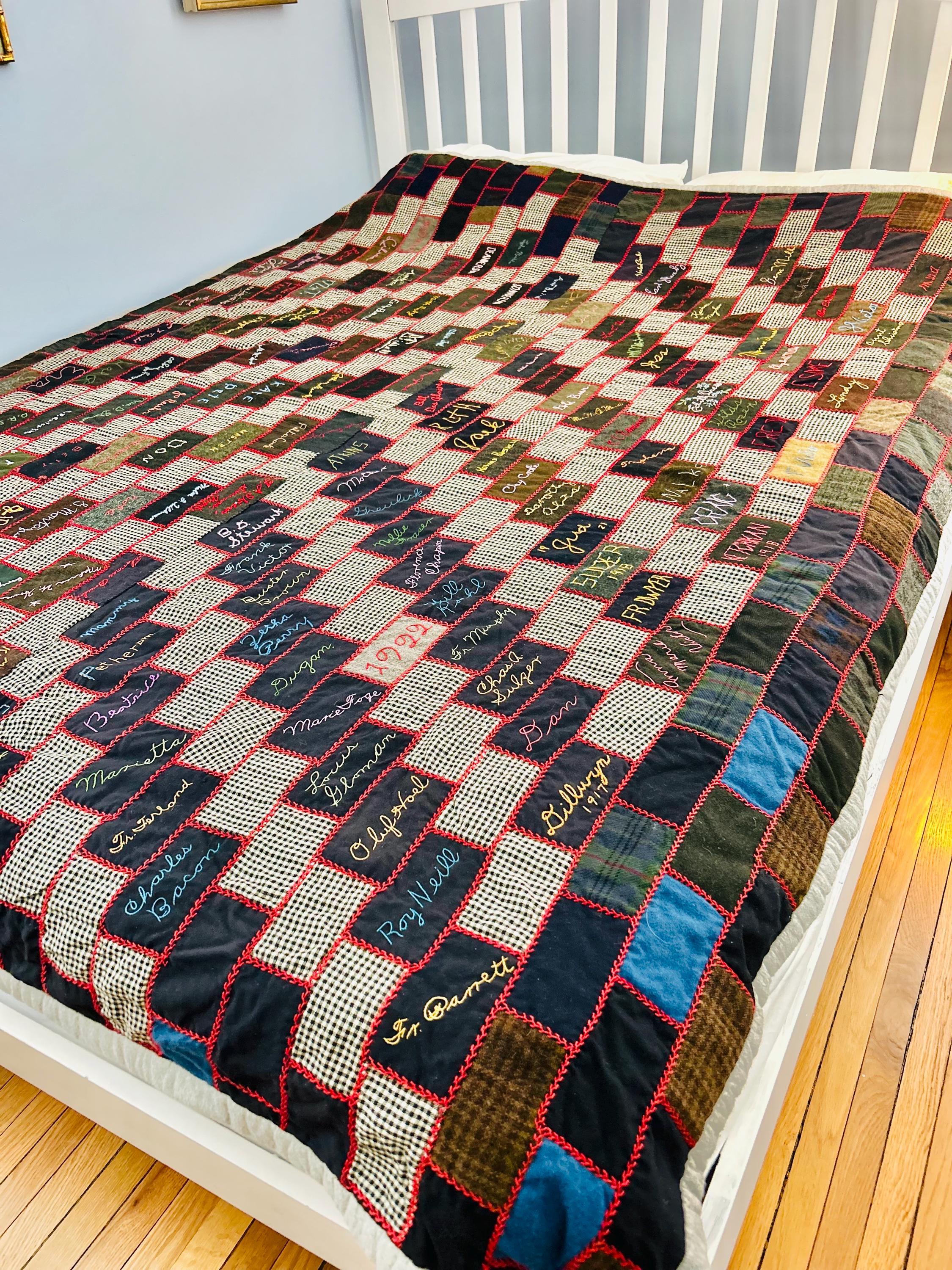 The quilt is composed of wool suiting fabrics—plaids, tweeds, houndstooth, and deep solids—many likely cut from men’s garments of the period. Each rectangular block is individually hand-embroidered with names, dates, and family identifiers, forming a vivid record of a close-knit community during and just after World War I. The blocks are joined with bold red embroidery, giving the quilt its striking graphic grid and unmistakable folk art presence.