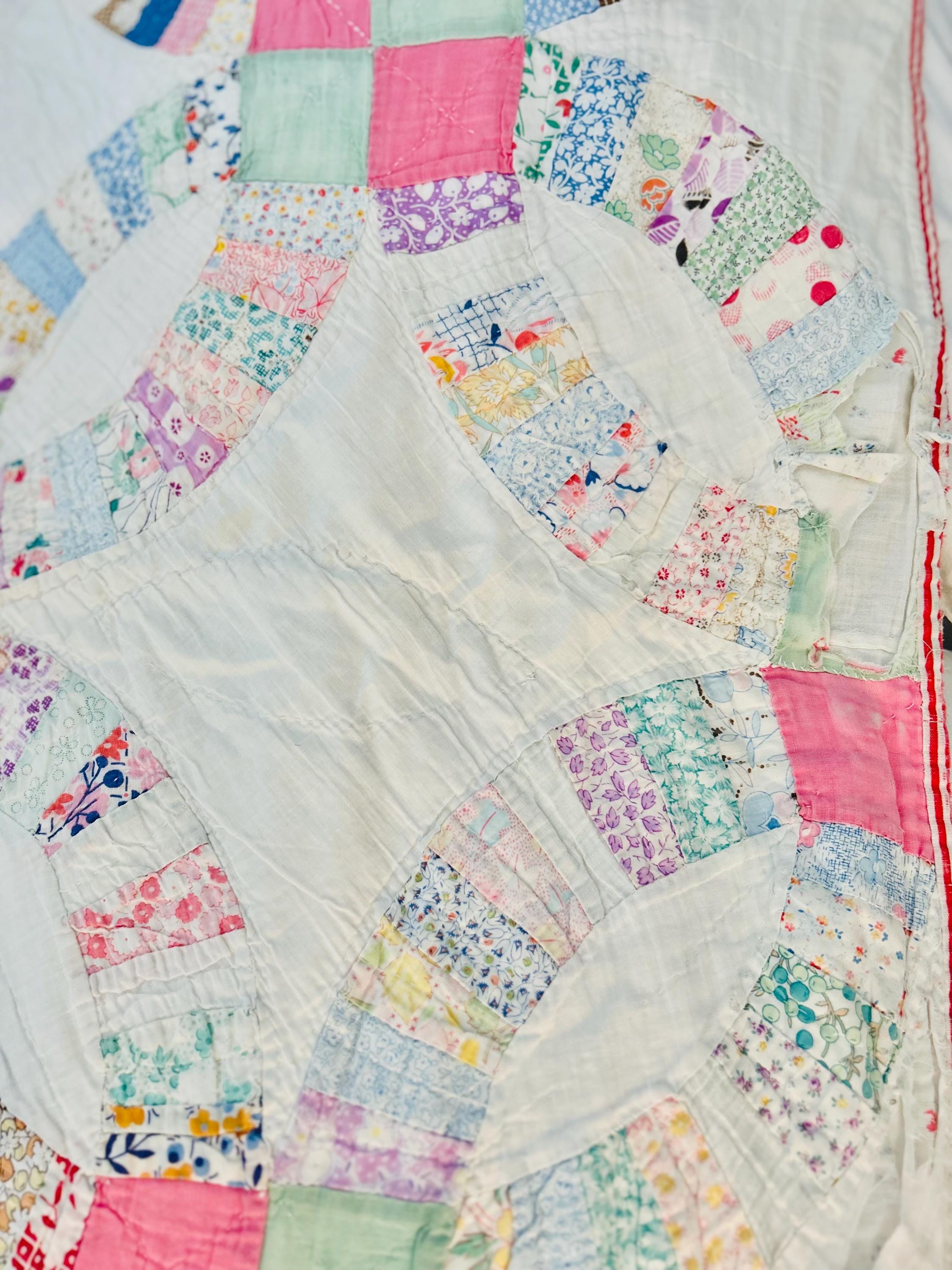 This is an antique Wedding Ring Quilt, dating to the early–mid 1930s, made during the Great Depression using a wide variety of period cotton scraps and feedsack fabrics.