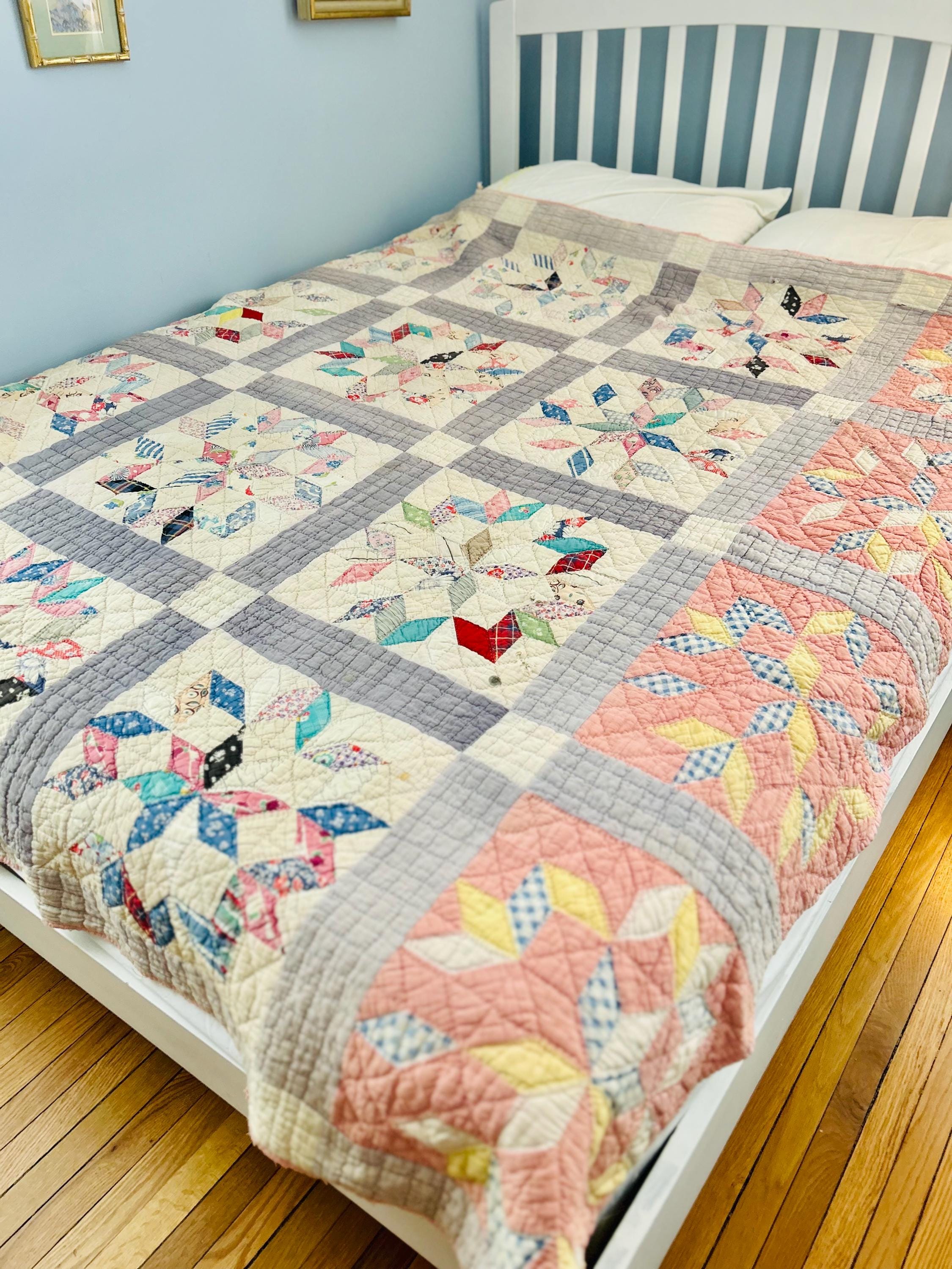Details: • Pattern: Dutch Tile / Arabian Star • Date: circa 1900–1920 • Construction: Hand pieced and hand quilted • Materials: Cotton fabrics with cotton batting • Condition: Cutter condition for the reasons outlined above • Size: 68"x76"